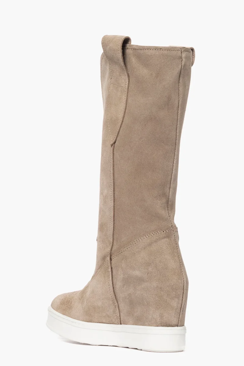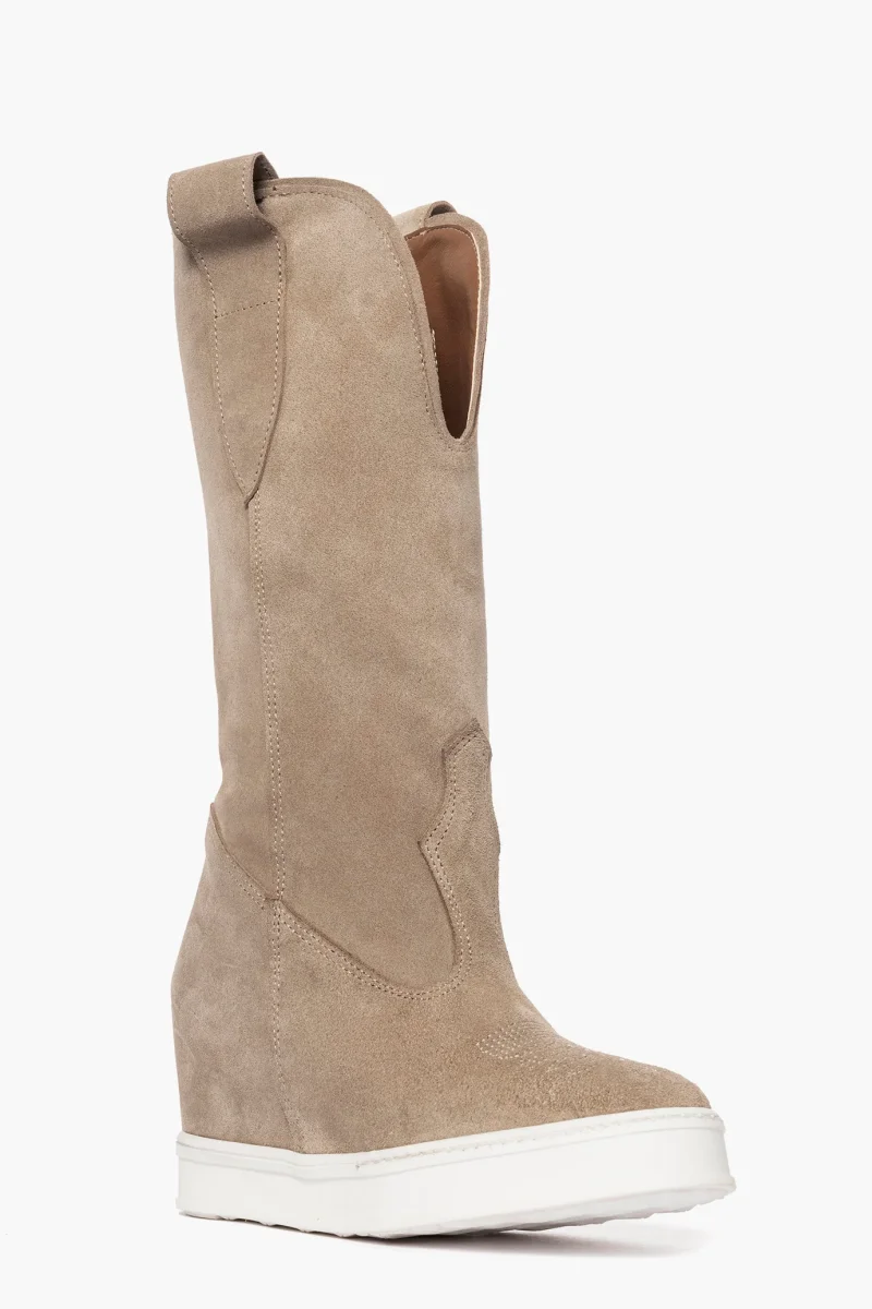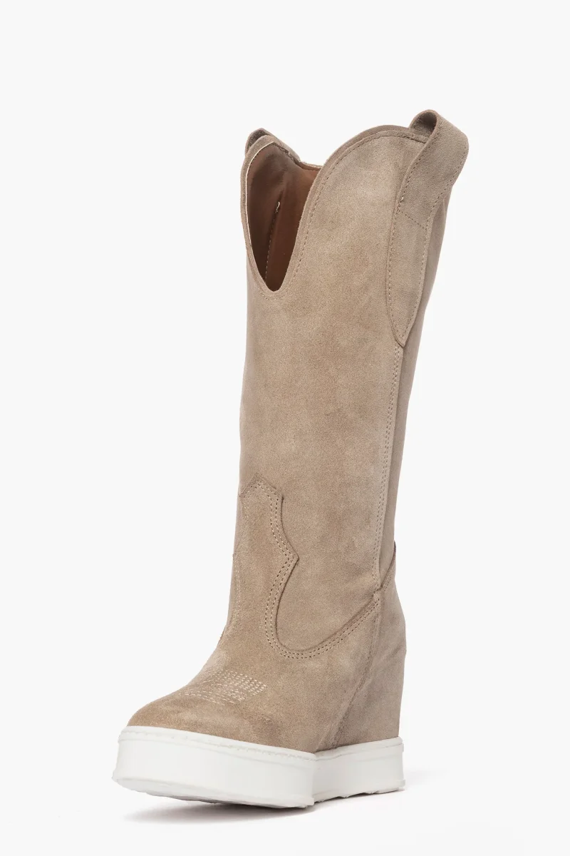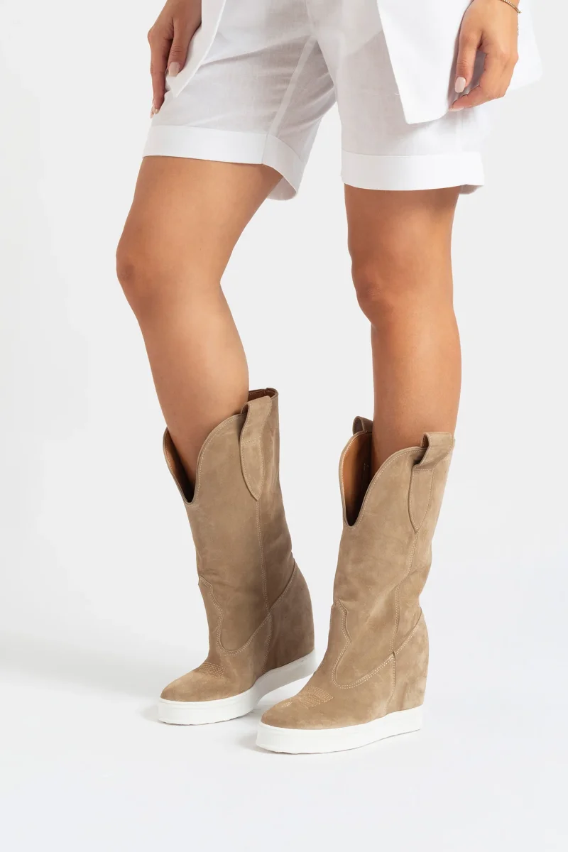 Stivali rialzo interno in camoscio taupe, ricamo in punta, Full 288 Up, interni e sottopiede in similpelle, calzano comode, privo di cerniera, forma tubolare, suola in gomma bianca, altezza totale 10 cm. Calzature realizzate in modo artigianale rigorosamente Made in Italy.