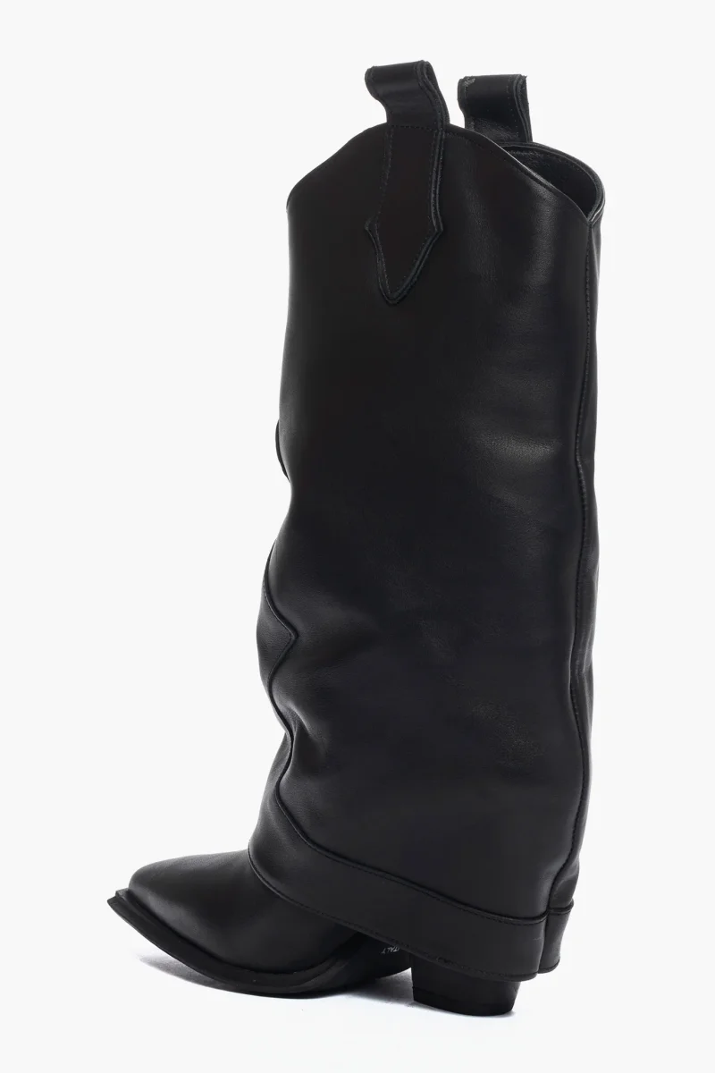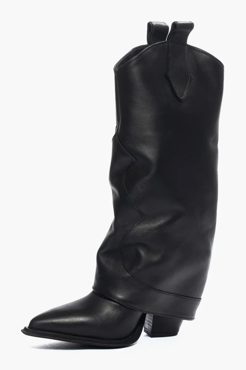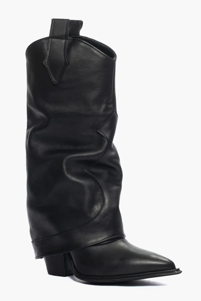 Stivali al polpaccio in pelle nero con risvolto, tacco nel colore nero, altezza 9 cm, privo di cerniera. Interni e sottopiede in similpelle nero. Calzata regolare, punta leggermente stretta, forma texana. Calzature realizzate in modo artigianale, rigorosamente Made in Italy.