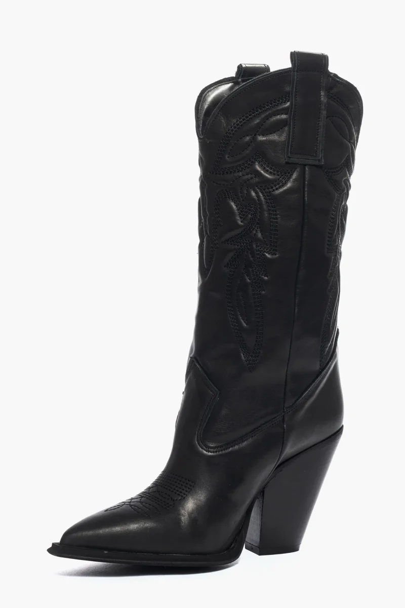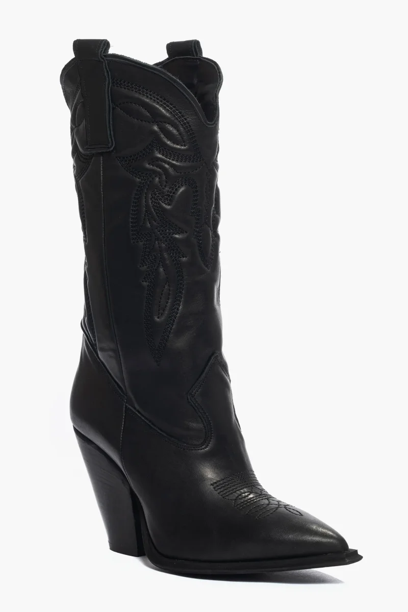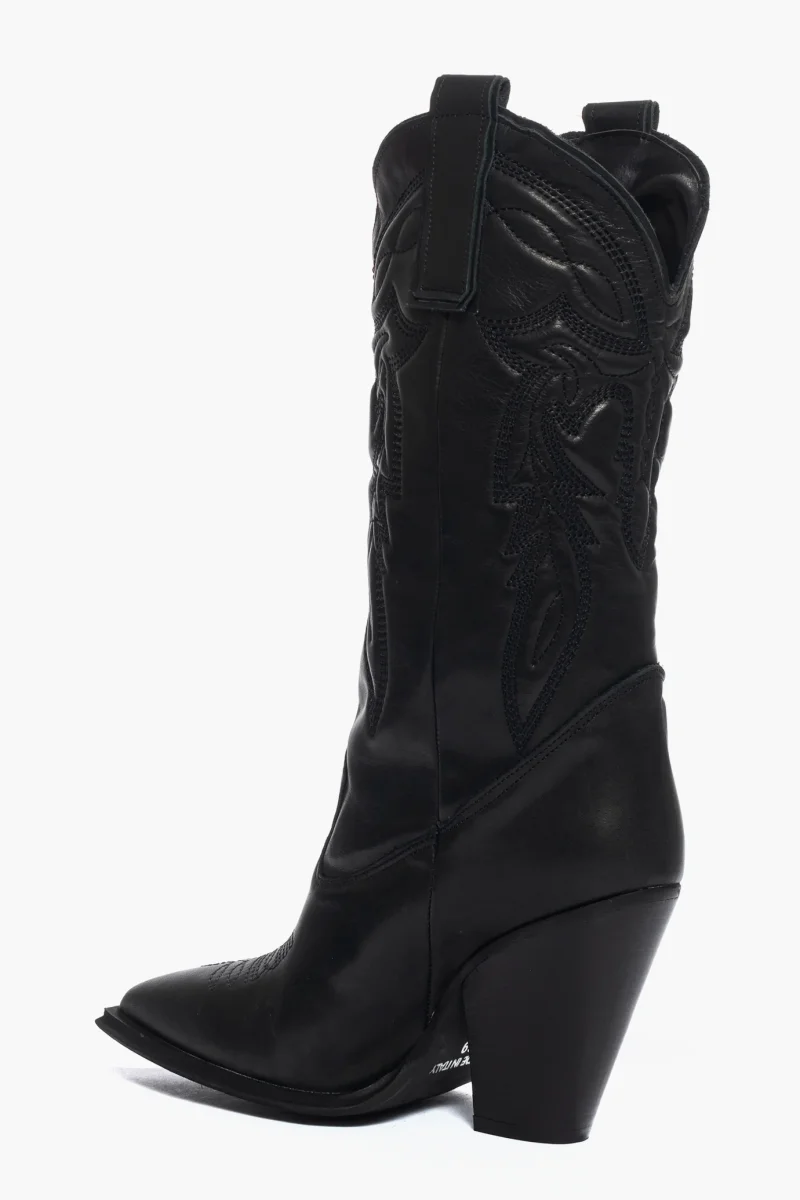 Stivali al polpaccio in pelle nero con ricamo in tinta, spazzolato, suola in thunit nera, altezza 9 cm. Interni e sottopiede in similpelle, privo di cerniera. Calzata regolare, forma texana. Calzature realizzate in modo artigianale, rigorosamente made in Italy.