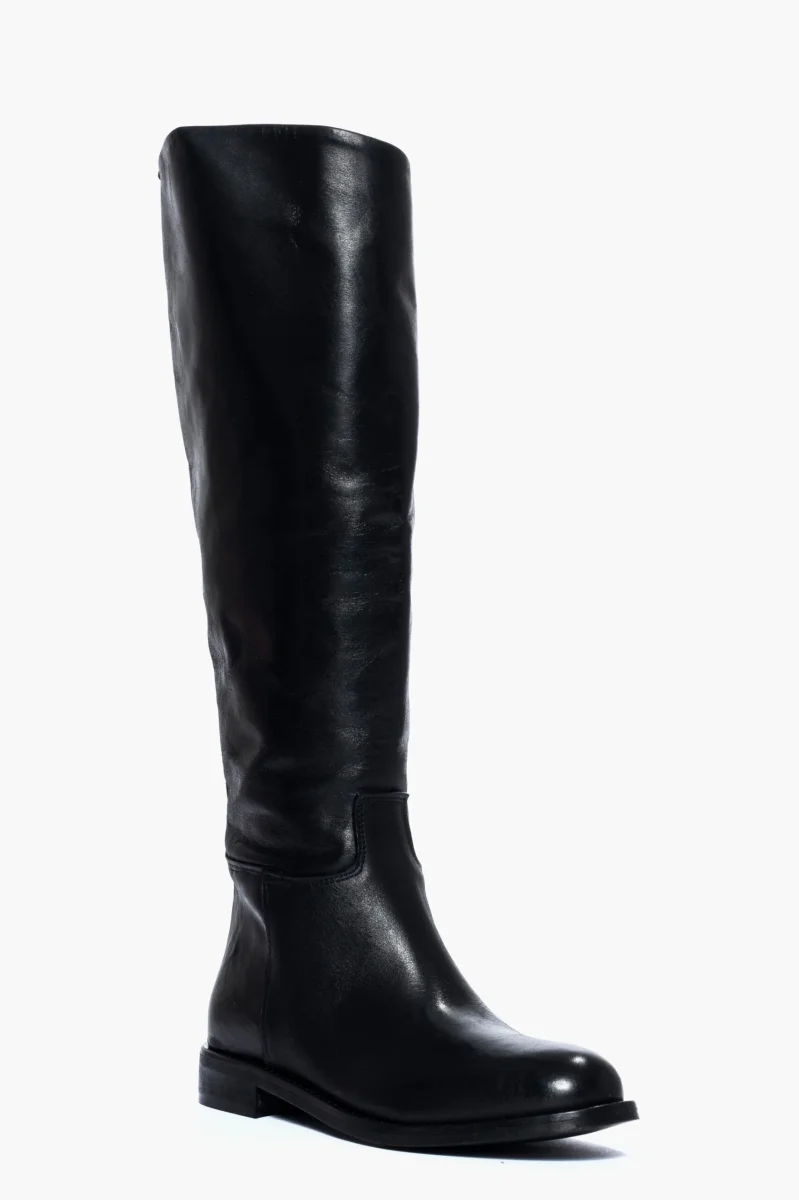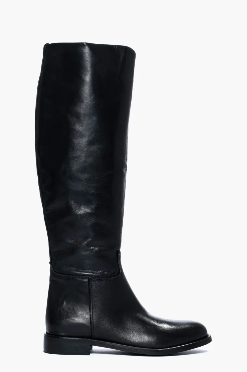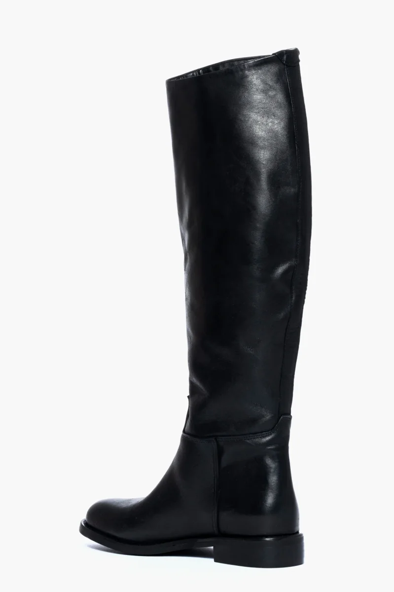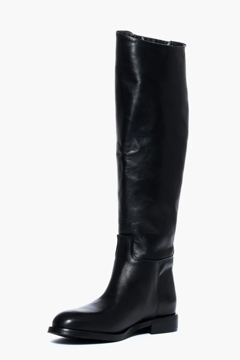 Stivale modello cavallerizza, sotto al ginocchio in pelle nero, punta rotonda, tubolari, privi di cerniera. Calzano regolari, interni in similpelle.