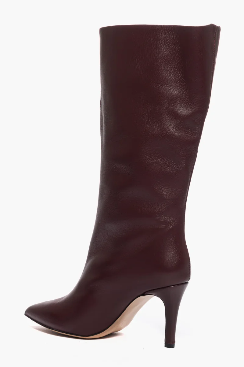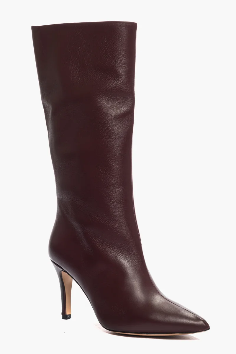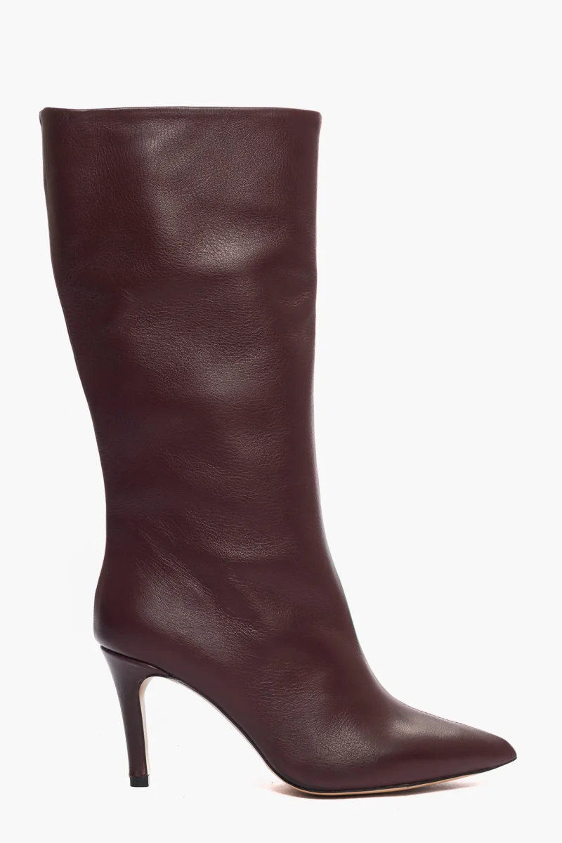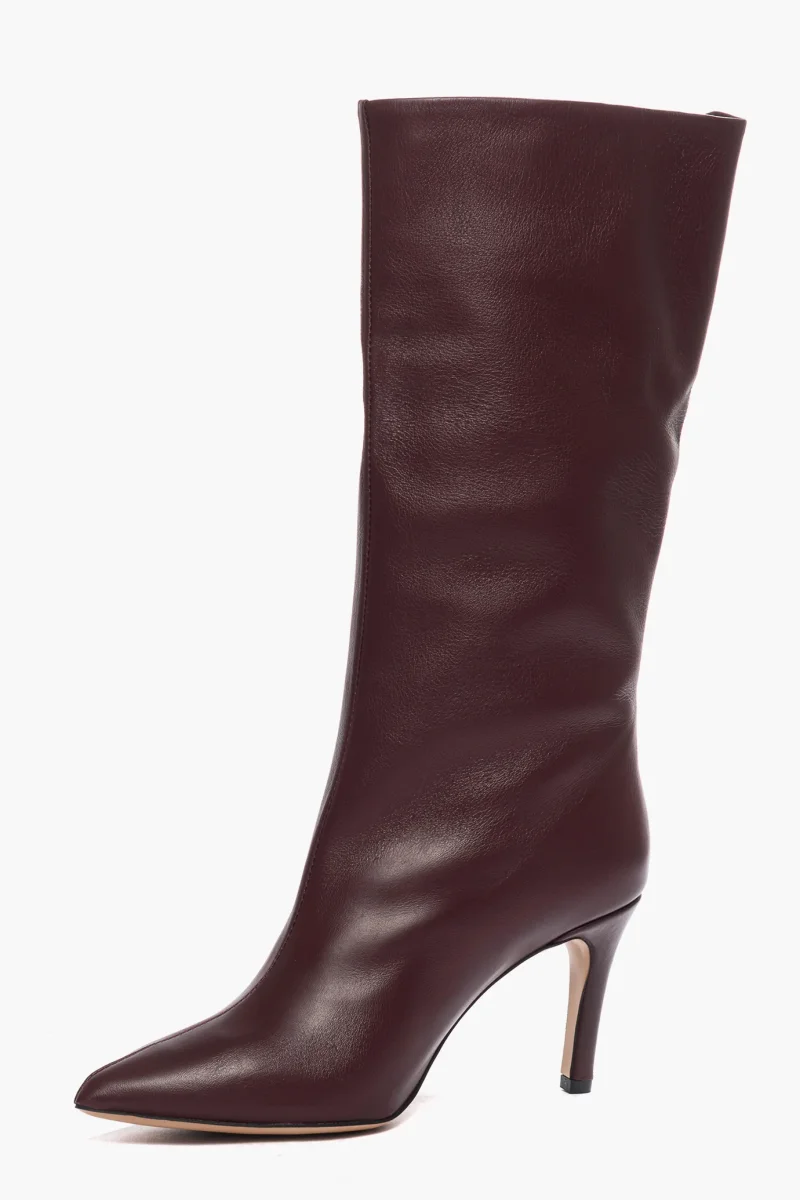 Stivale al polpaccio in pelle bordeaux, interni e sottopiede in similpelle, privo di cerniera, tacco rivestito in pelle bordeaux, altezza 8. Calzano giuste, punta stretta. Calzature realizzate in modo artigianale, rigorosamente Made in Italy.