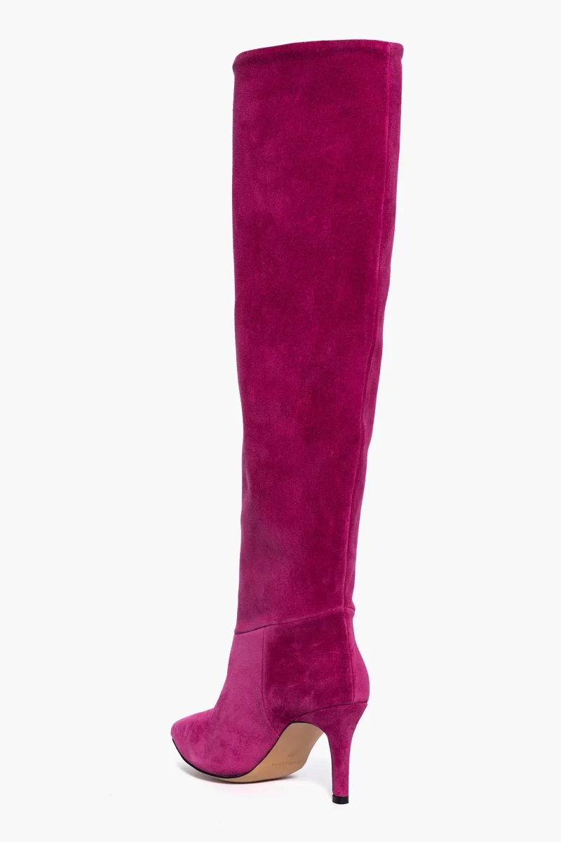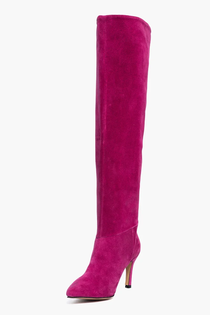 Stivali alti al ginocchio in camoscio fucsia. Interni e sottopiede in similpelle, privo di cerniera, tacco rivestito in camoscio fucsia, altezza 8cm. Calzata giusta, punta stretta, taglia italiana. Calzature realizzate in modo artigianale, rigorosamente Made in Italy.