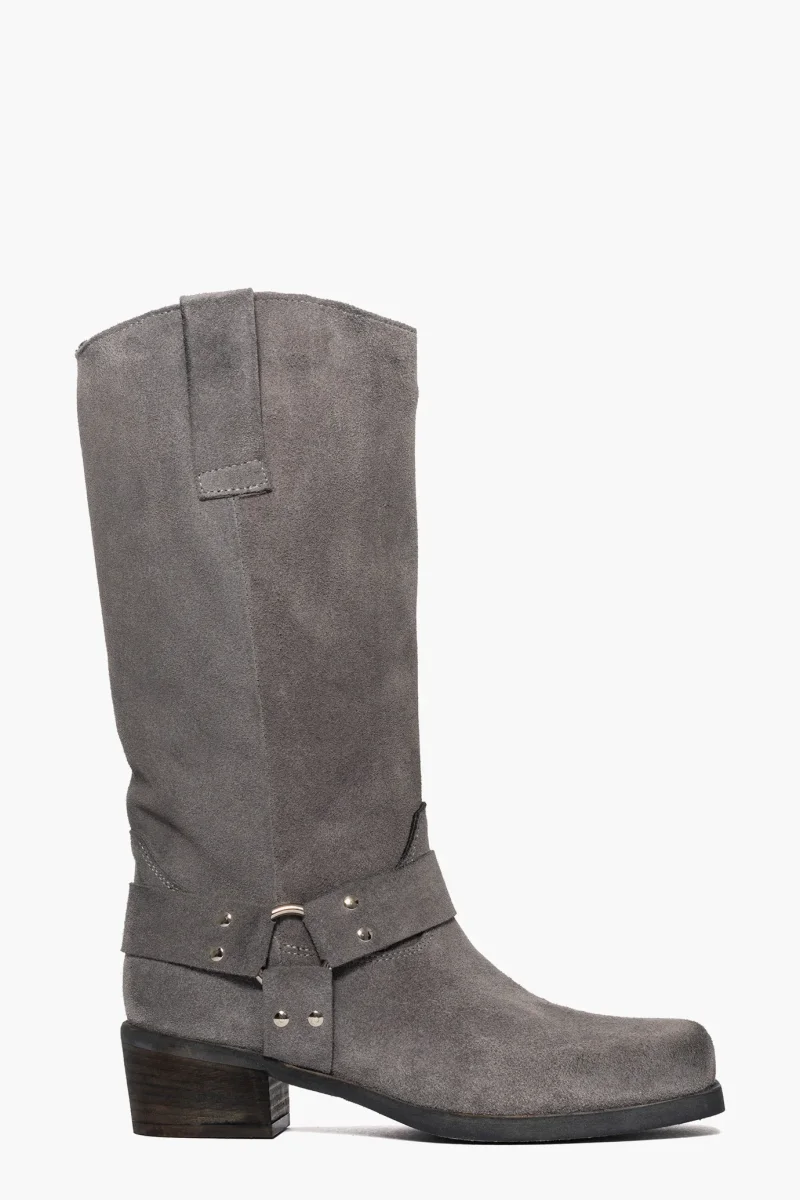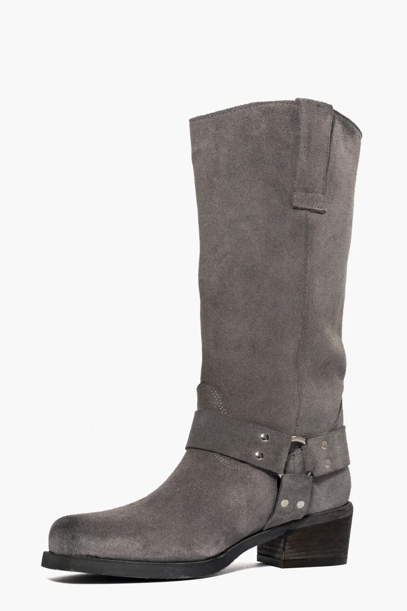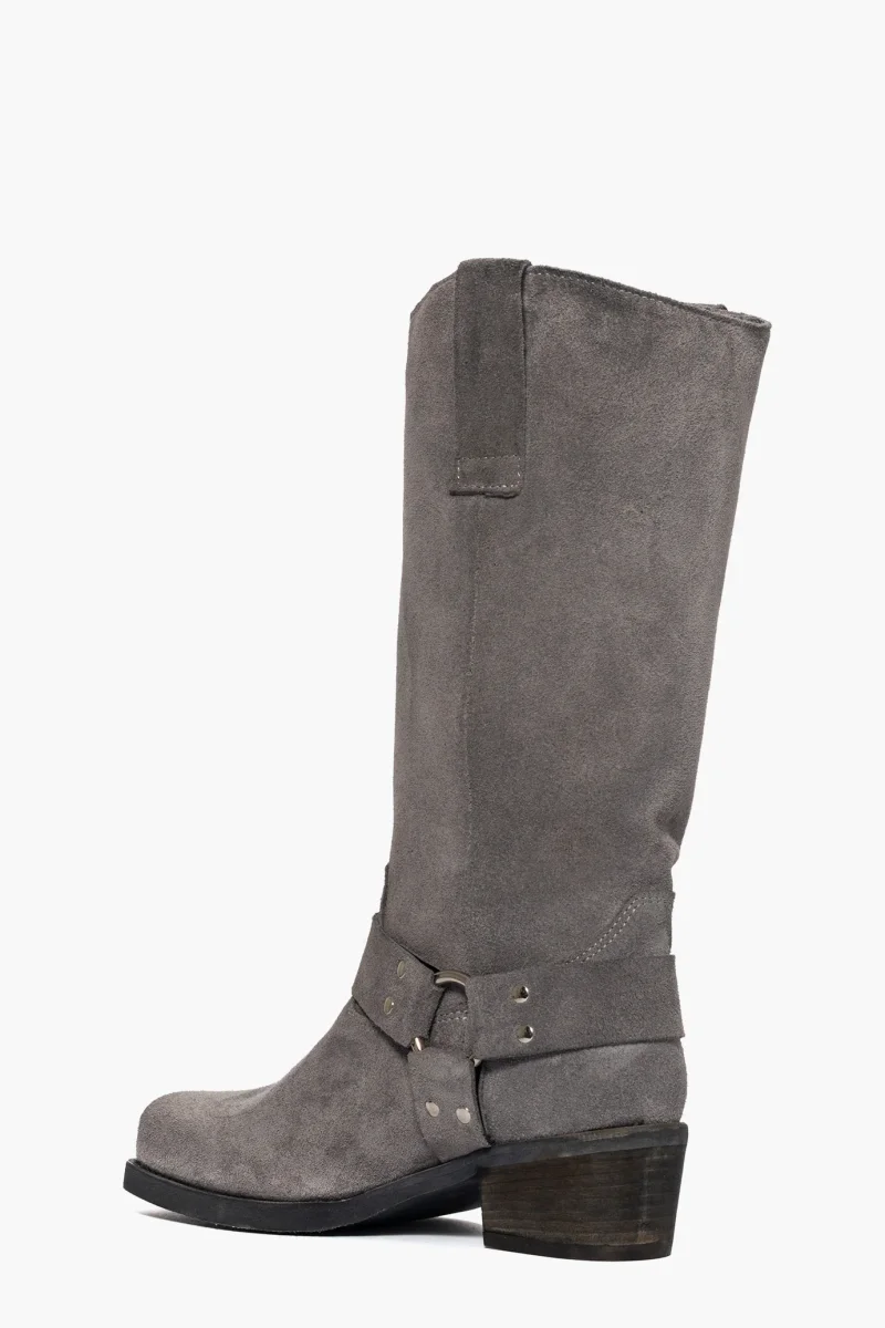 Stivali Gioele in camoscio grigio con punta quadrata, interni e sottopiede in similpelle, tacco 5 cm. Calata regolare. Calzature realizzate artigianalmente, rigorosamente Made in Italy.