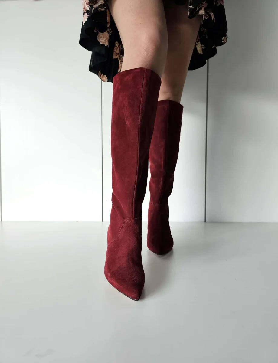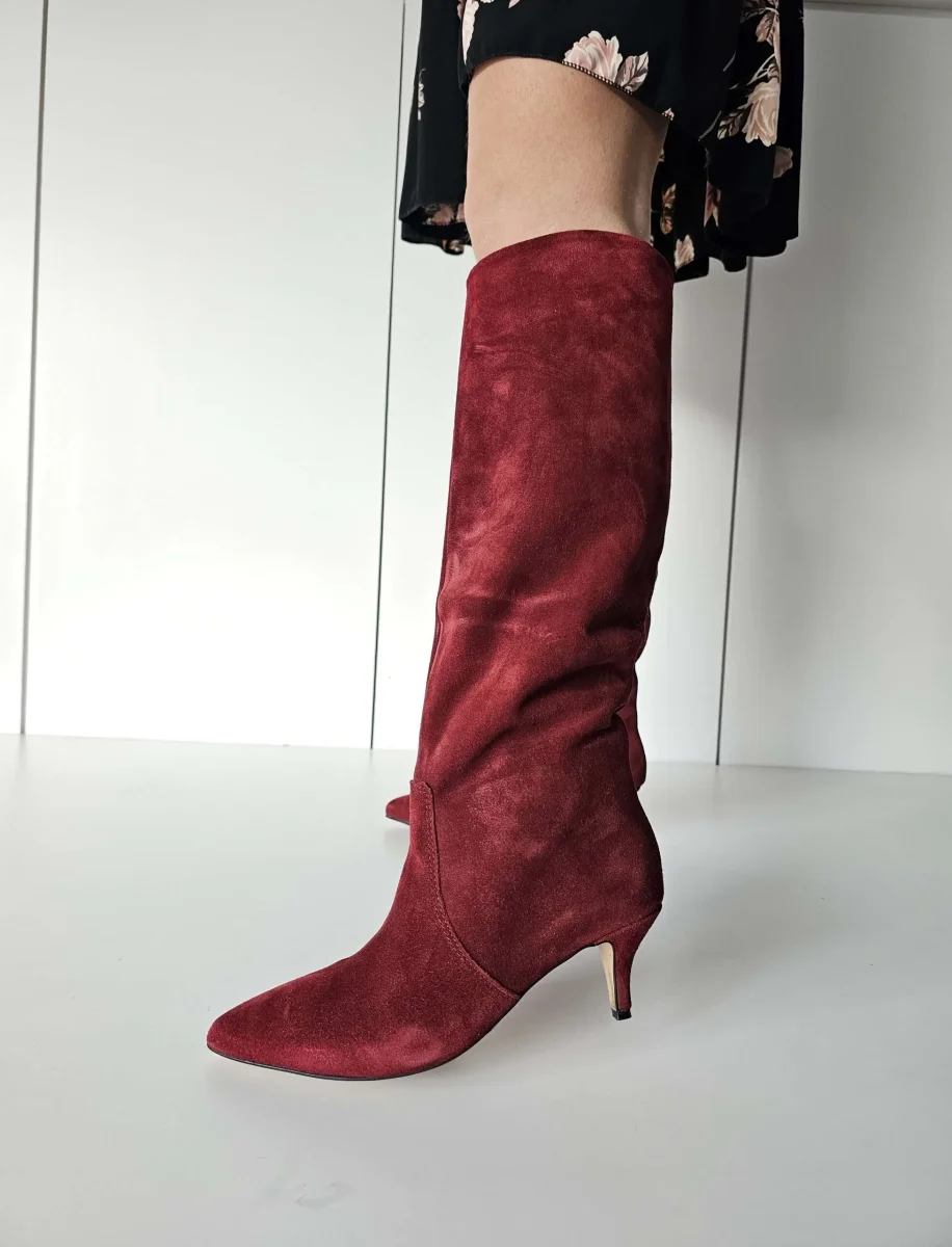 Stivale in camoscio bordeaux al ginocchio, interni e sottopiede in similpelle, privo di cerniera, tacco rivestito, altezza 6 cm. Calzano giuste, punta stretta. Calzature realizzate in modo artigianale, rigorosamente Made in Italy.