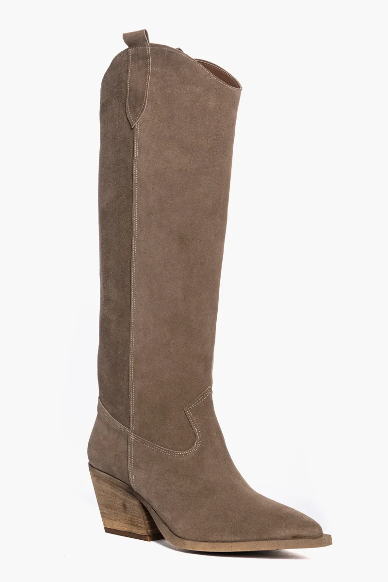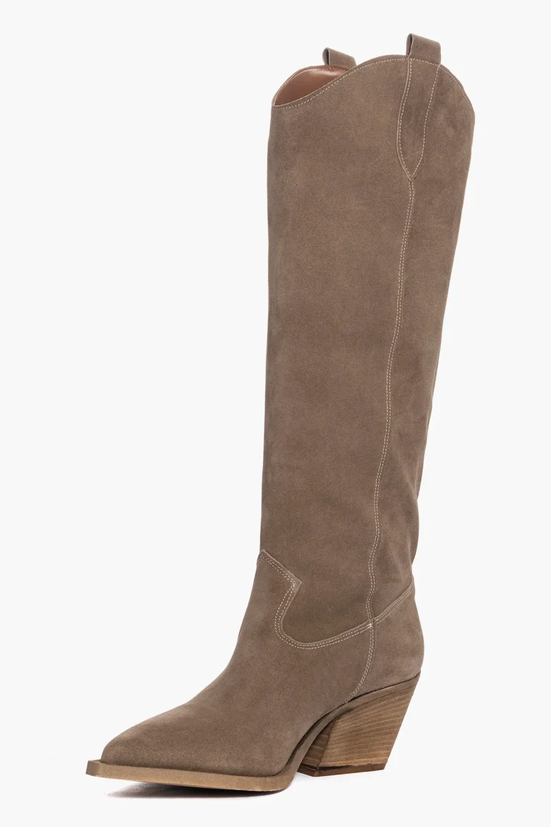 Stivali sotto al ginocchio in camoscio taupe, interni e sottopiede in similpelle. Suola nel colore neutro spazzolata in tinta, altezza 7 cm. Calzata giusta, punta stretta, privo di cerniera, forma texana. Calzature realizzate in modo artigianale, rigorosamente Made in Italy.