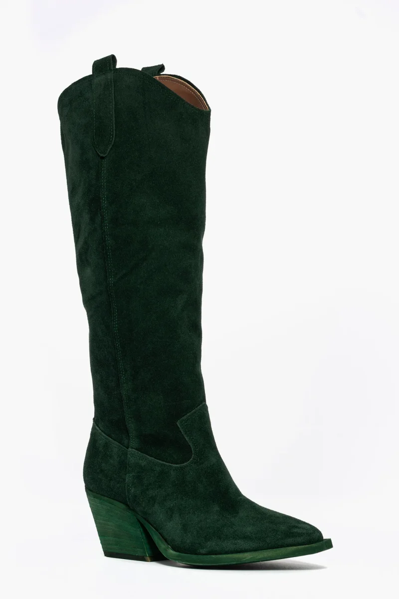 Stivali sotto al ginocchio in camoscio verde, interni e sottopiede in similpelle, suola nel colore neutro spazzolato, altezza 7 cm. Punta leggermente stretta in avanti, calzata giusta, modello texano. Calzature realizzate in modo artigianale, rigorosamente Made in Italy.