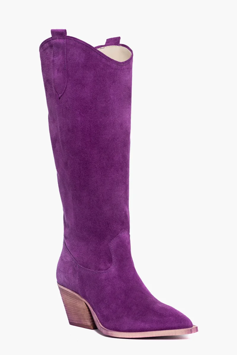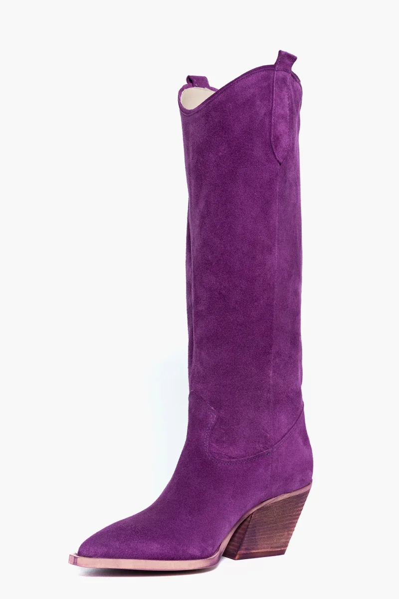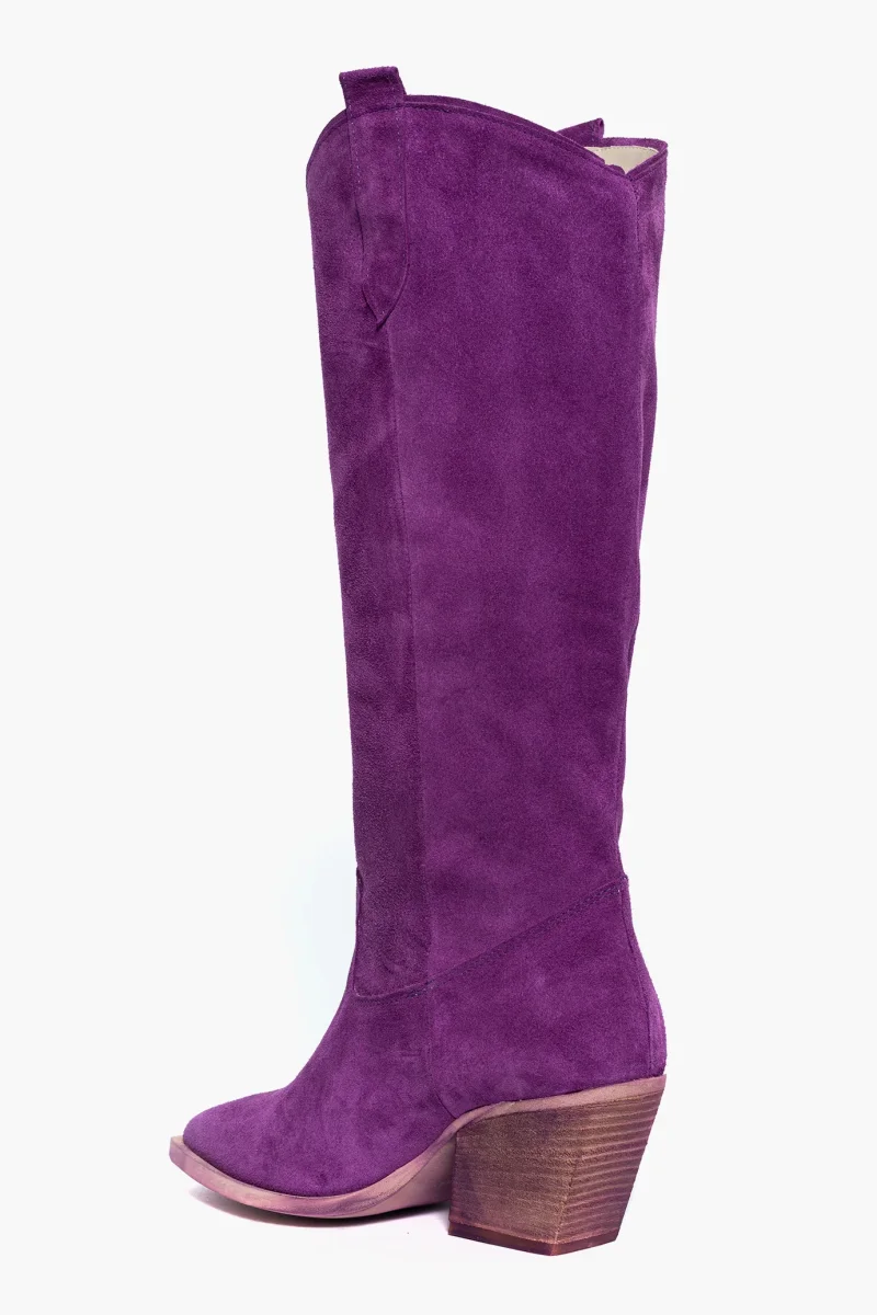 Stivali sotto al ginocchio in camoscio viola, interni e sottopiede in similpelle, suola nel colore neutro spazzolato, altezza 7 cm. Punta leggermente stretta in avanti, calzata giusta, modello texano. Calzature realizzate in modo artigianale, rigorosamente Made in Italy.