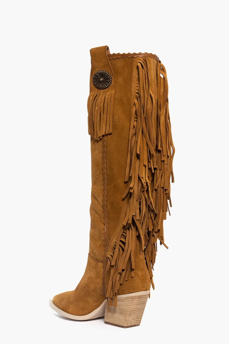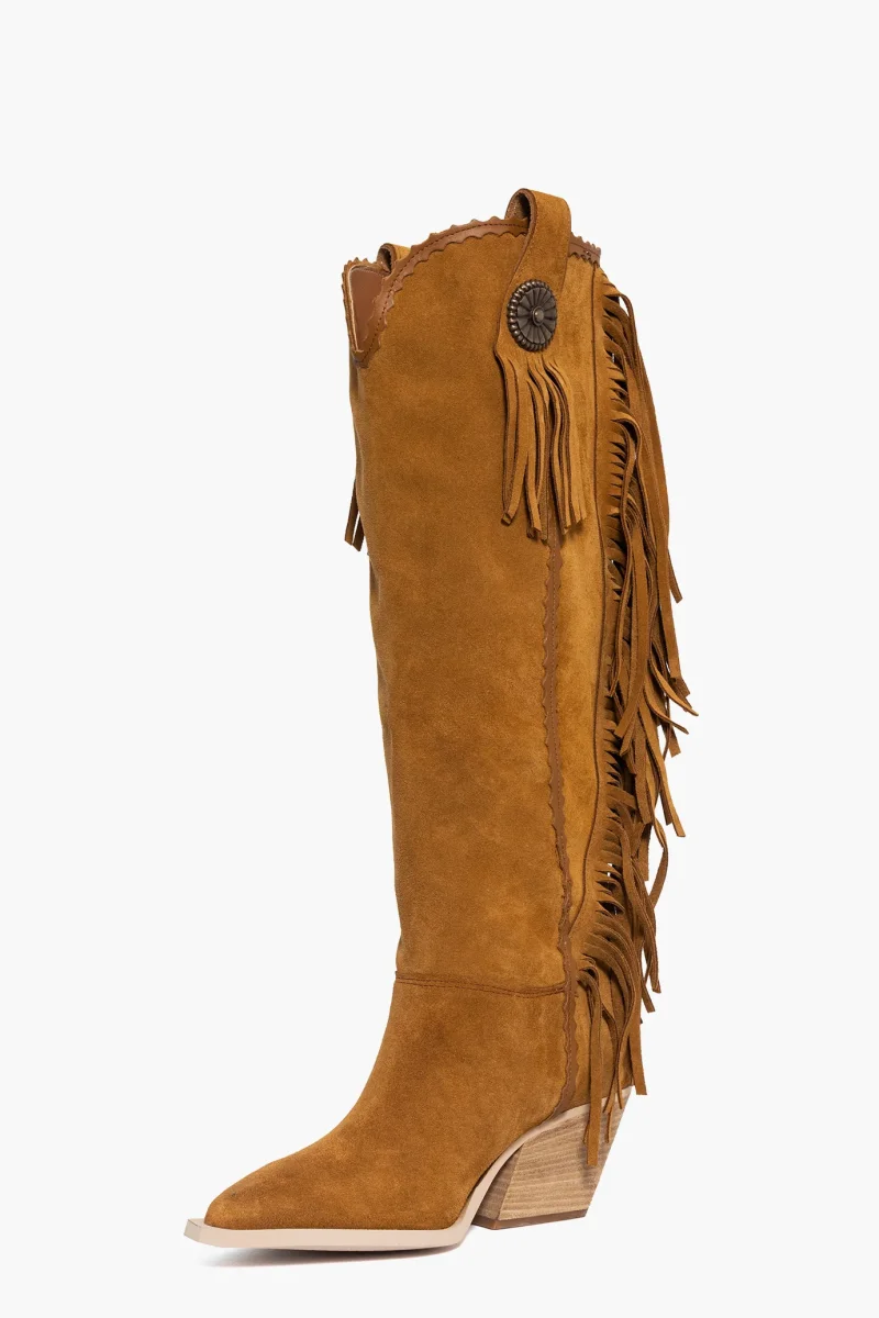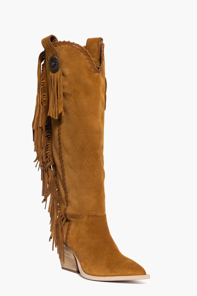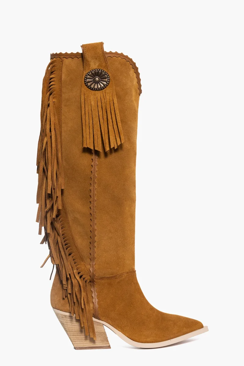 Stivali Irene Florida, lunghezza gambale sotto al ginocchio, in camoscio cuoio con frange e riporti in pelle cuoio. Medaglione color ottone ai lati. Interni e sottopiede in similpelle. Suola in neutro spazzolato, tacco alto 7 cm. Calzata regolare, punta stretta in avanti. Calzature realizzate in modo artigianale, rigorosamente Made in Italy.
