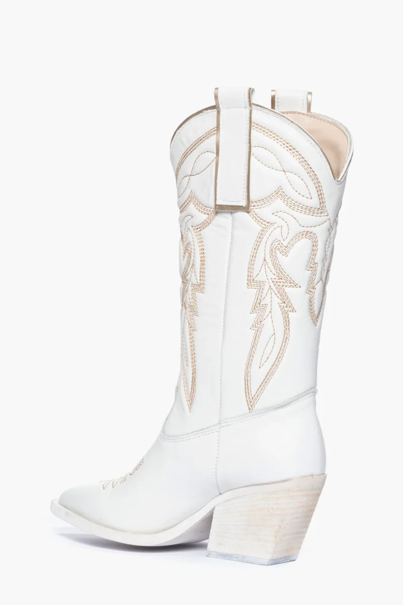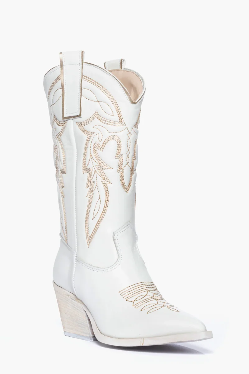 Stivali al polpaccio in pelle bianca con ricamo oro, spazzolato, suola in thunit neutro, spazzolato bianco, altezza 7 cm. Interni e sottopiede in similpelle, privo di cerniera. Calzano giuste, punta stretta in avanti. Calzature realizzate artigianalmente, rigorosamente Made in Italy.