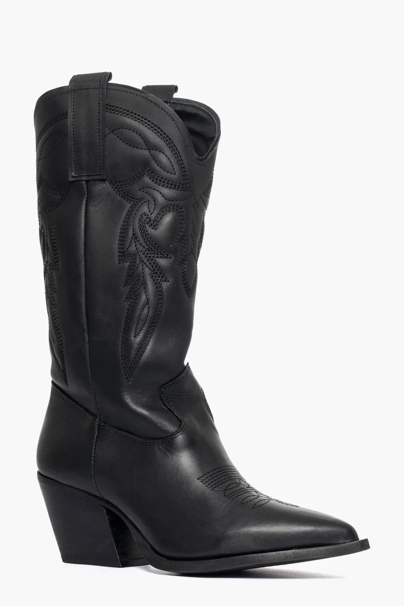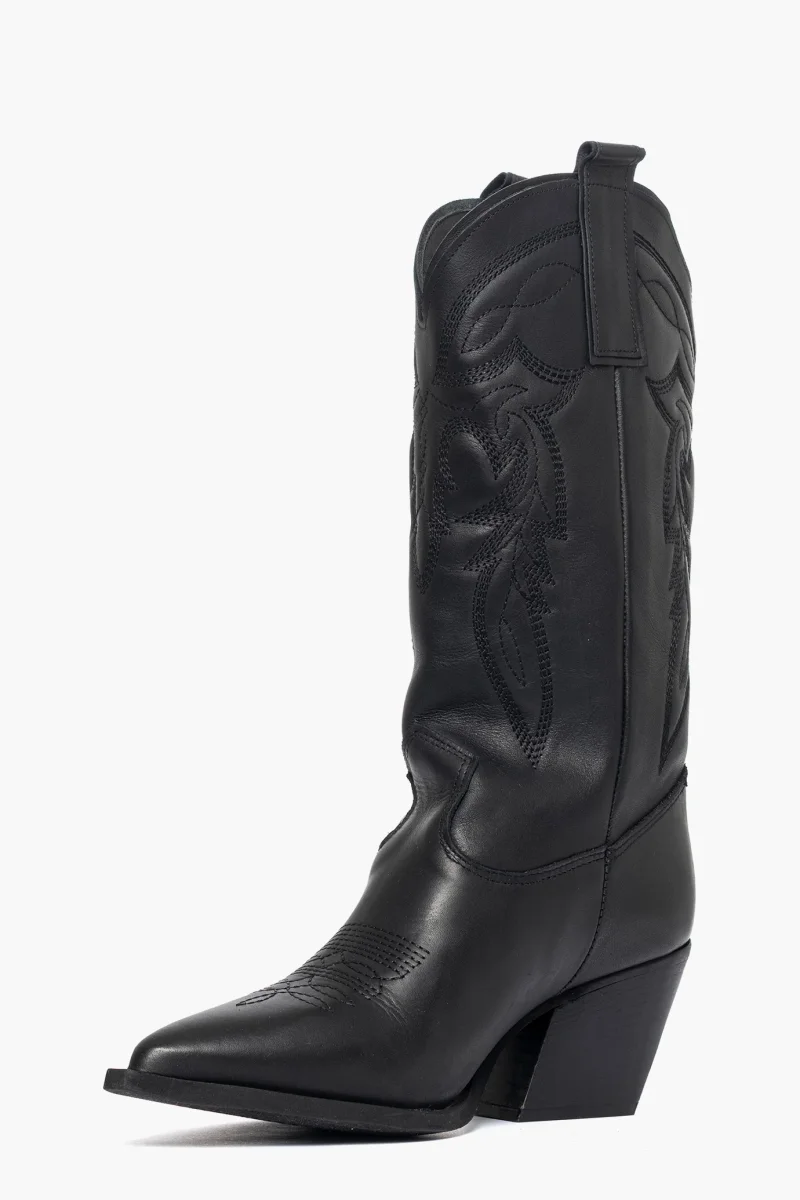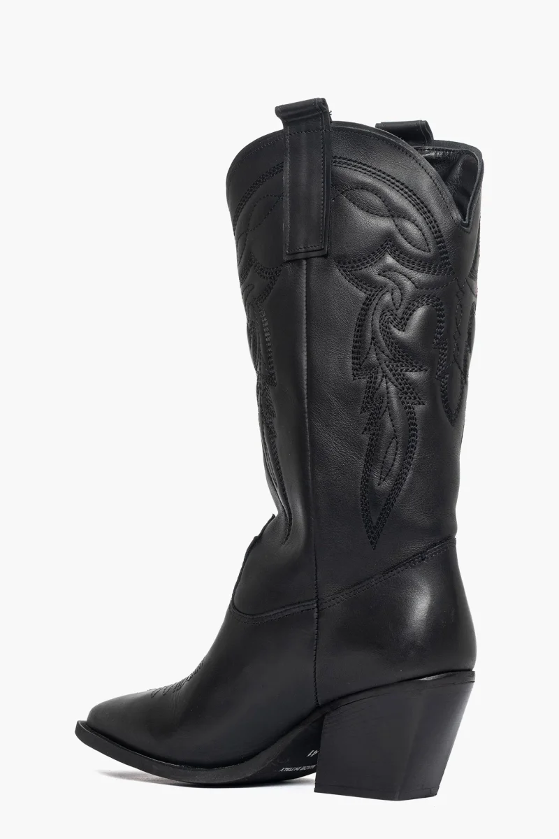 Stivali al polpaccio in pelle nero con ricamo tono su tono, spazzolato, suola in thunit nera, altezza 7 cm. Interni e sottopiede in similpelle, privo di cerniera. Calzano giuste, punta stretta in avanti. Calzature realizzate artigianalmente, rigorosamente Made in Italy.