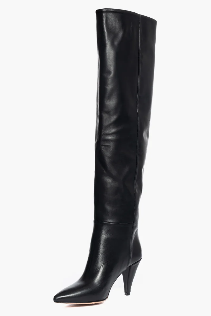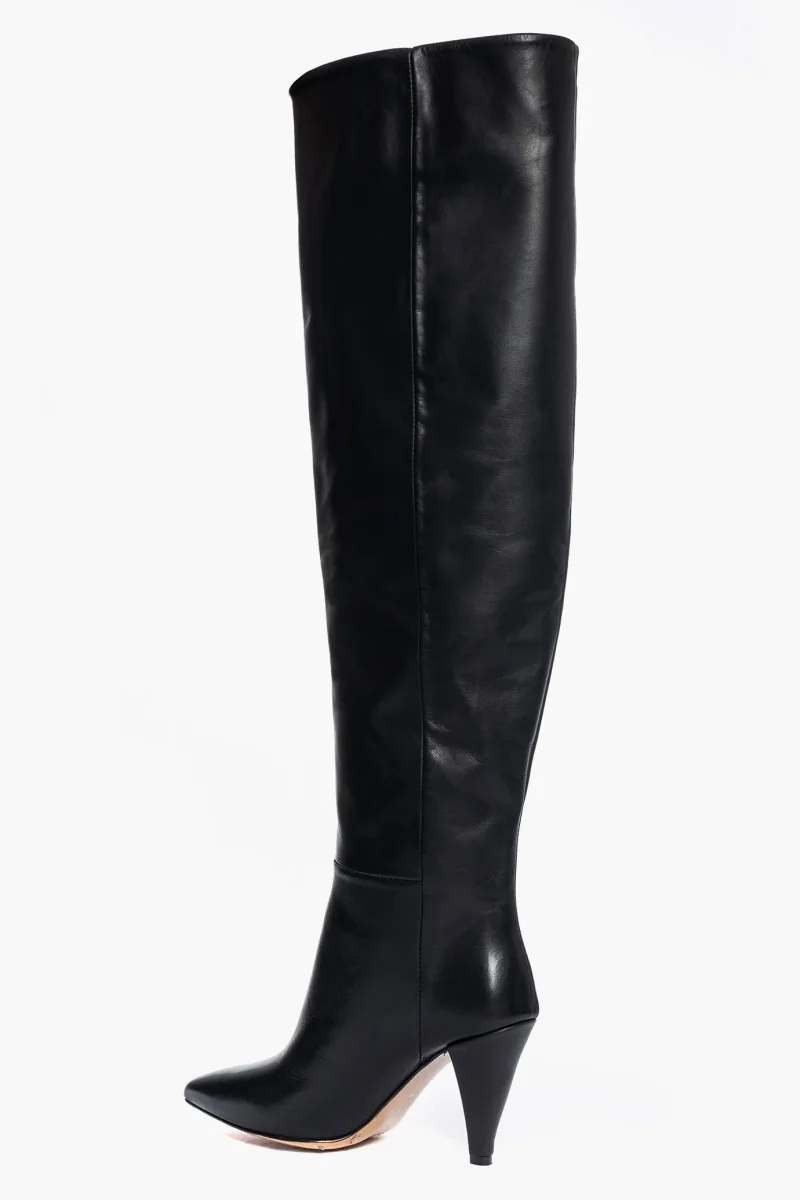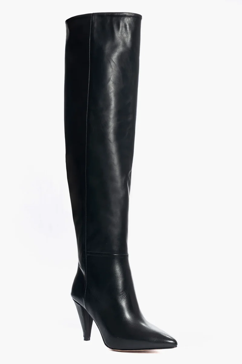 Stivali sopra al ginocchio in pelle nera con punta leggermente stretta e tacco rivestito in pelle nera, altezza 9 cm. Interni e sottopiede in similpelle nero. Calzata regolare, taglia italiana. Calzature realizzate artigianalmente, rigorosamente Made in Italy.