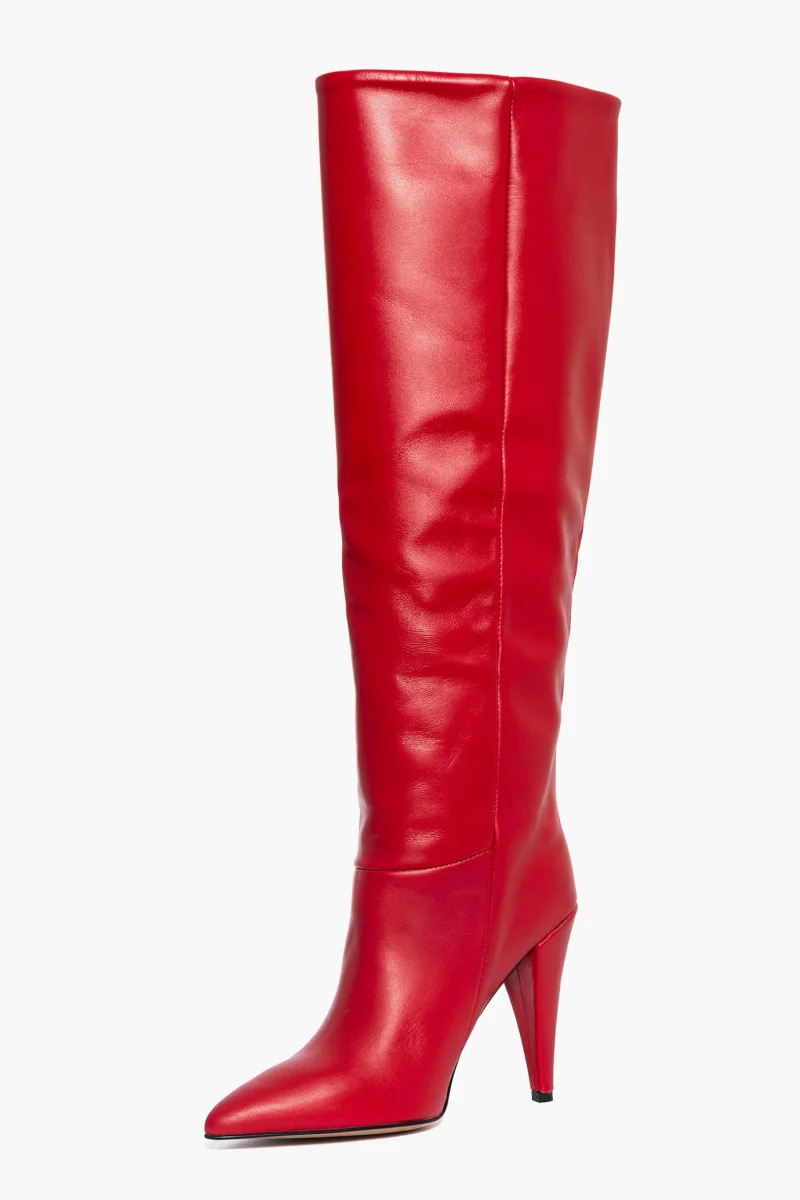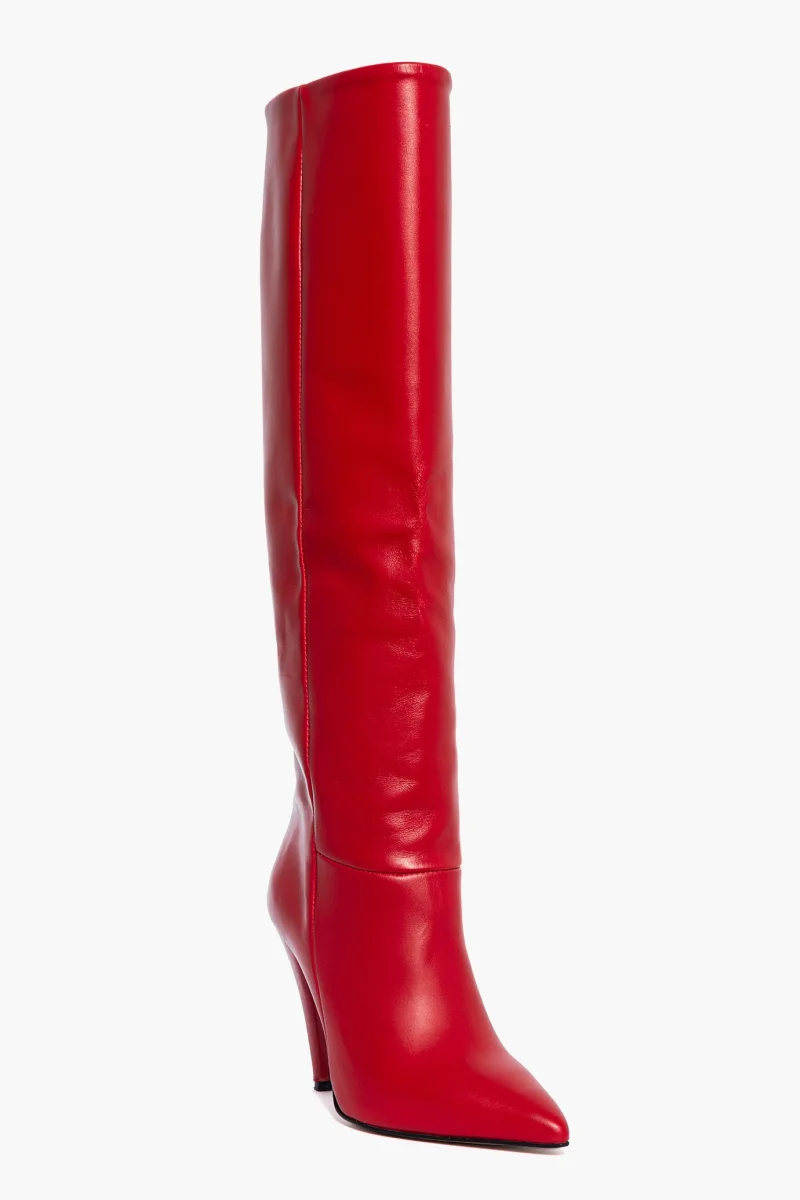 Stivale in pelle rosso, interni e sottopiede in similpelle nero, privo di cerniera, tacco rivestito in pelle rosso, altezza 10. Calzata giusta, punta stretta, taglia italiana. Calzature realizzate in modo artigianale, rigorosamente Made in Italy.