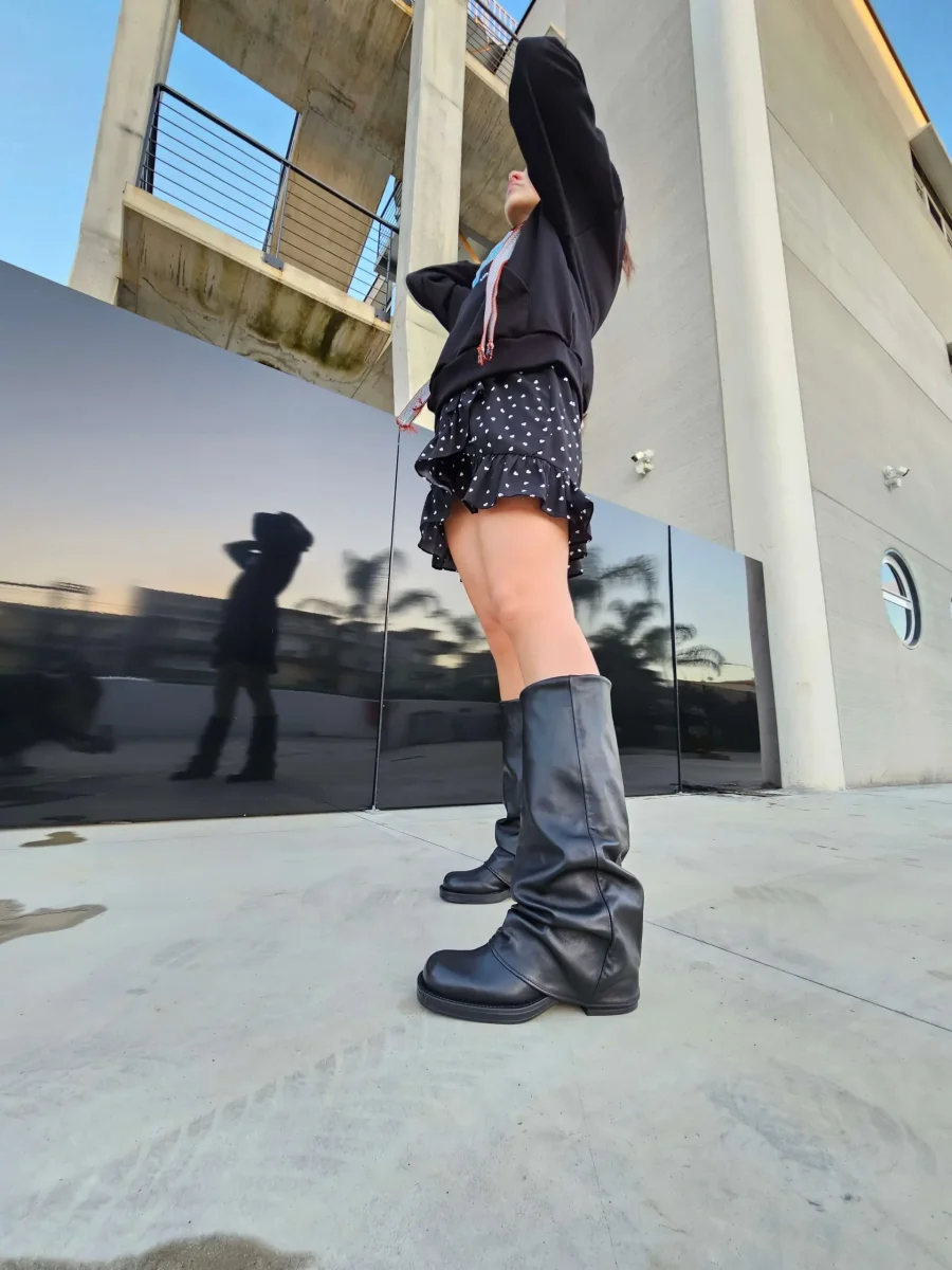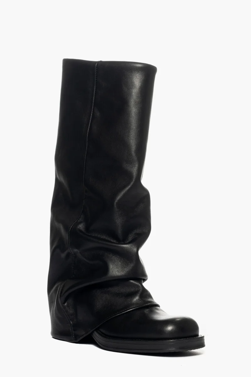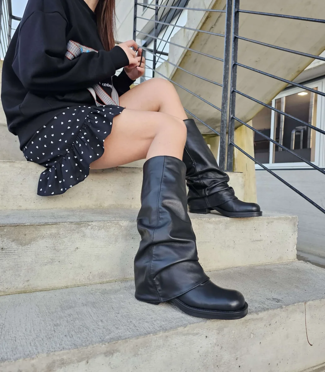 Stivali anfibio Megan 1349 in pelle nera con risvolto, con punta quadrata, interni e sottopiede in similpelle, tacco 6 cm. Calzata regolare. Calzature realizzate artigianalmente, rigorosamente Made in Italy.