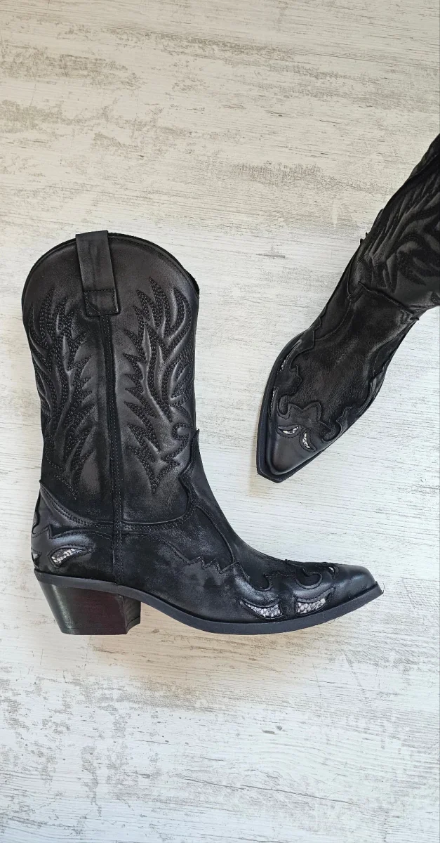 Stivale in pelle nero spazzolato con ricami e riporto pitone bianco nero, interni in similpelle, suola in micro in tinta spazzolata, 5, forma tecsana. Calzano comodi, punta in avanti, interni in similpelle. Calzature artigianali, made in Italy.