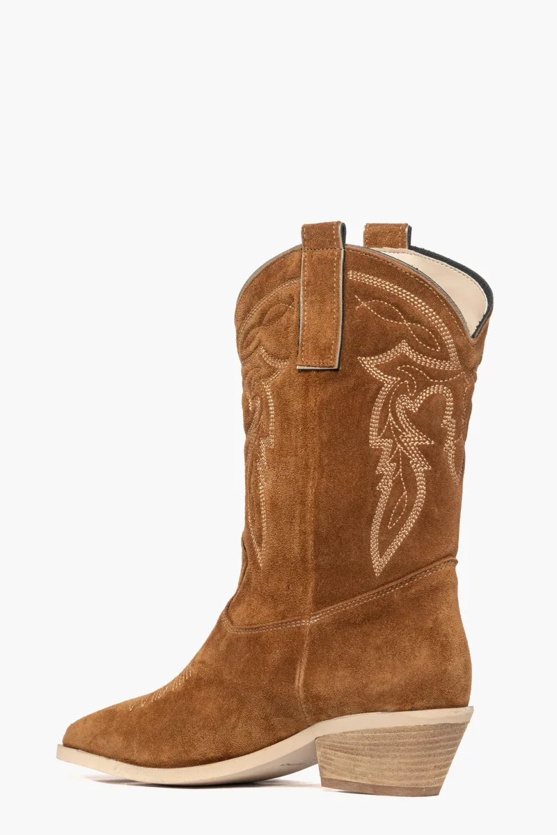 Stivali forma texana in camoscio cuoio, con ricami in contrasto e riporti nel colore oro, suola neutra spazzolata, interni in similpelle, privo di cerniera, altezza tacco 5. Calzano giusti punta stretta. Calzature artigianali, made in Italy.