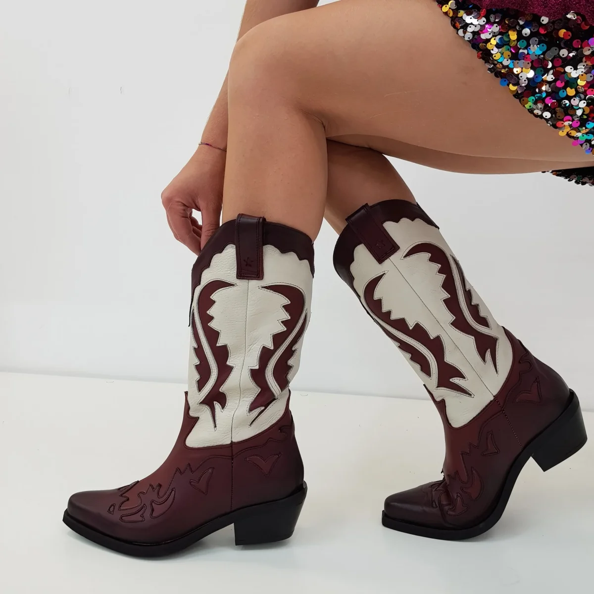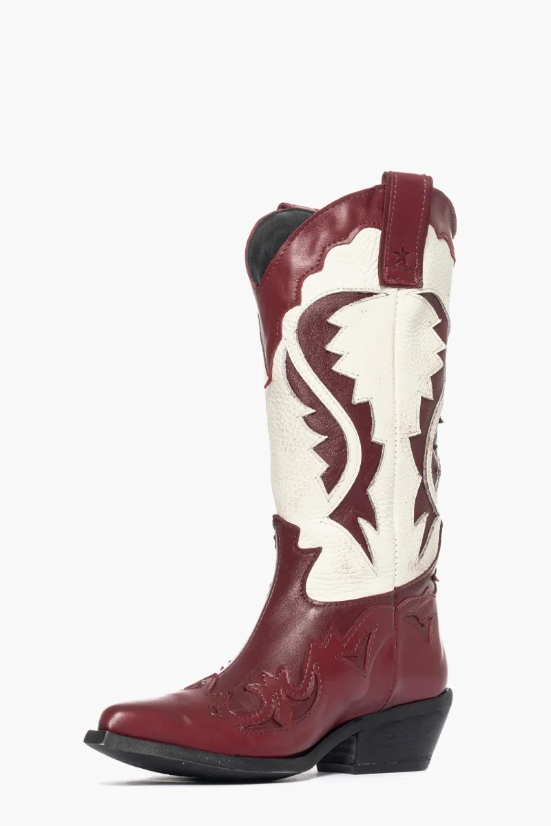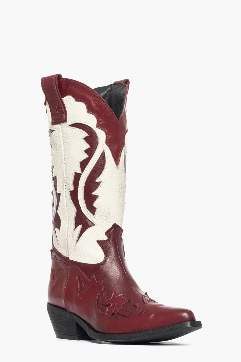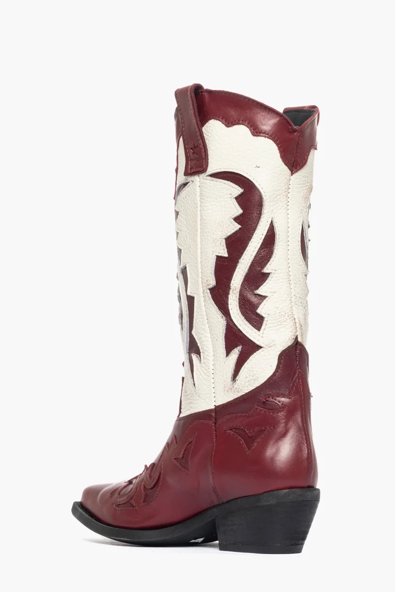 Stivale in pelle bordeaux scuro, bordeaux chiaro e pelle beige, privo di cerniera, interni e sottopiede in similpelle, marchio LIA DIVA, tacco altezza 5, suola in micro duro, morbide e comode, calzno comode. Calzature artigianli, made in Italy.