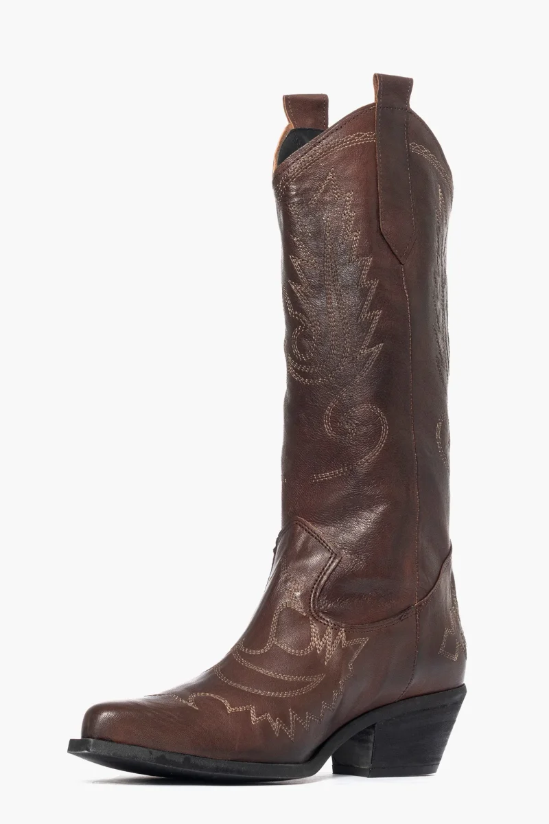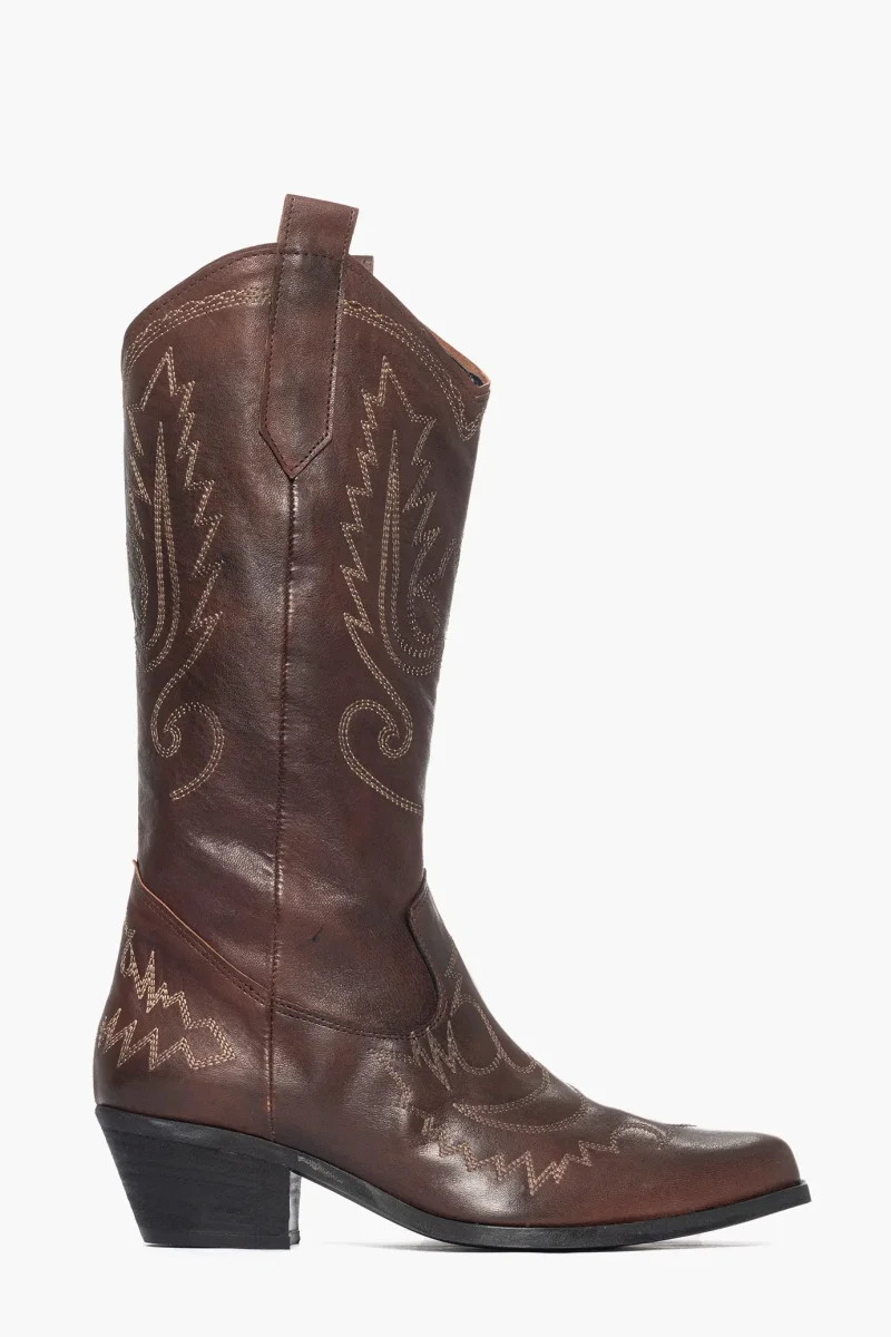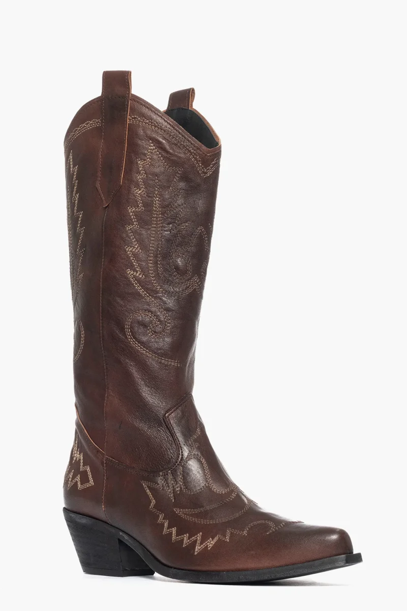 Stivali alti sotto al polpaccio in pelle marrone con ricamo in beige sulla punta e ai lati del gambale, privo di cerniera , sottopiede e interni in similpelle, tacco altezza 3 suola in micro duro. Calzano comodi, calzature artigianali, made in Italy.