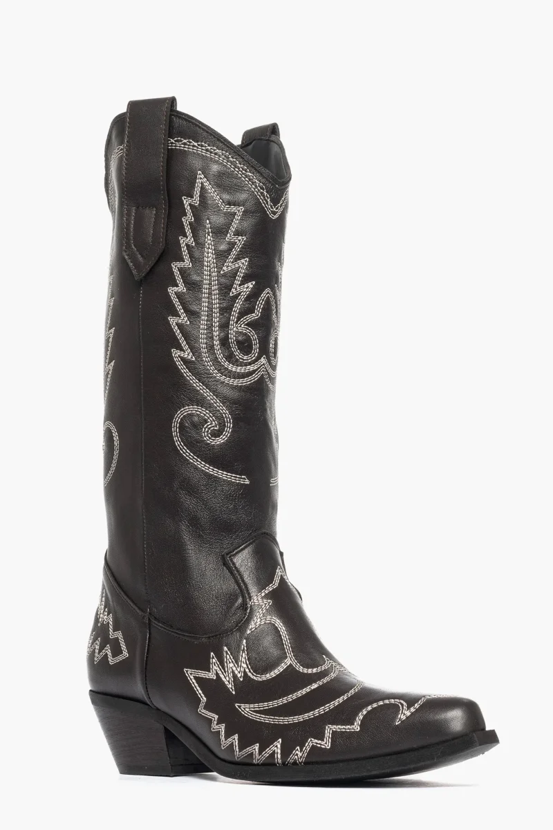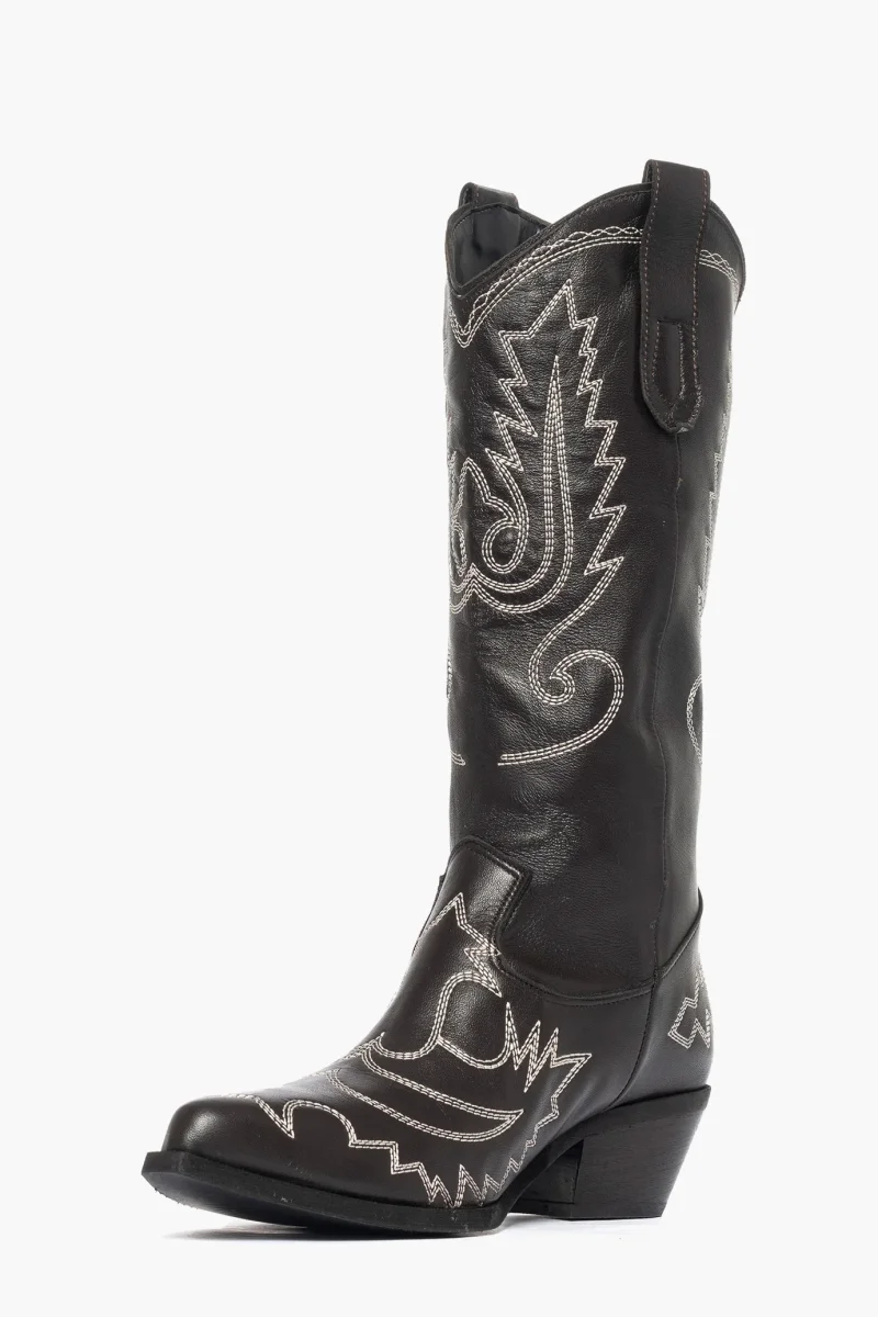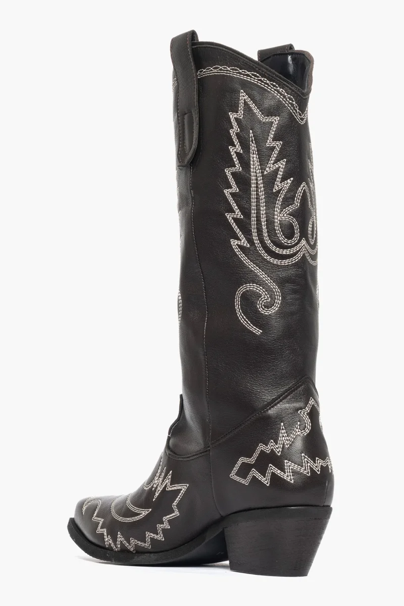 Stivali alti sotto al polpaccio in pelle fango con ricamo in beige sulla punta e ai lati del gambale, privo di cerniera , sottopiede e interni in similpelle, tacco altezza 3 suola in micro duro. Calzano comodi, calzature artigianali, made in Italy.