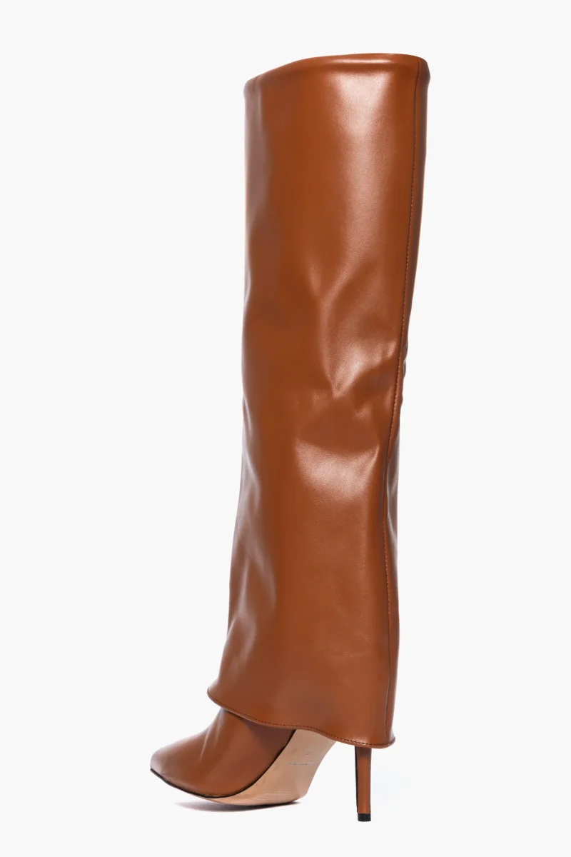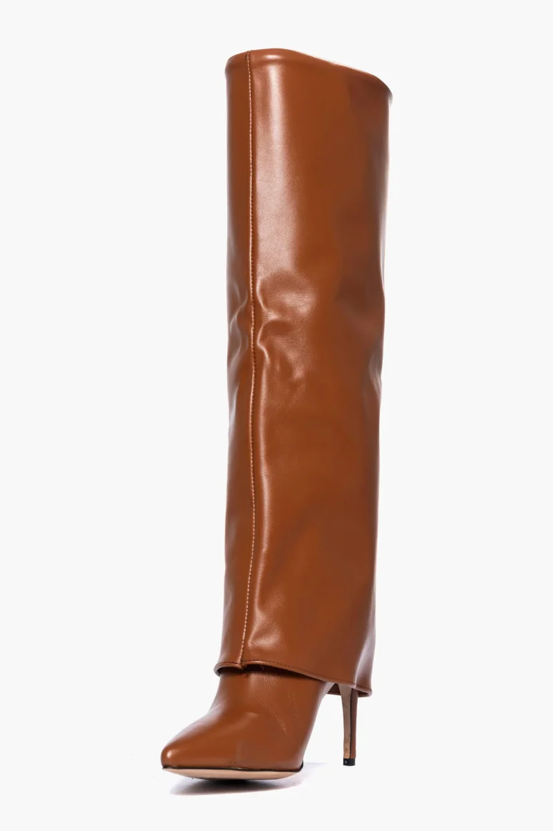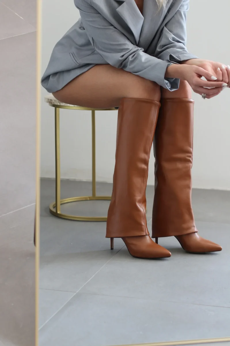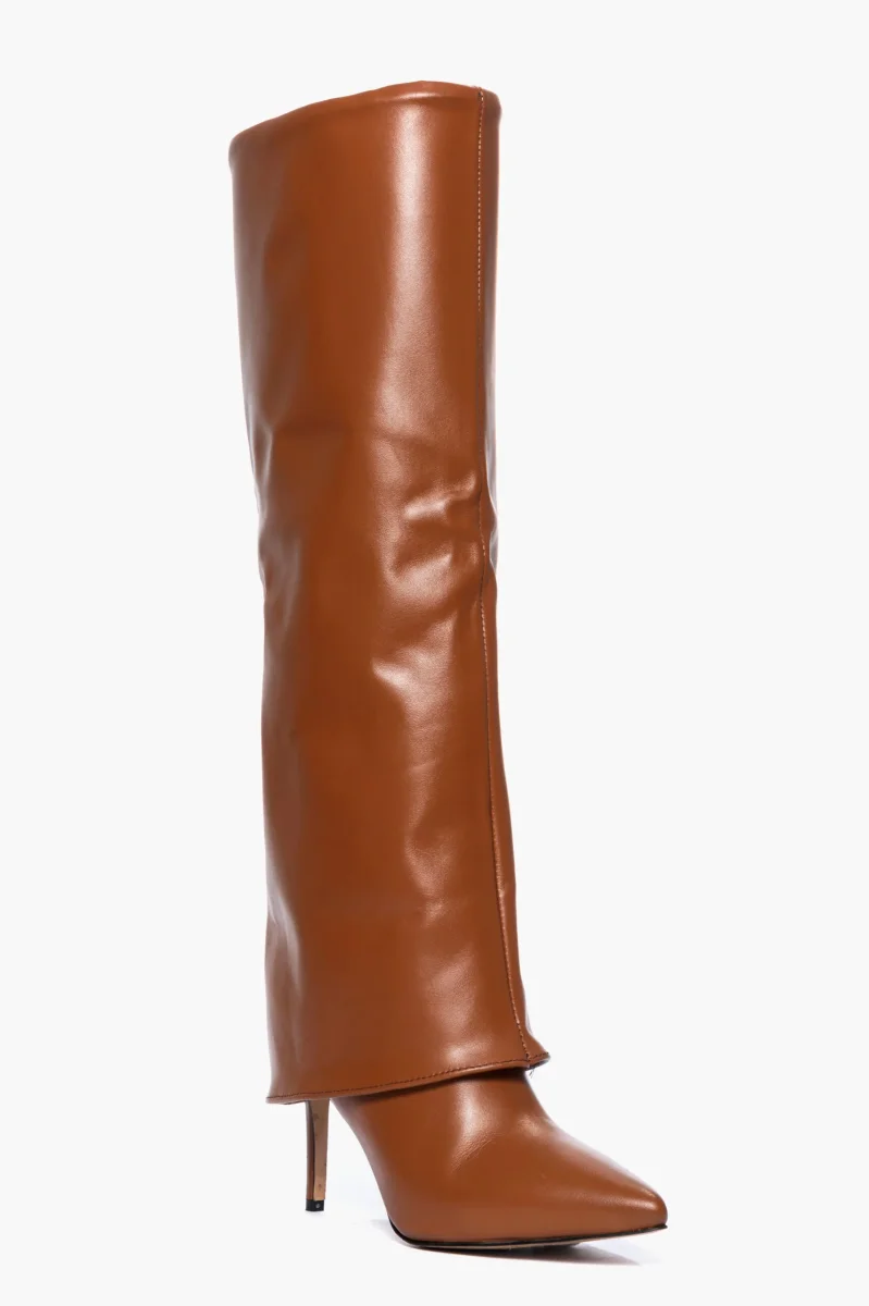 Stivali in pelle cuoio con risvolto, tacco a spillo alto 9 cm, interni e sottopiede in similpelle. Calzata giusta, punta stretta. Calzature realizzate artigianalmente, rigorosamente made in Itay.