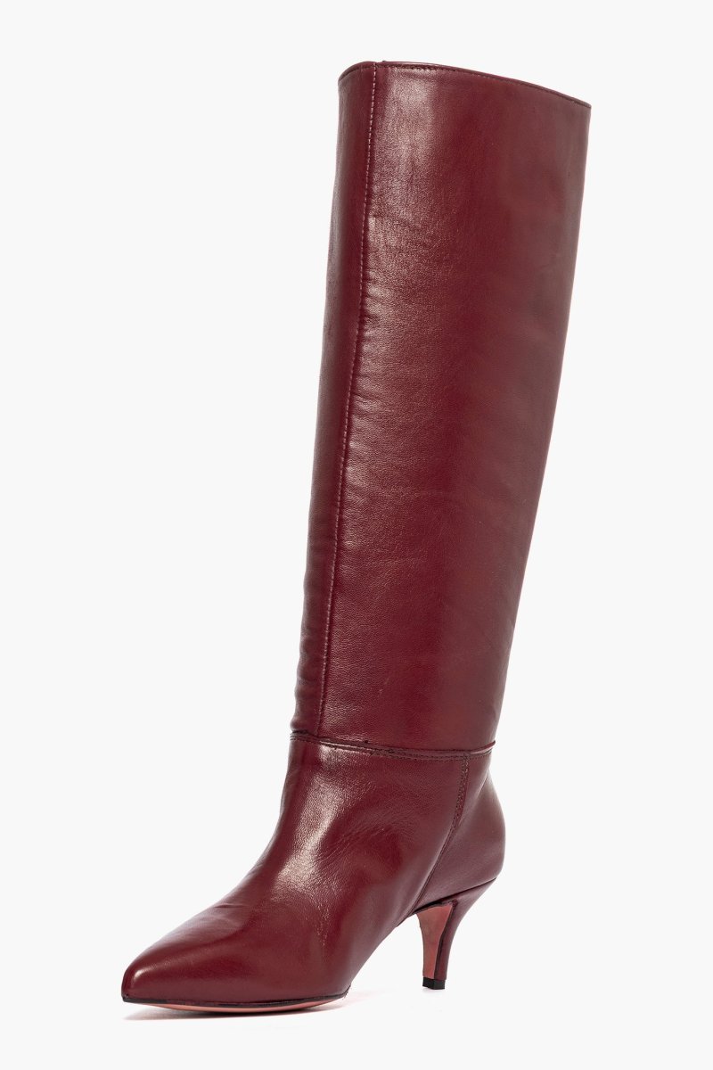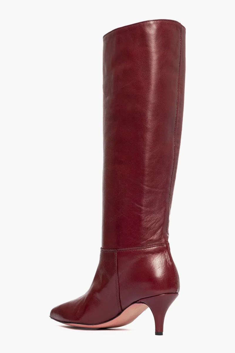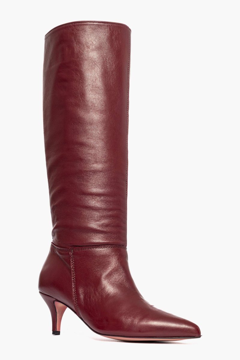 Stivali in pelle bordeaux, interni in similpelle, tacco rivestito, 6cm, privo di cerniera. Calzano regolari, punta stretta. Calzature artigianali, made in Italy.