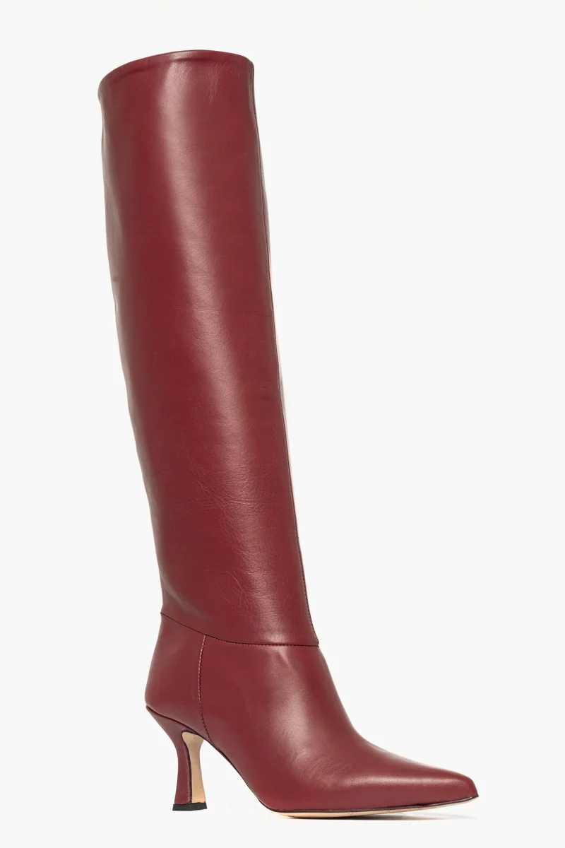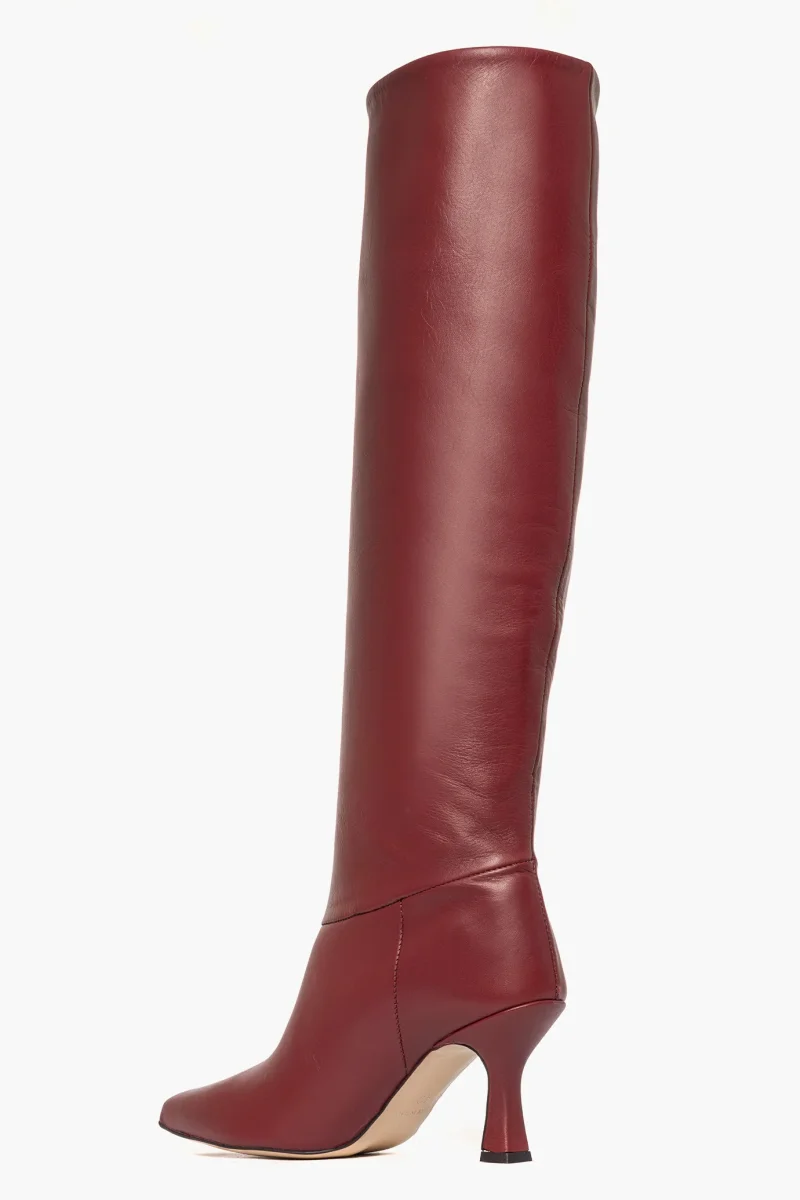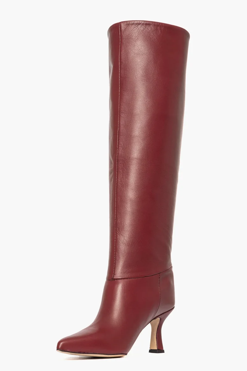 Stivale in pelle bordeaux altezza gambale al ginocchio, tacco rivestito, 8.5, calzano regolari, privo di cerniera, interni in similpelle. Calzature artigianali, made in Italy.
