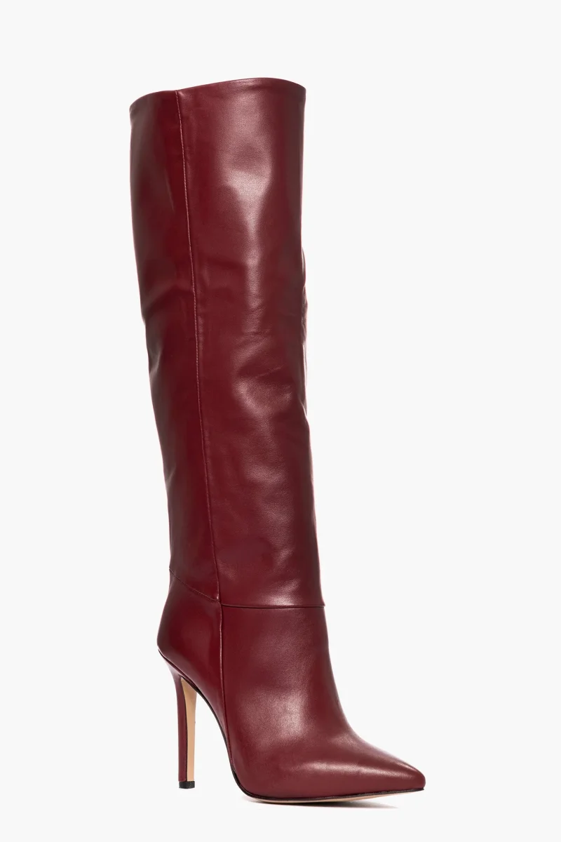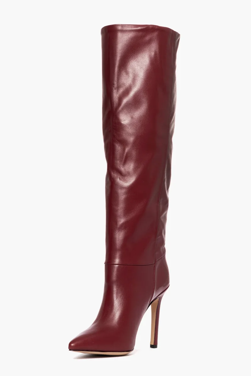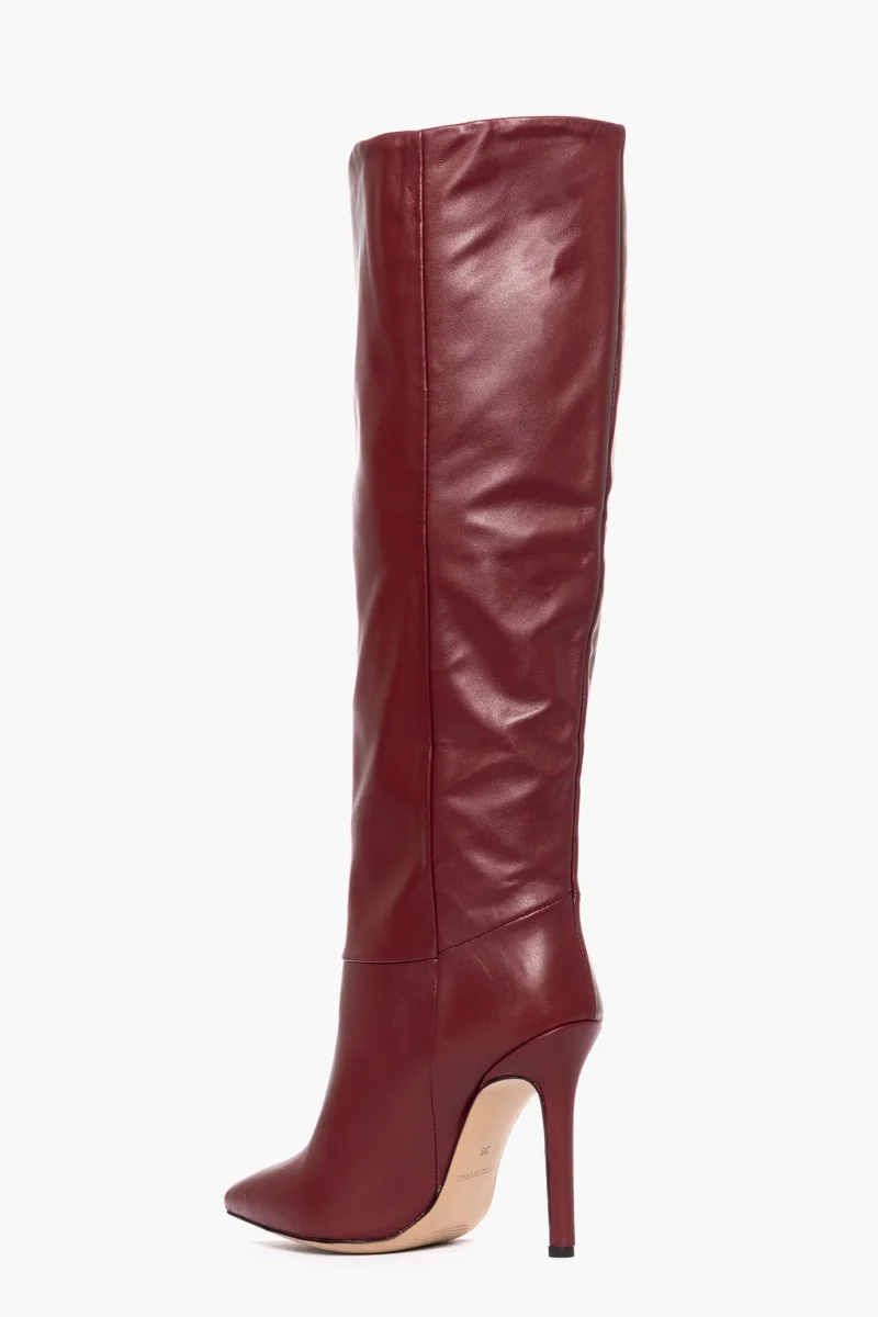 Stivali sotto al ginocchio pelle bordeaux con tacco a spillo, altezza 11 cm rivestito, interni e sottopiede in similpelle. Calzata giusta, punta stretta in avanti, privo di cerniera. Calzature artigianali, made in Italy.