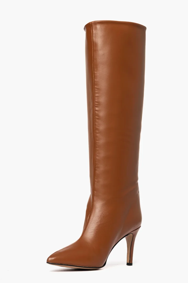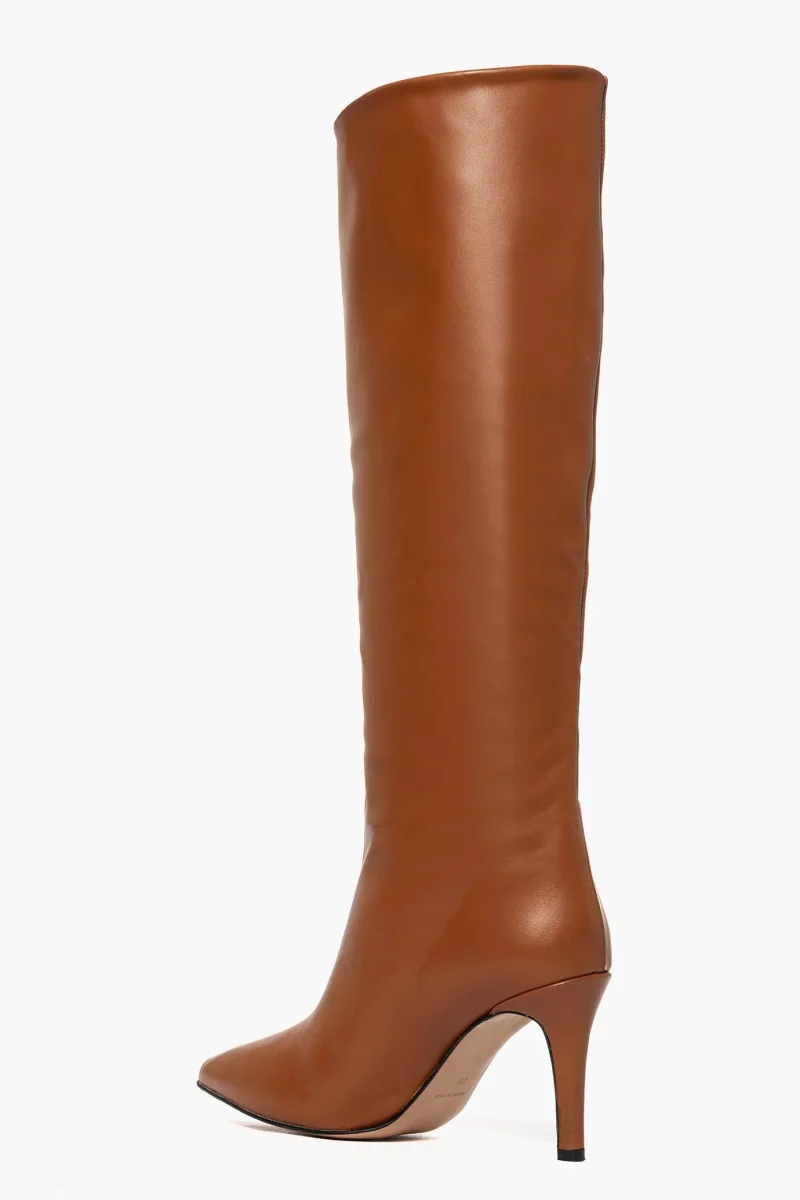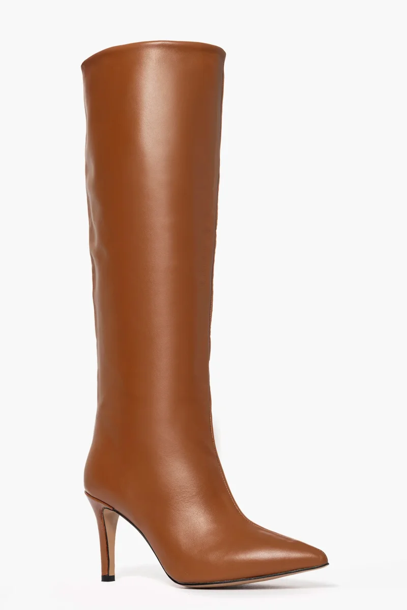 Stivali al polpaccio in pelle cuoio, tacco rivestito, altezza 8, interni in similpelle. Calzano giusti, punta stretta. Calzature artigianali, made in Italy.