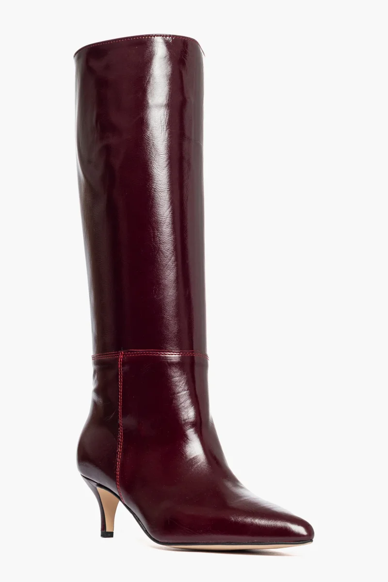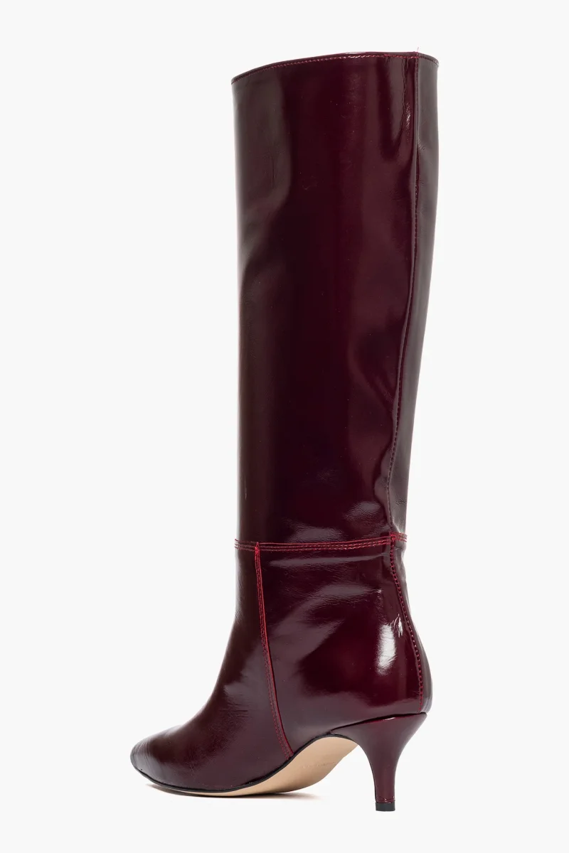 Stivali in pelle latex borgogna, interni in similpelle, tacco rivestito, 6cm, privo di cerniera. Calzano regolari, punta stretta. Calzature artigianali, made in Italy.