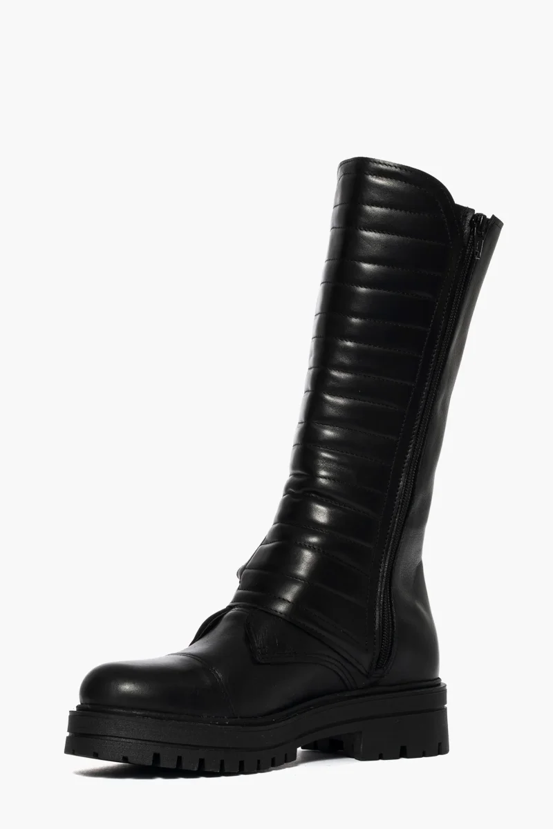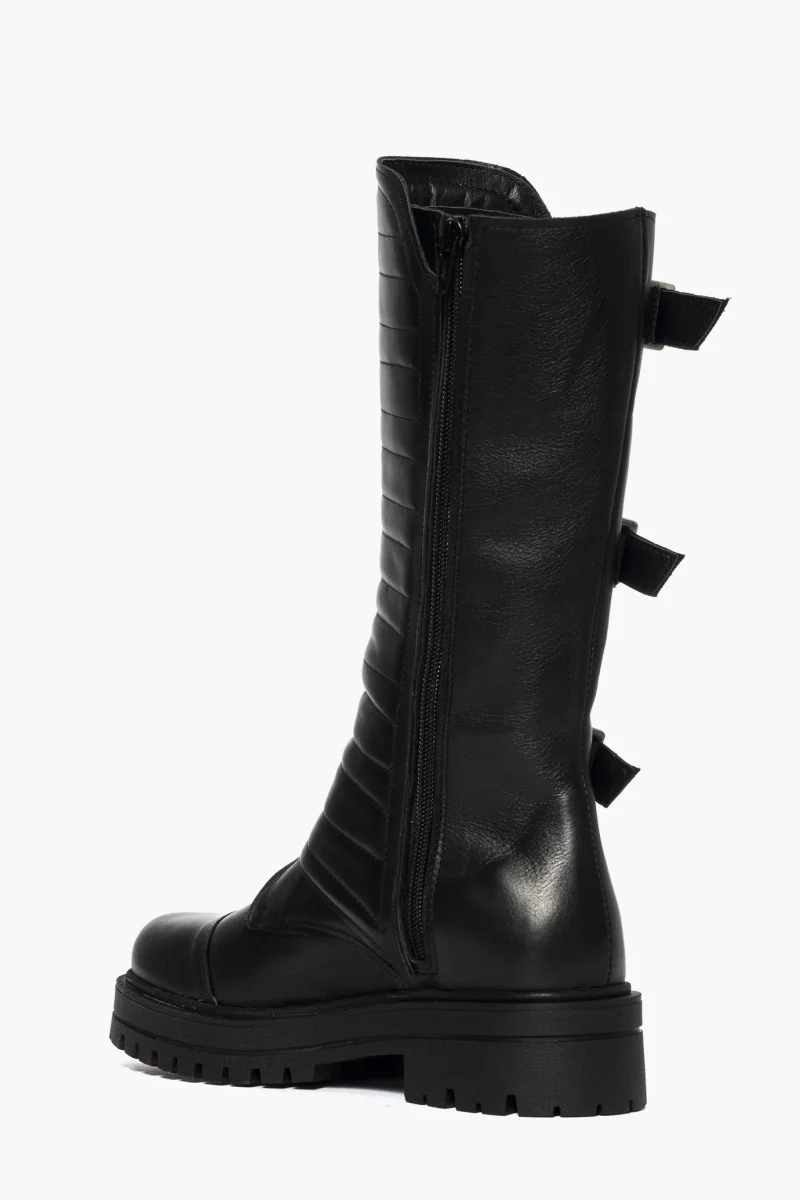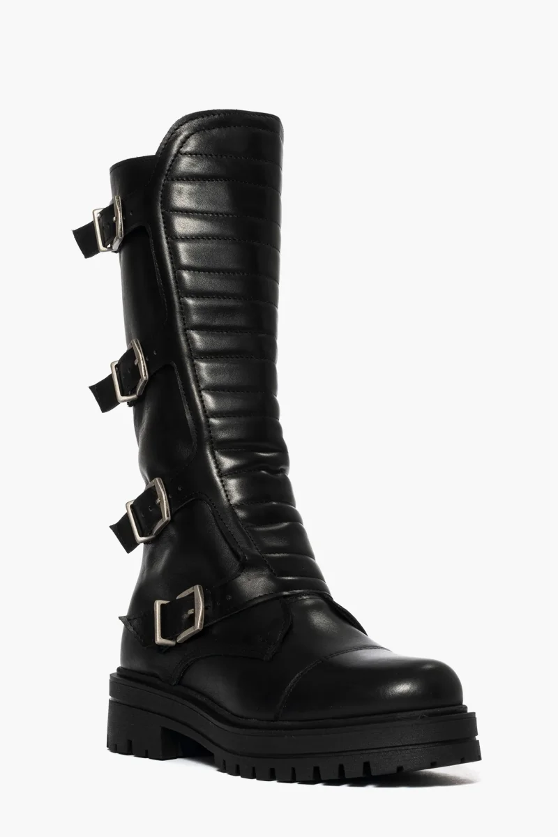 Stivali in pelle nero con fibbie in colore argento, imbottitura in avanti, cerniera interno piede per facilitare, suola in gomma nera, altezza 5. Calzano regolari, interni in similpelle.