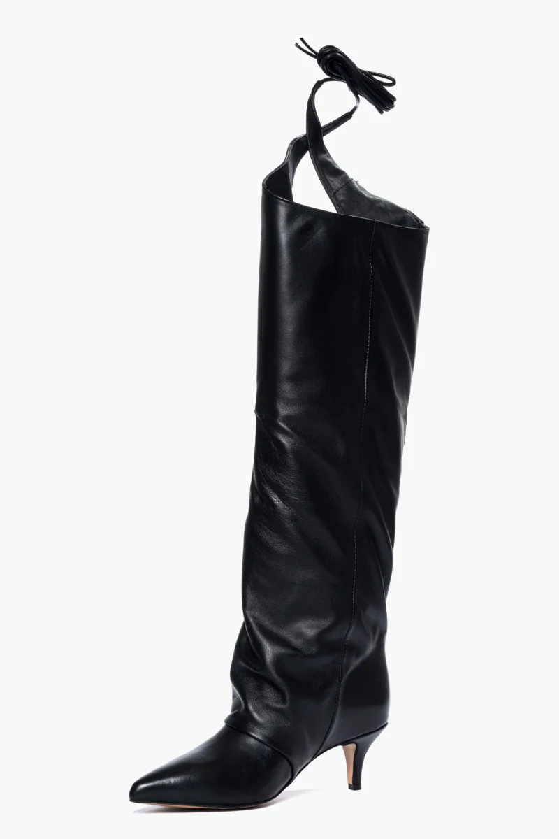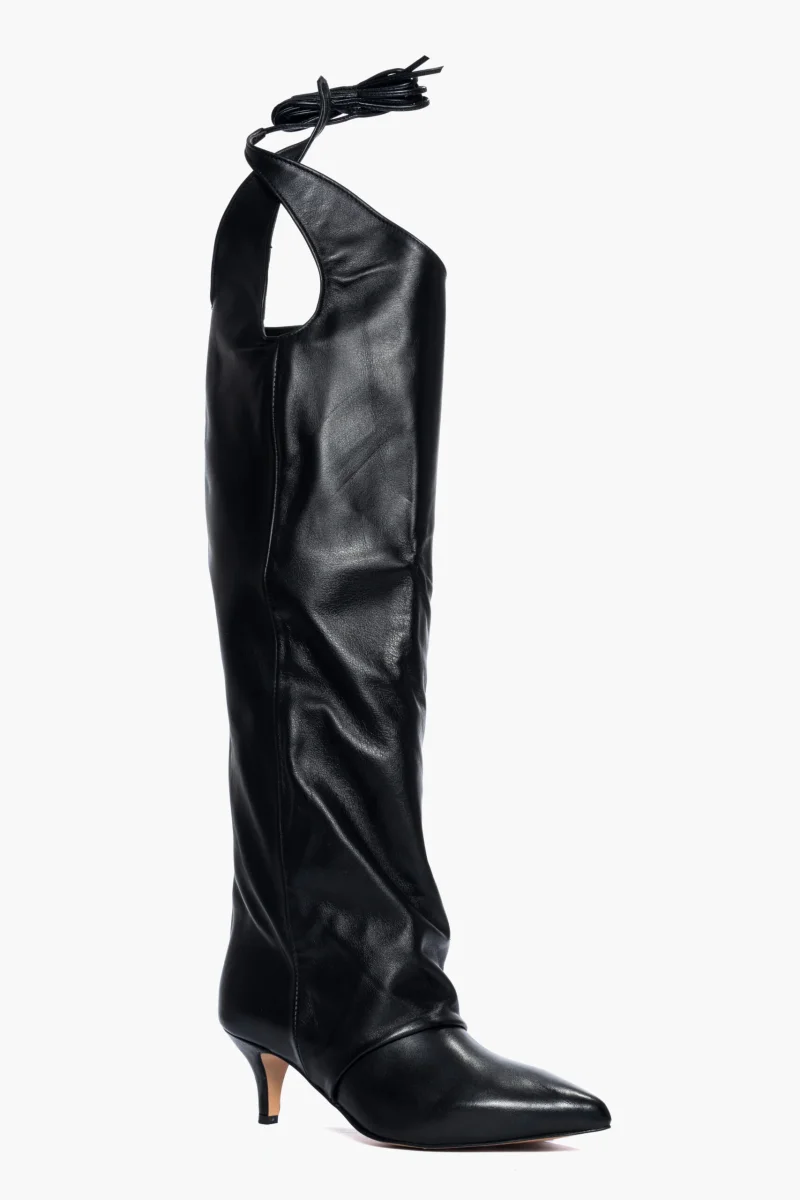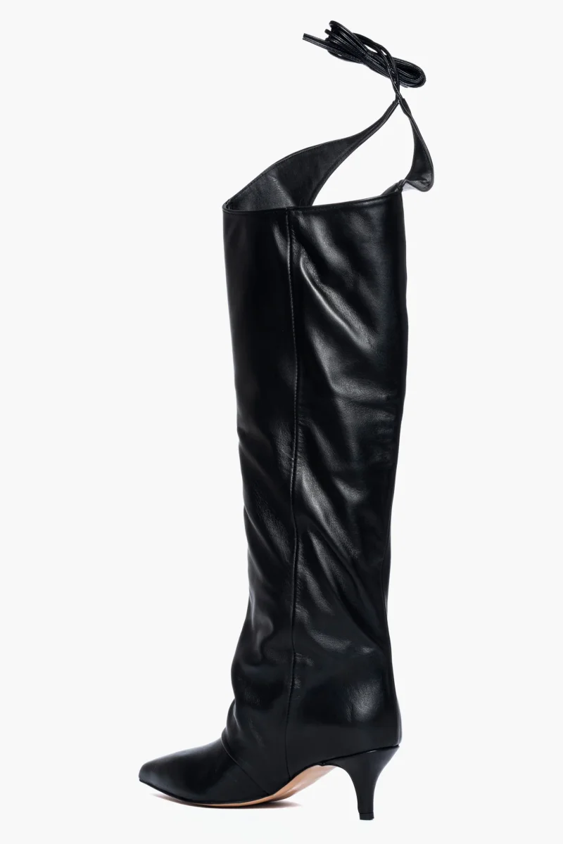 Stivali sopra al ginocchio in pelle morbida nero, con lacci modello schiava sopra al ginocchio, tacco rivestito altezza 5. Calzano regolari, punta stretta, foderati in similpelle.