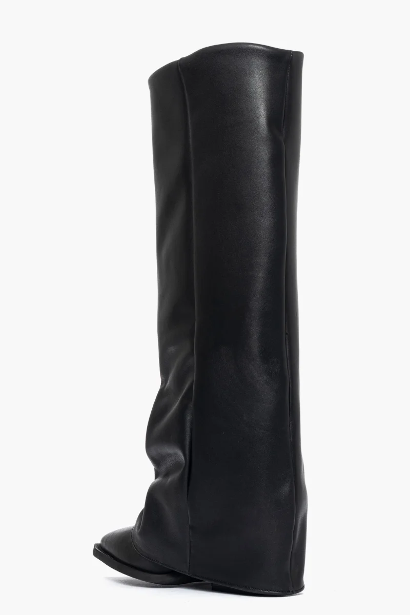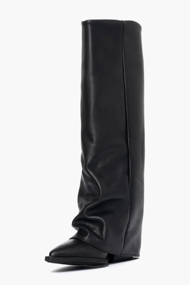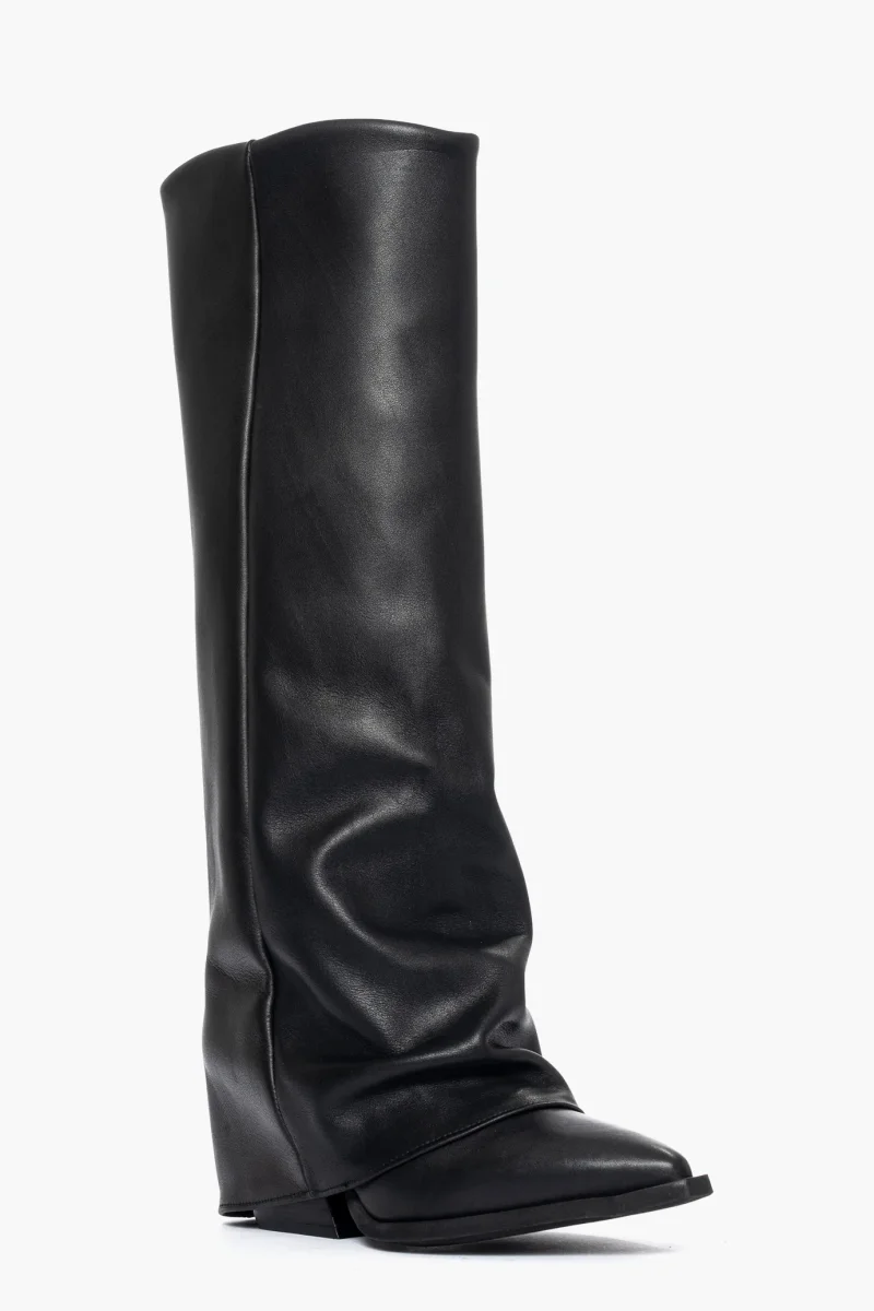 Stivale in pelle nero con risvolto aggrappato, interni in similpelle, suola nera, tacco 7, calzano giuste punta stretta, forma texana, calzature artigianali, made in Italy.
