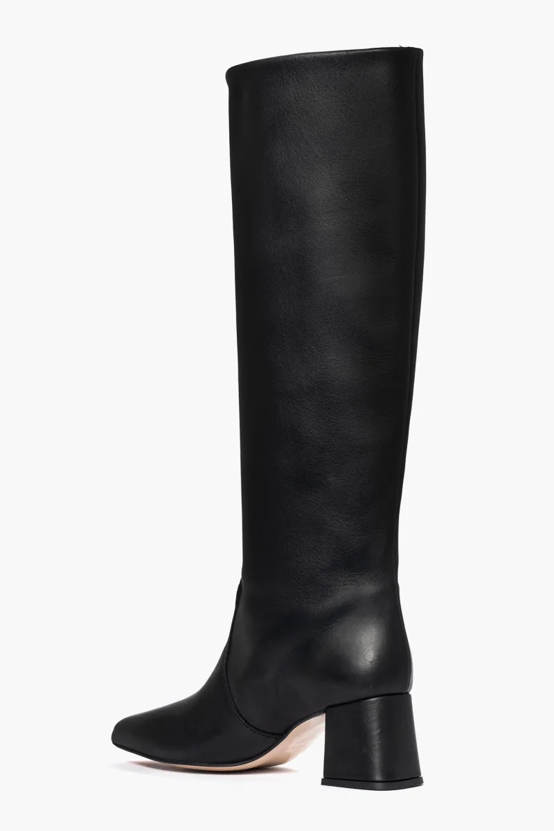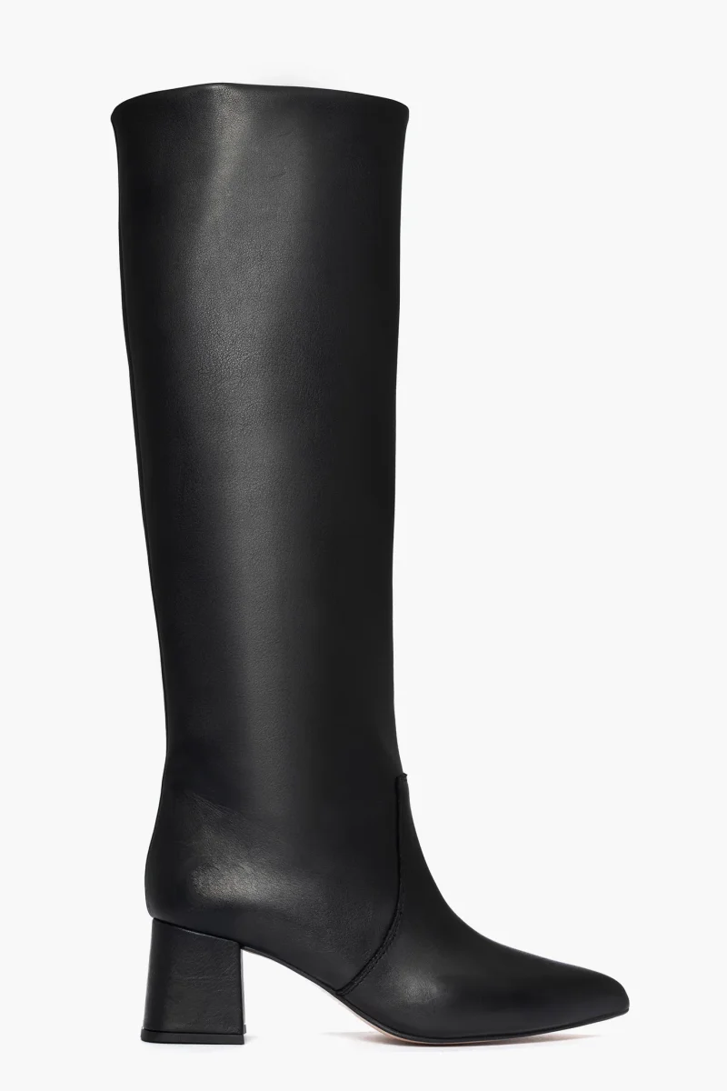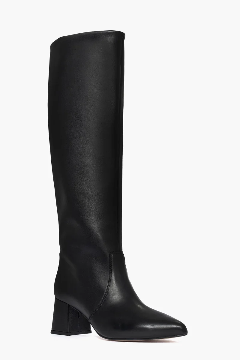 Stivale in pelle nera sotto al ginocchio, tacco rivestito altezza 6 cm, punta stretta, interni e sottopiede in similpelle. Calzata giusta e punta stretta, privo di cerniera. Calzature realizzate in modo artigianale, rigorosamente made in Italy.