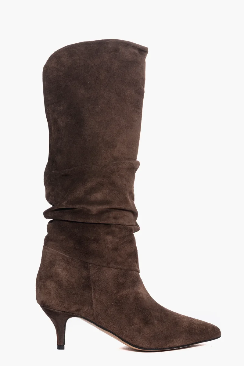 Stivali sopra al ginocchio in camoscio taupè, tacco rivestito, altezza 6, interni e sottopiede in similpelle, privo di cerniera. Calzano regolari, punta leggermente stretta in avanti. Calzature realizzate in modo artigianale, rigorosamente Made in Italy.