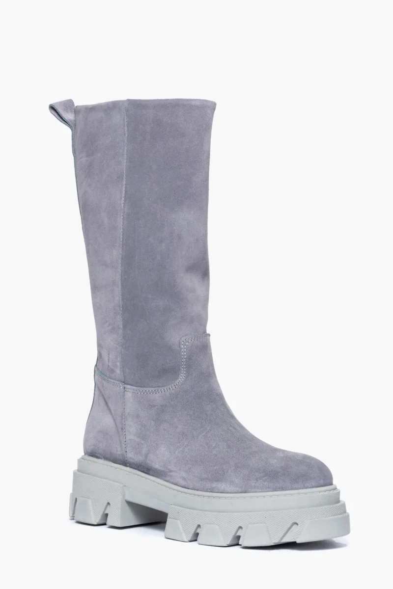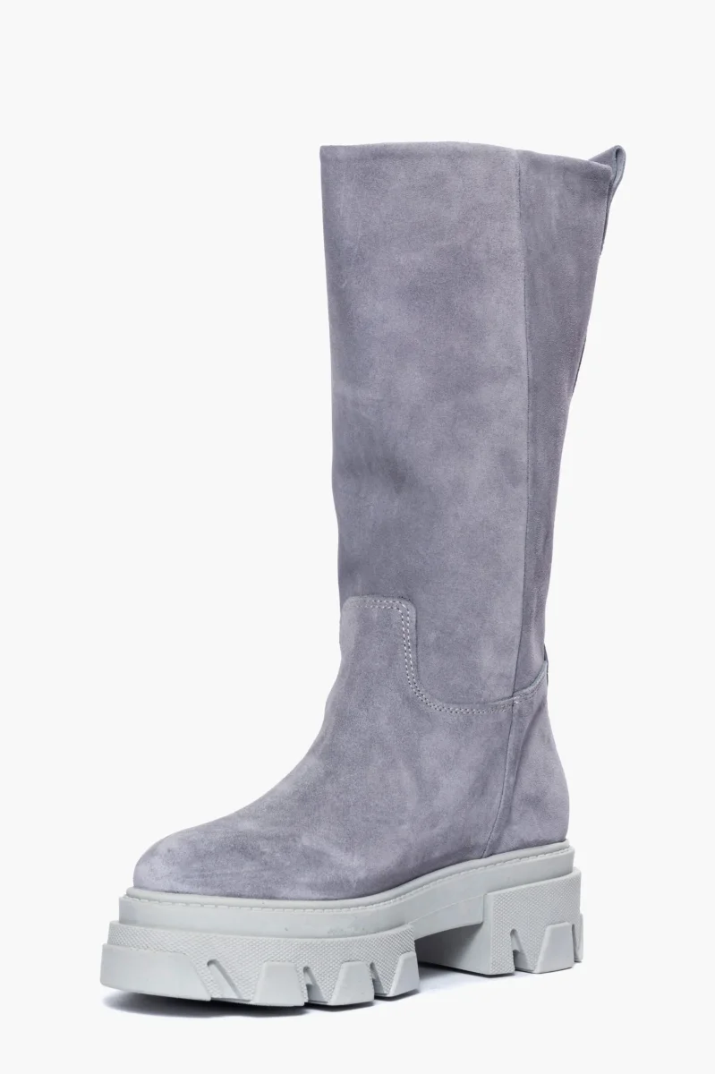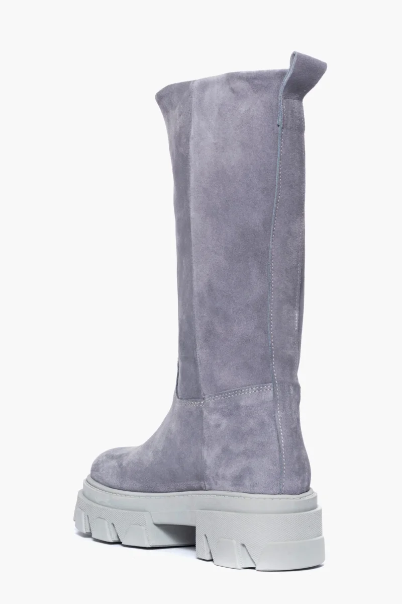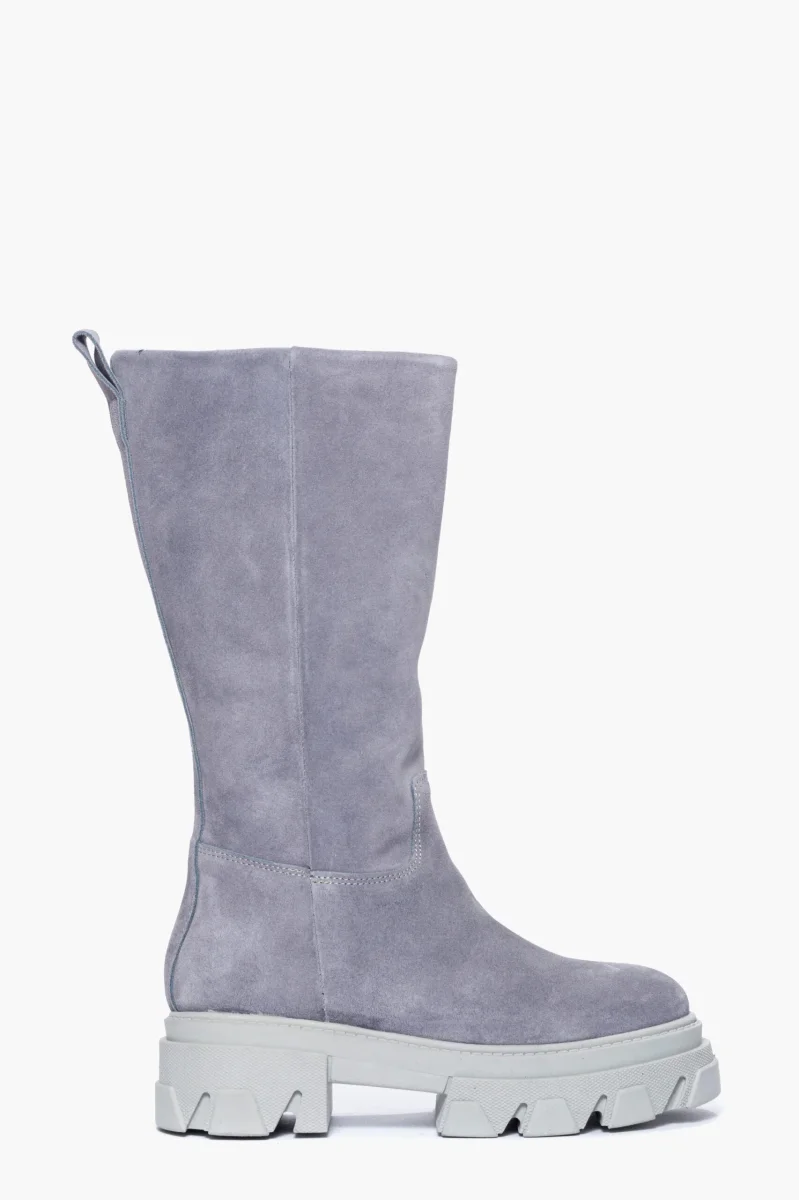 Stivali al polpaccio in camoscio grigio, appartenente alla collezione Wake, interni e sottopiede in similpelle, suola in gomma grigia, altezza 5 cm. Calzano comode, in caso di mezzo numero è consigliabile non prendere un numero in più. Calzature realizzate artigianalmente, rigorosamente made in Italy.
