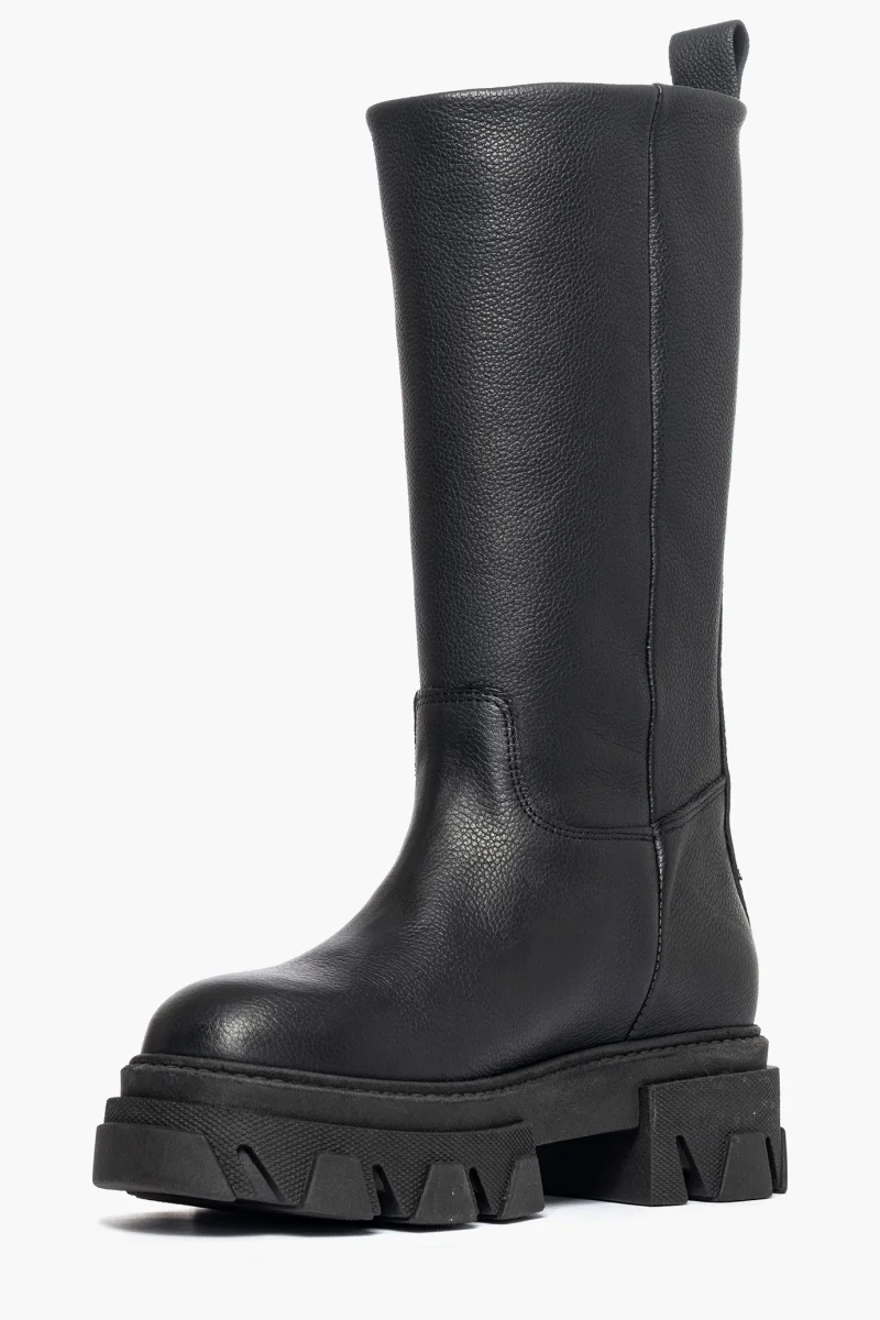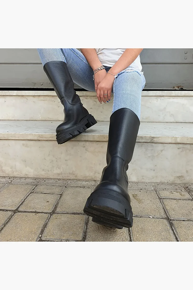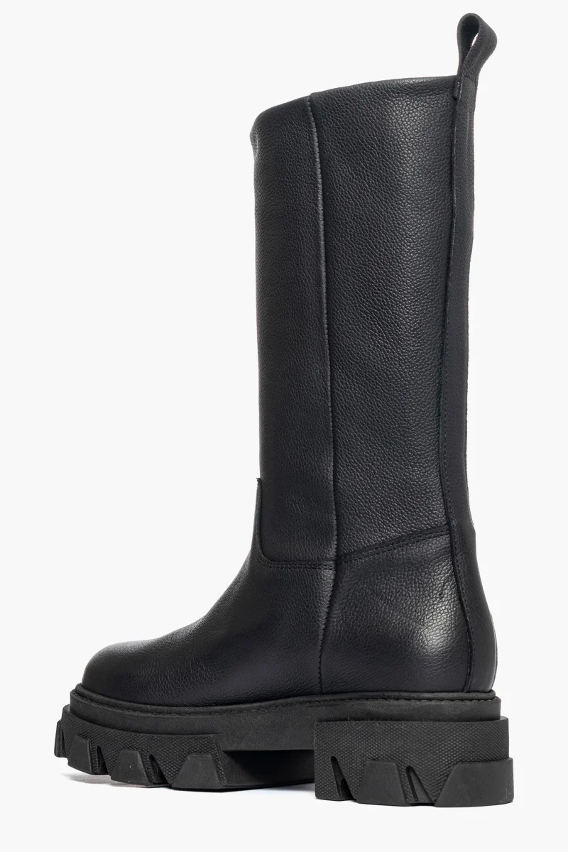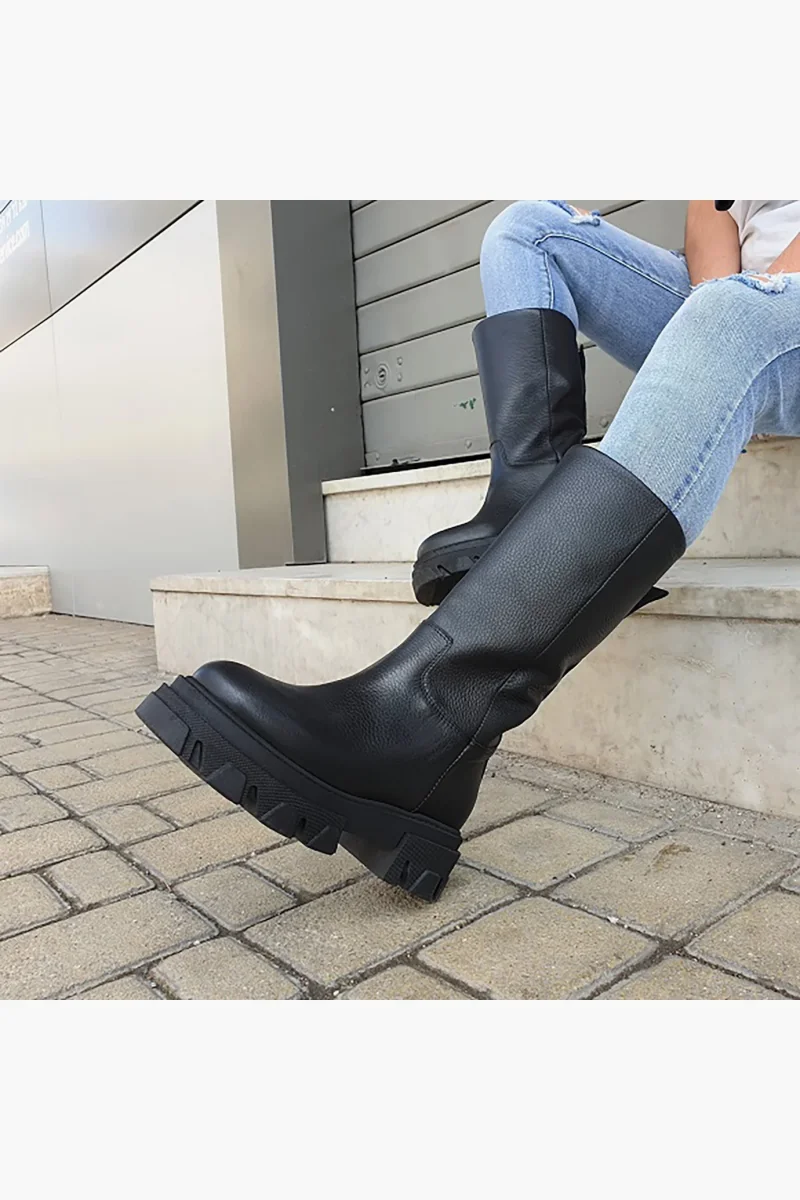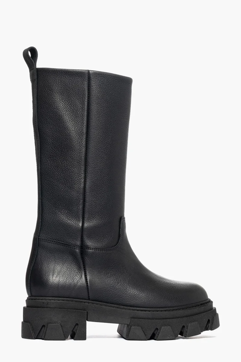 Stivali al polpaccio in pelle bottalato nero, appartenente alla collezione Wake, interni e sottopiede in similpelle, suola in gomma nera, altezza 5 cm. Calzano comode, in caso di mezzo numero è consigliabile non prendere un numero in più. Calzature realizzate artigianalmente, rigorosamente made in Italy.