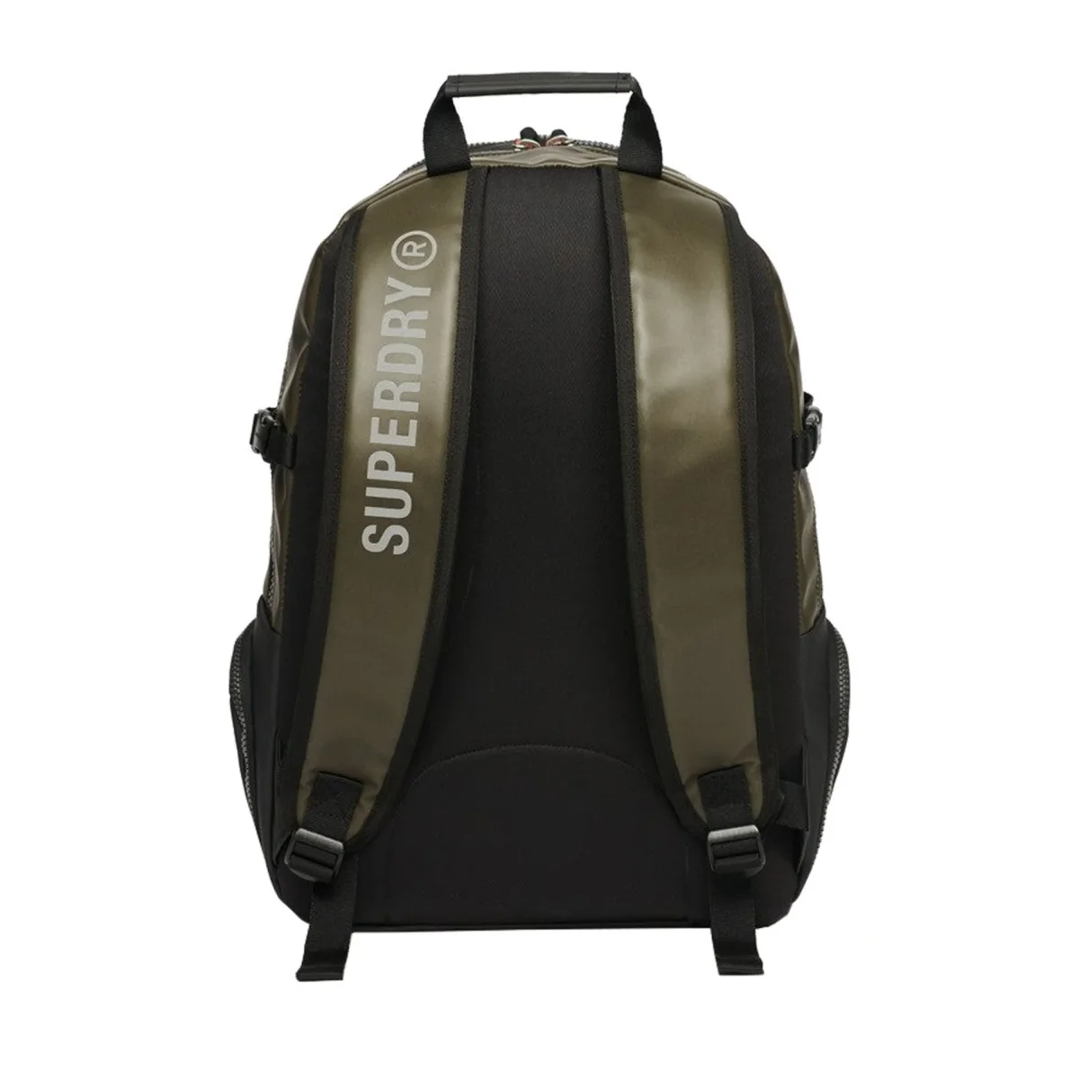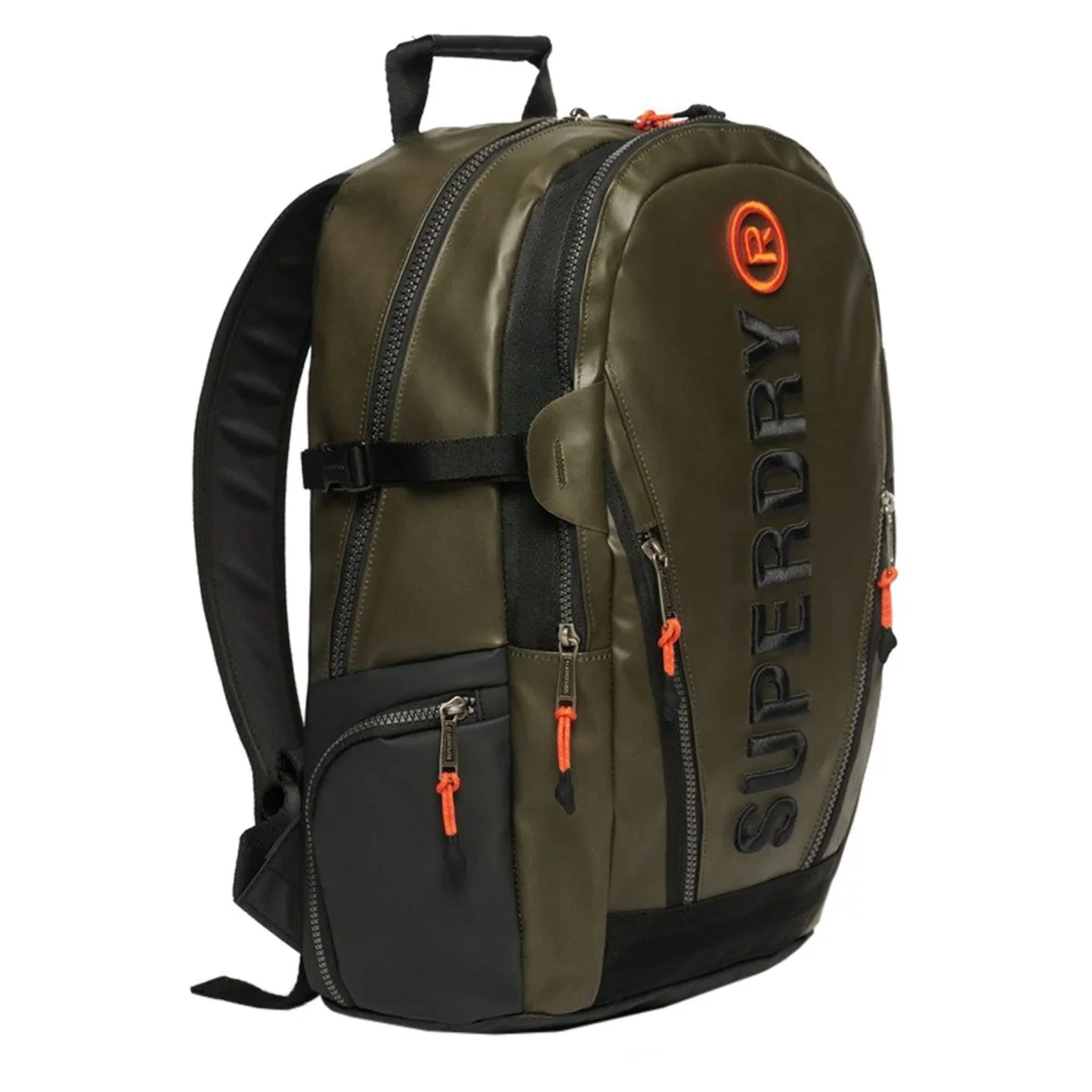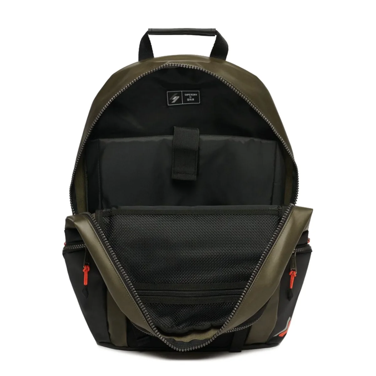 Manico superiore, Scomparto principale con cerniera con custodia imbottita per laptop integrata, Tasca portaoggetti in rete con cerniera integrata, Scomparto secondario con cerniera con tasche portaoggetti integrate, Tasca anteriore con doppia cerniera, Tasche laterali con cerniera, Spallacci regolabili imbottiti e ventilati, Pannello posteriore imbottito e ventilato, Base rinforzata, Logo Superdry ricamato sul davanti