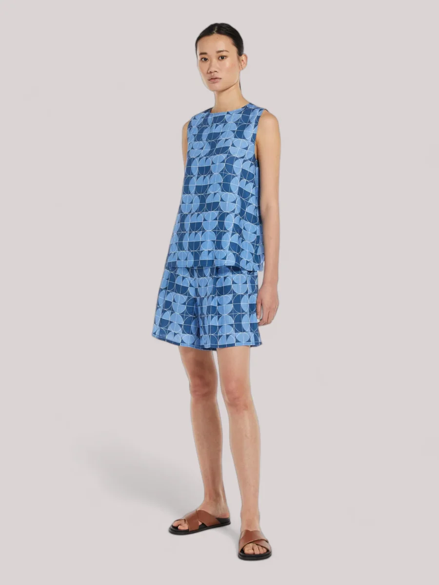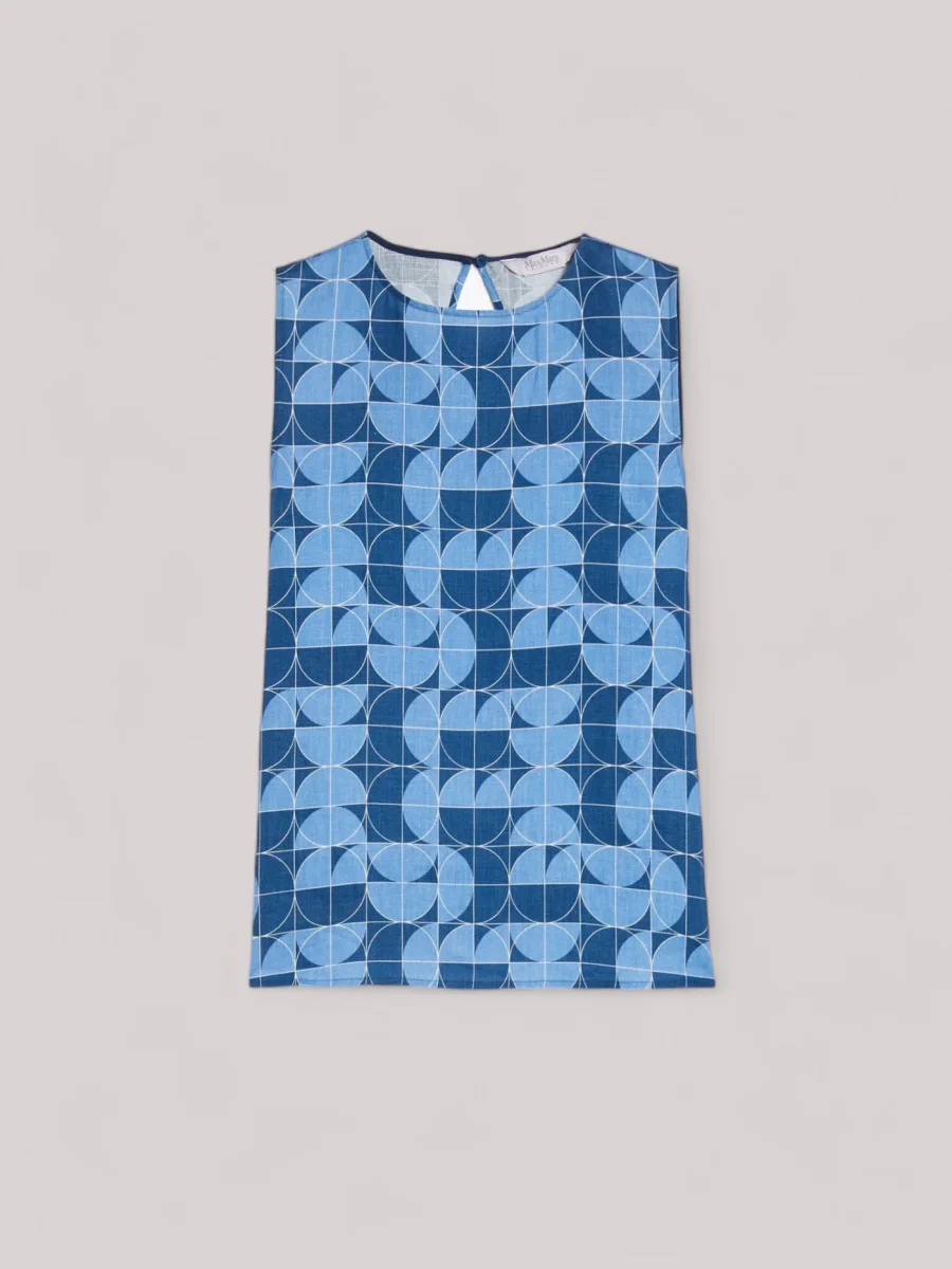 Top smanicato dalla linea svasata A-line, realizzato in leggero tessuto di puro lino stampato. Il modello si chiude con motivo a goccia con piccolo bottone sul retro.