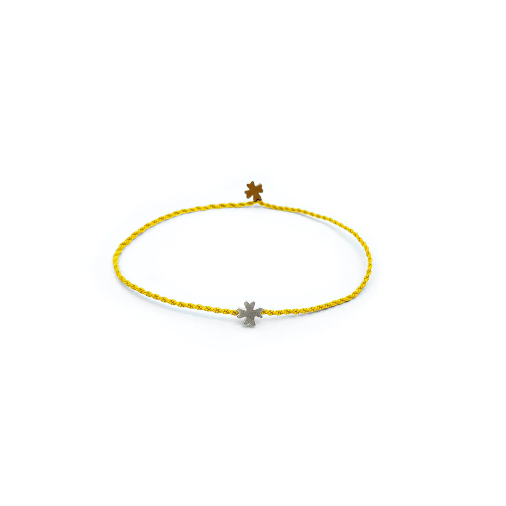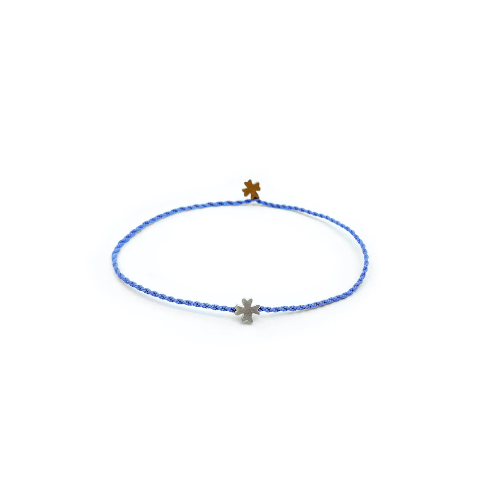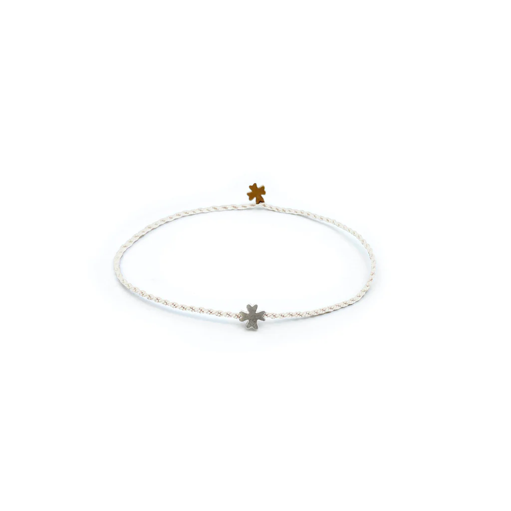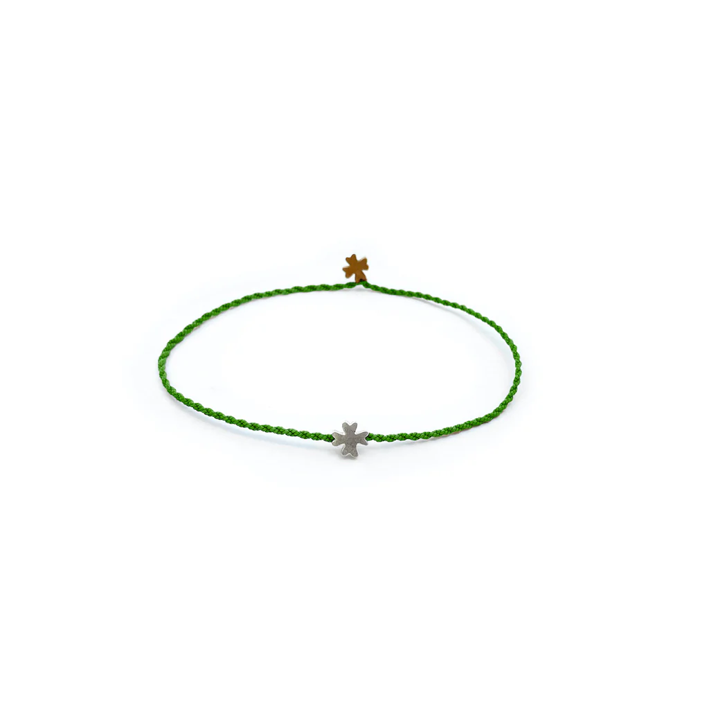 Questo braccialetto è stato pensato e realizzato dalla Galleria Spigolo, ispirandosi al mare Egeo, alla vita marina, all’intreccio delle corde dei pescatori e agli elementi immutabili della natura. Non ci sono nodi non ci sono chiusure, la corda si attorciglia semplicemente su se stessa bloccando uno dei due elementi. Realizzato in filo di cotone e quattro possibilità di abbinamento di metalli, resiste all’acqua senza perdere colore e senza alterarsi. Il bracciale personalizzabile Trifili è caratterizzato dagli elementi decorativi a forma di trifoglio.