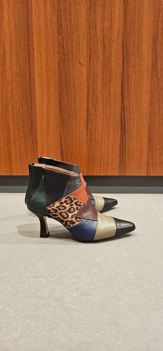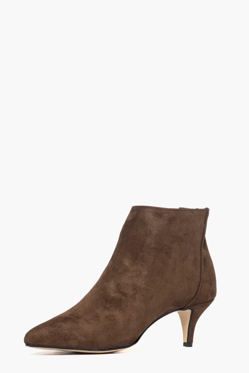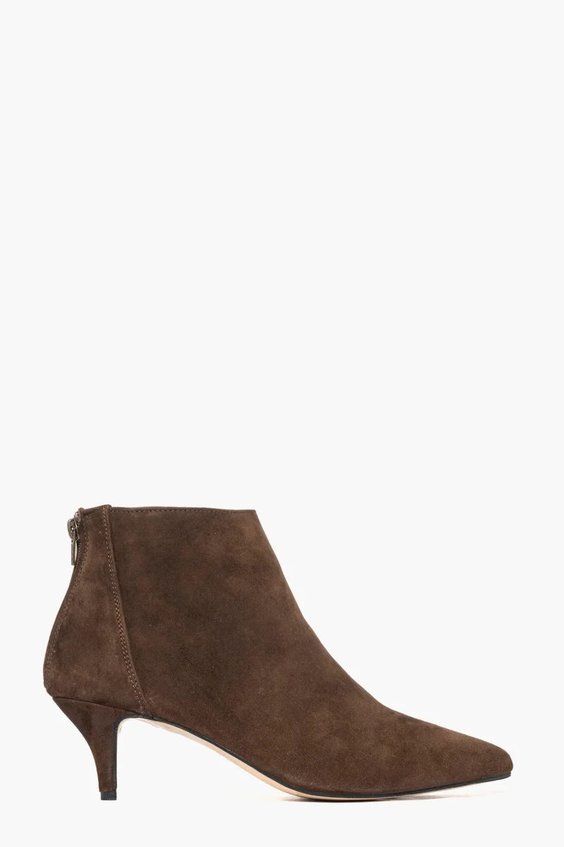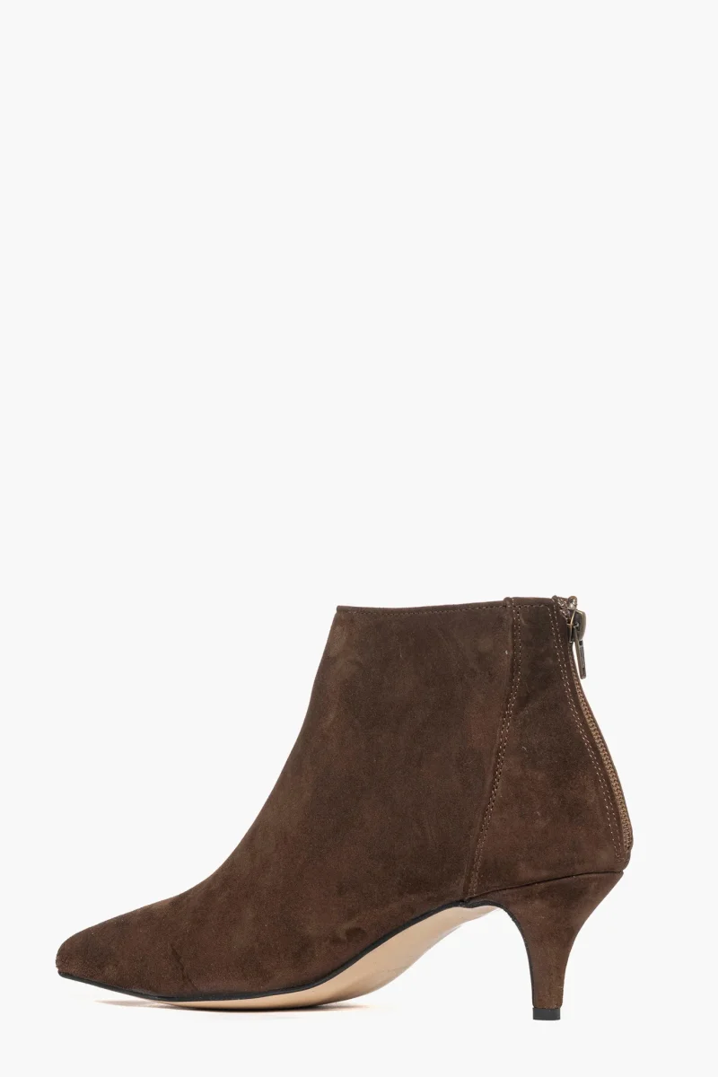 Tronchetti in camoscio marrone, tacco rivestito, altezza 6, cerniera nella parte posteriore, li rende più accollati alla caviglia, spazzolato, interni e sottopiede in similpelle. Calzano giusti, punta stretta. Calzature realizzate in modo artigianale, rigorosamente Made in Italy.
