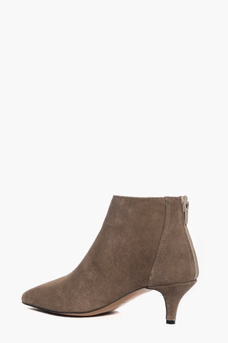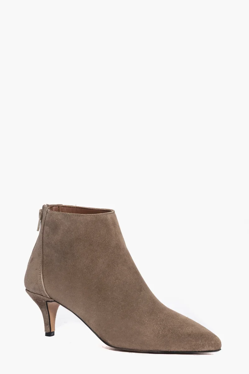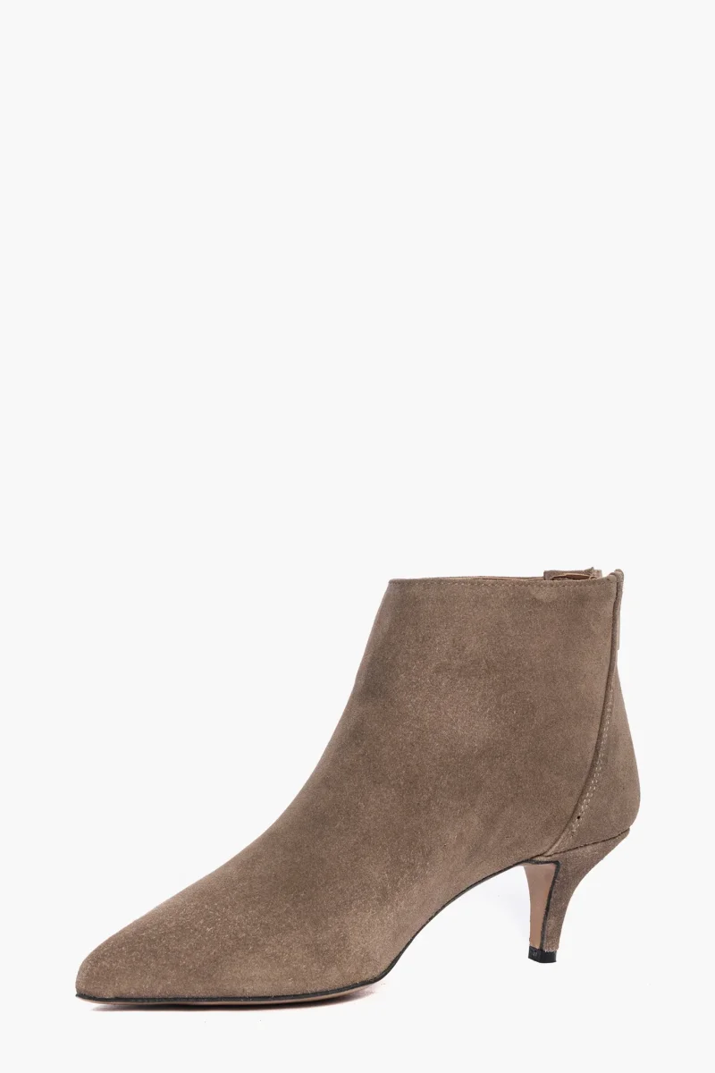 Tronchetti in camoscio spazzolato taupe, cerniera nella parte posteriore, accollati alla caviglia. Tacco rivestito in camoscio taupe, altezza 6 cm. Interni e sottopiede in similpelle. Calzata giusta, punta stretta. Calzature realizzate in modo artigianale, rigorosamente Made in Italy.
