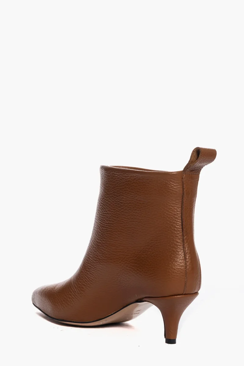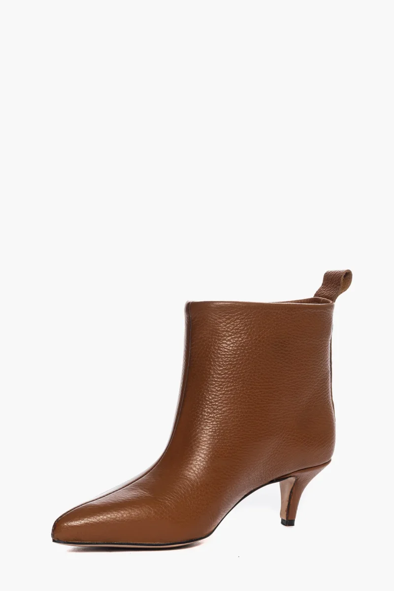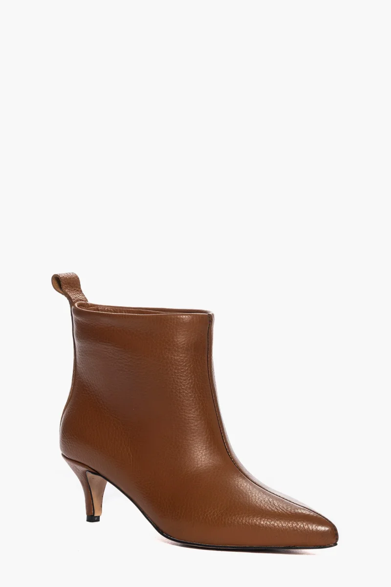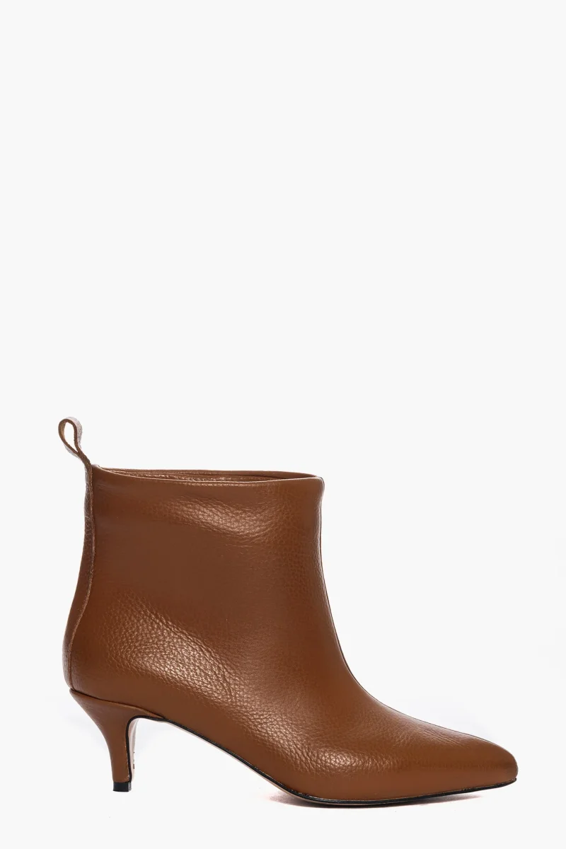 Stivaletti sopra alla caviglia in pelle bottolato cuoio, interni e sottopiede in similpelle. Tacco 6 cm, rivestito in pelle bottolato cuoio. Calzata regolare, punta stretta. Calzature realizzate in modo artigianale, rigorosamente Made in Italy.