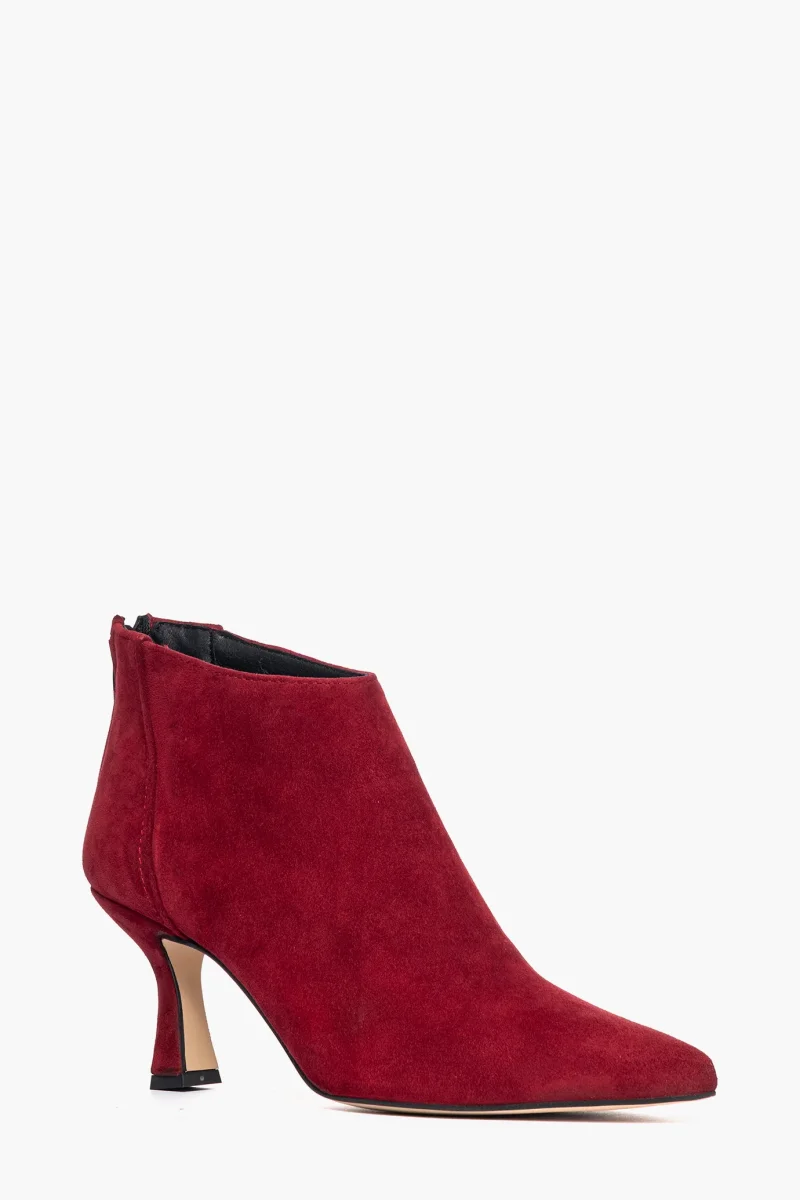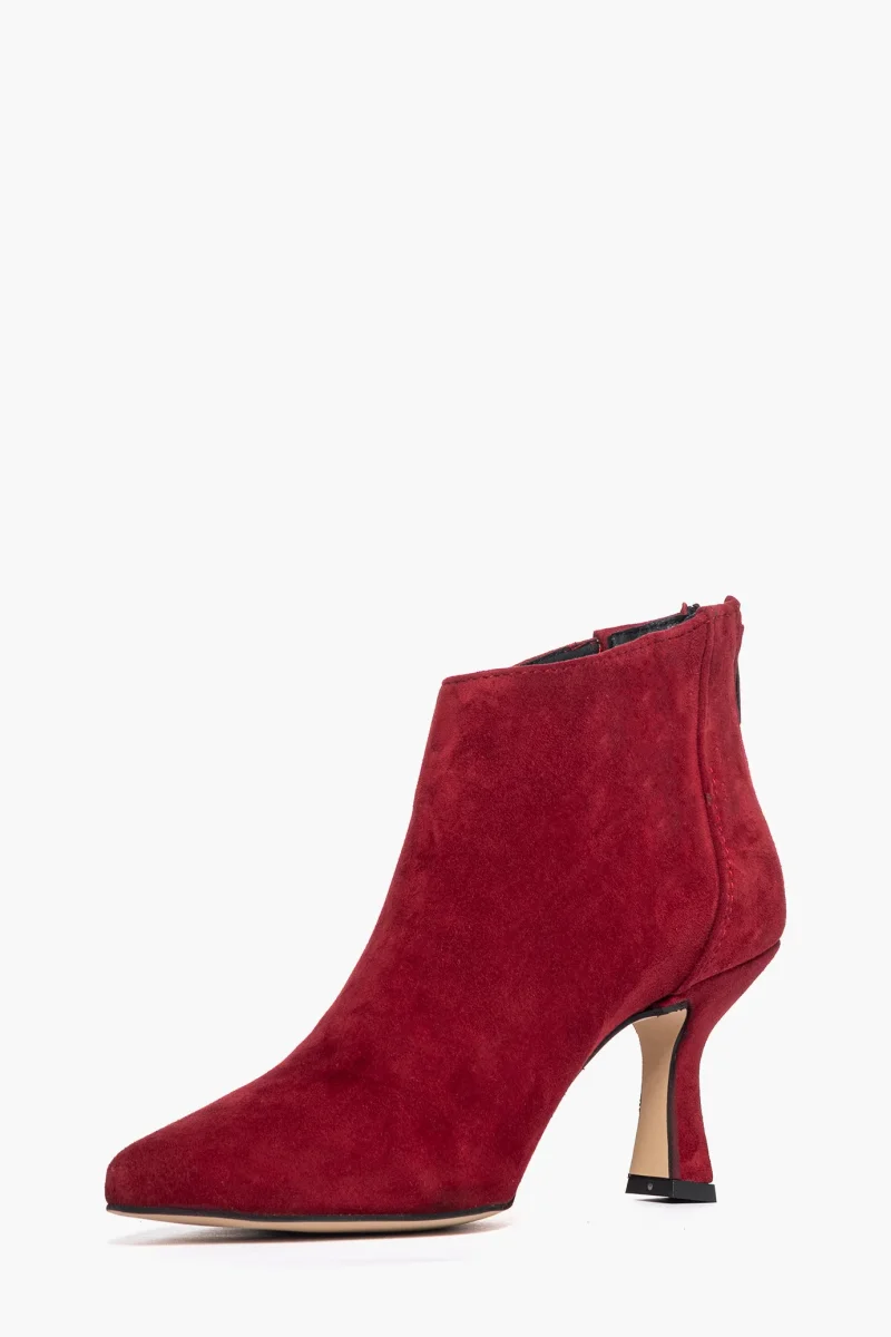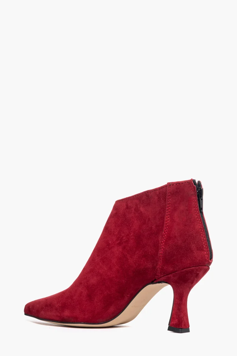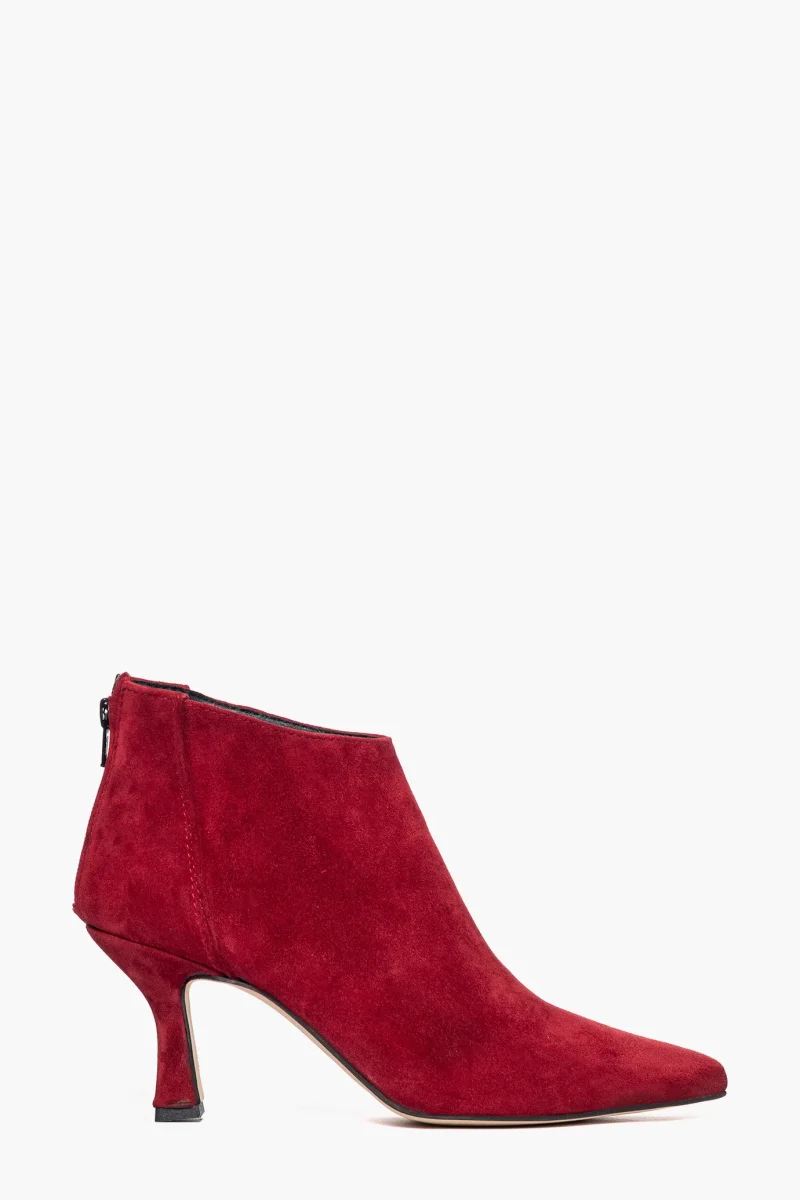 Tronchetti in camoscio rosso scuro con zip, interni e sottopiede in similpelle, tacco rivestito, altezza 8 cm. Calzata regolare, punta leggermente stretta in avanti. Calzature realizzate in modo artigianale, rigorosamente Made in Italy.