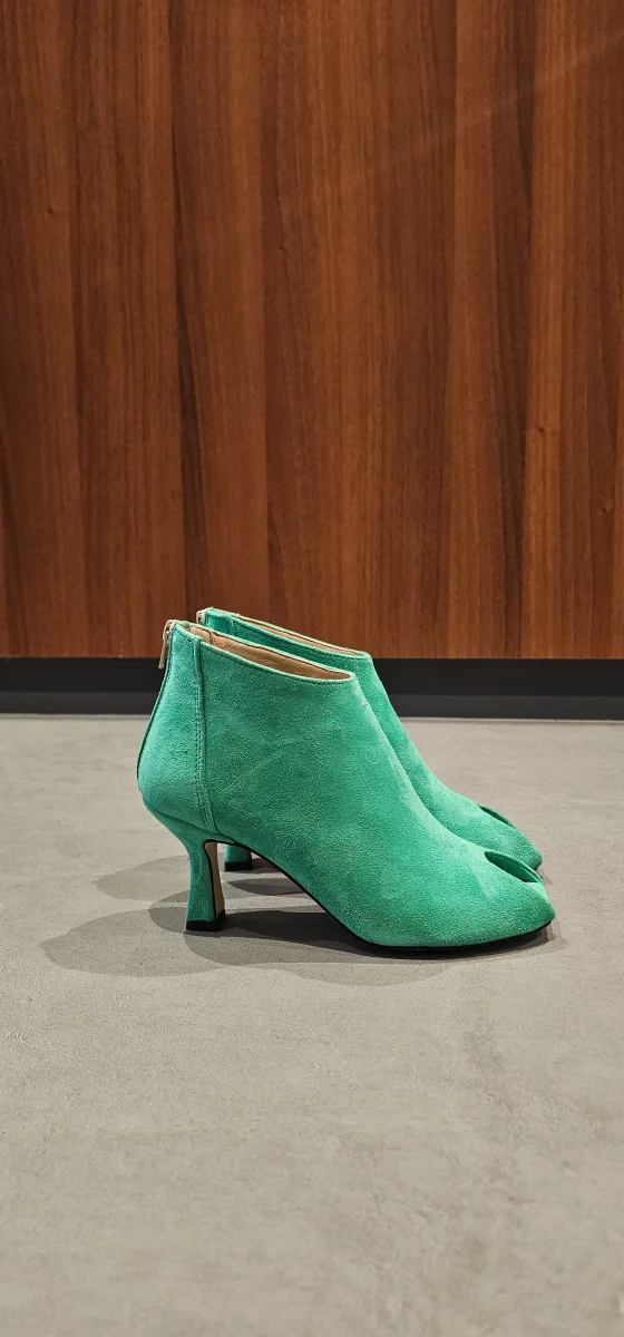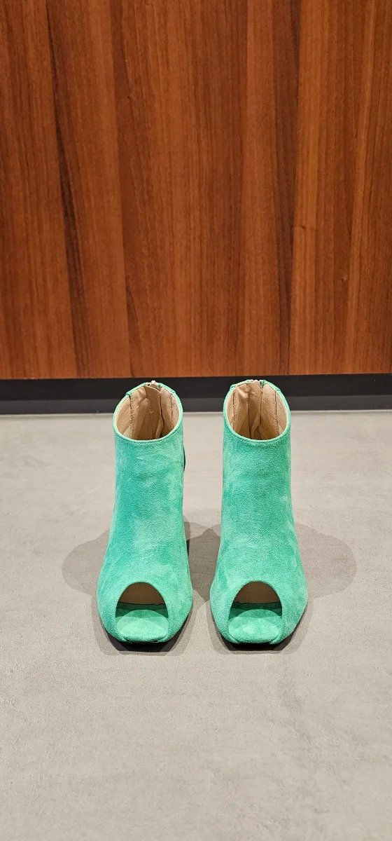 Tronchetti in camoscio verde chiaro spuntato, della linea Love, tacco rivestito, 8.5, interni in similpelle, con zip. Calzano regolari, calzature artigianali, Made in Italy.