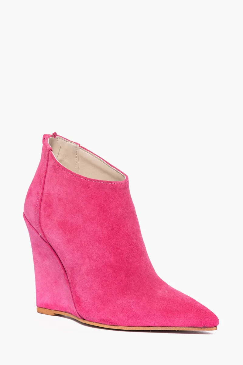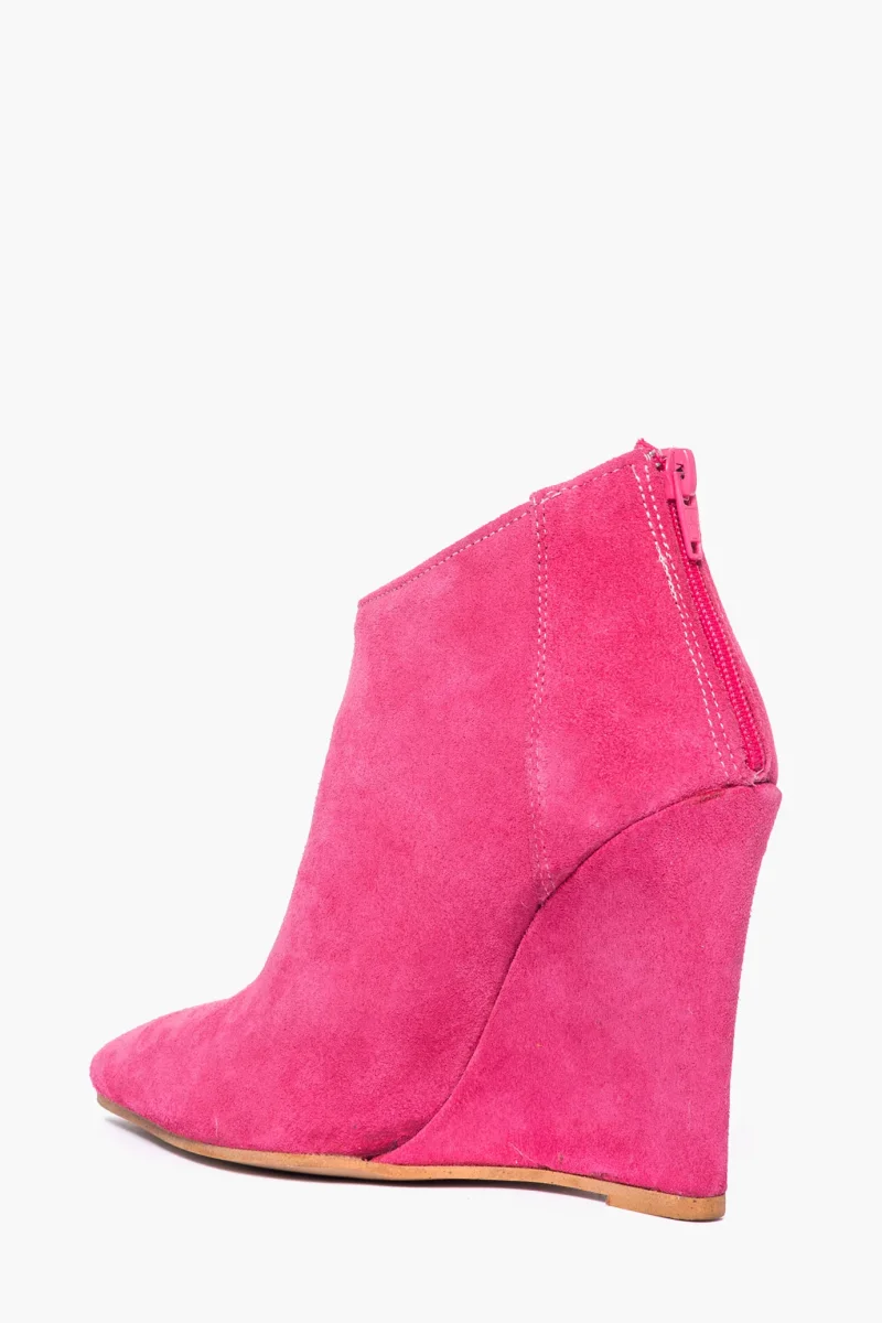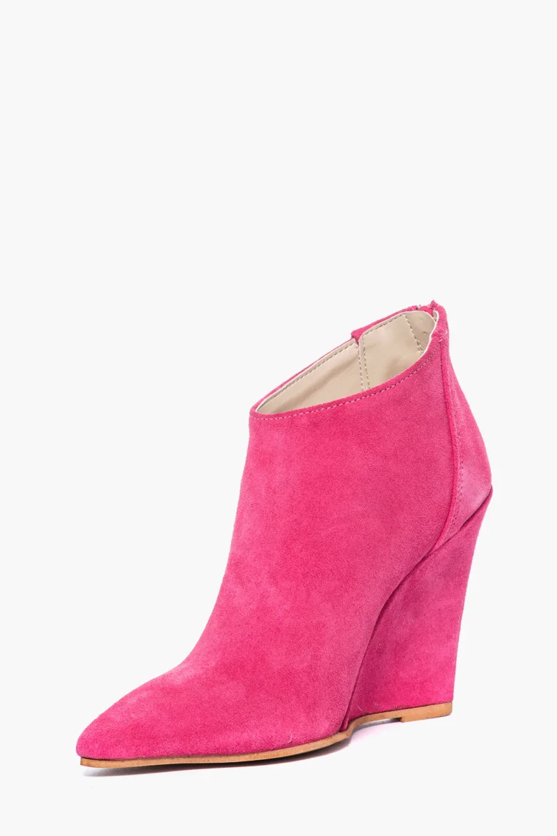 Tronchetti in camoscio fucsia, con cerniera, interni e sottopiede in similpelle, zeppa rivestita, altezza 11 cm. Calzata regolare, punta stretta in avanti. Calzature realizzate in modo artigianale, rigorosamente Made in Italy.