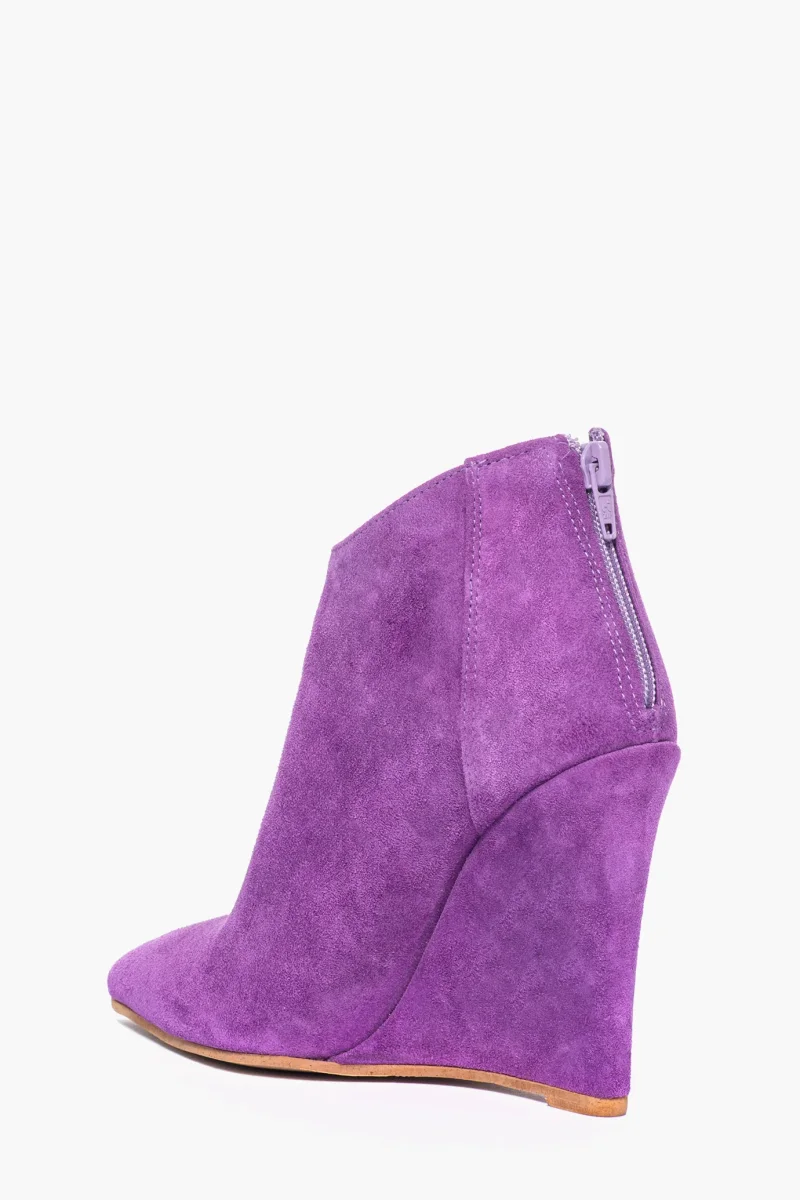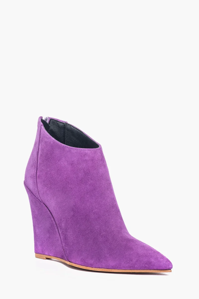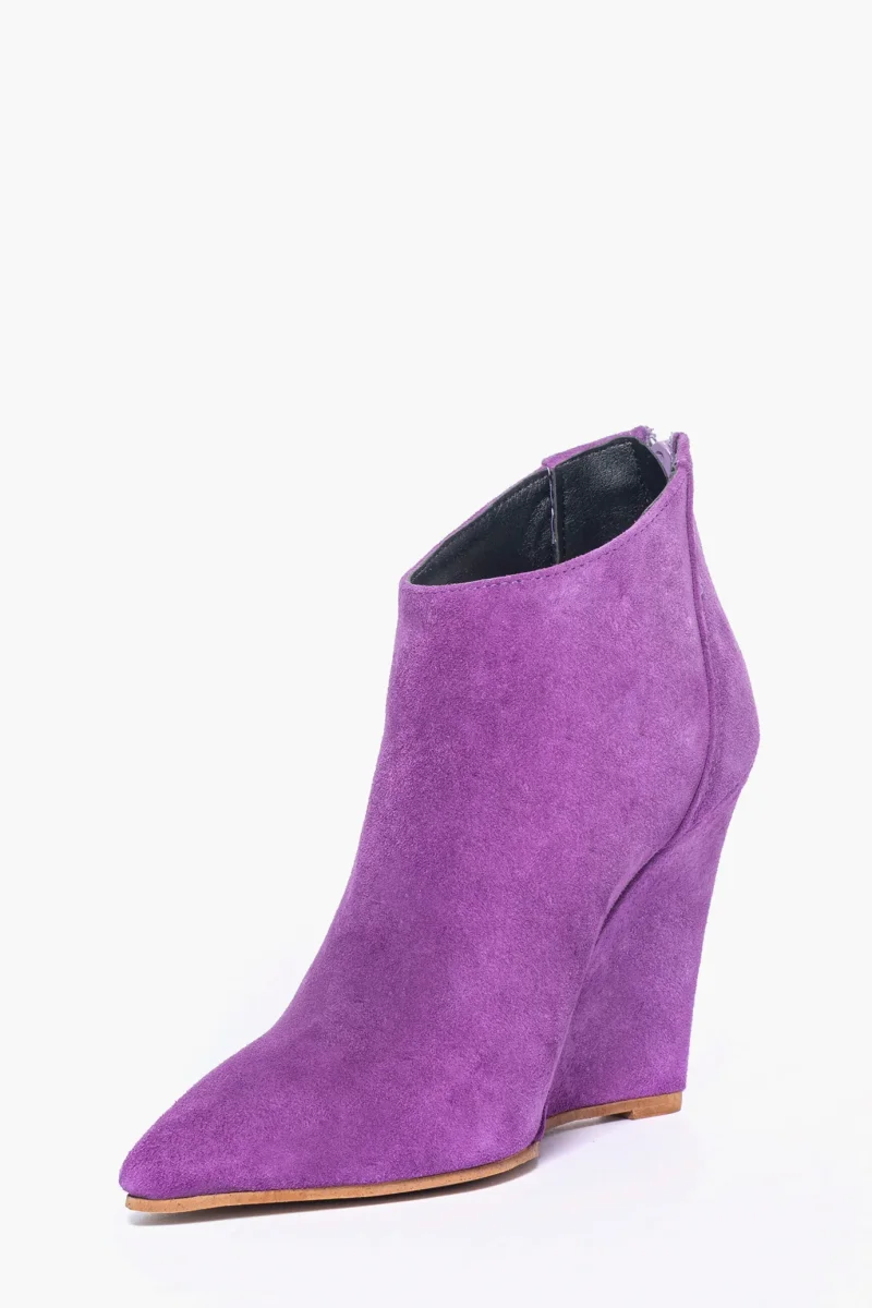 Tronchetti in camoscio viola, con cerniera, interni e sottopiede in similpelle, zeppa rivestita, altezza 11 cm. Calzata regolare, punta stretta in avanti. Calzature realizzate in modo artigianale, rigorosamente Made in Italy.