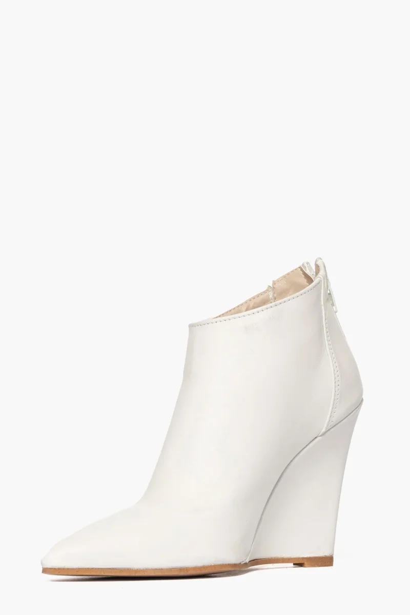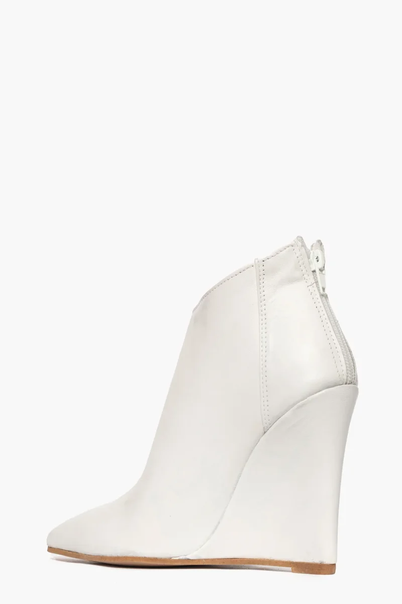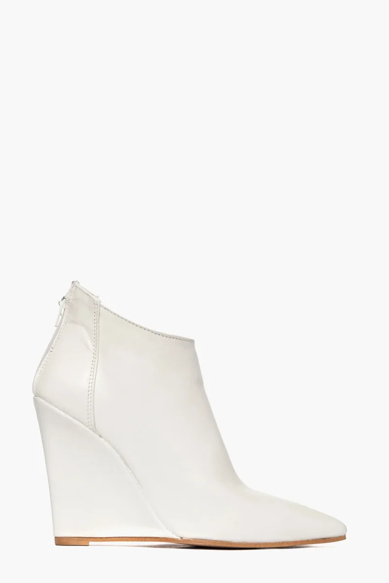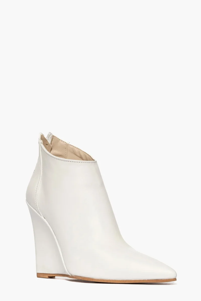 Tronchetti in pelle bianco, con cerniera, interni e sottopiede in similpelle, zeppa rivestita, altezza 11 cm. Calzata regolare, punta stretta in avanti. Calzature realizzate in modo artigianale, rigorosamente Made in Italy.