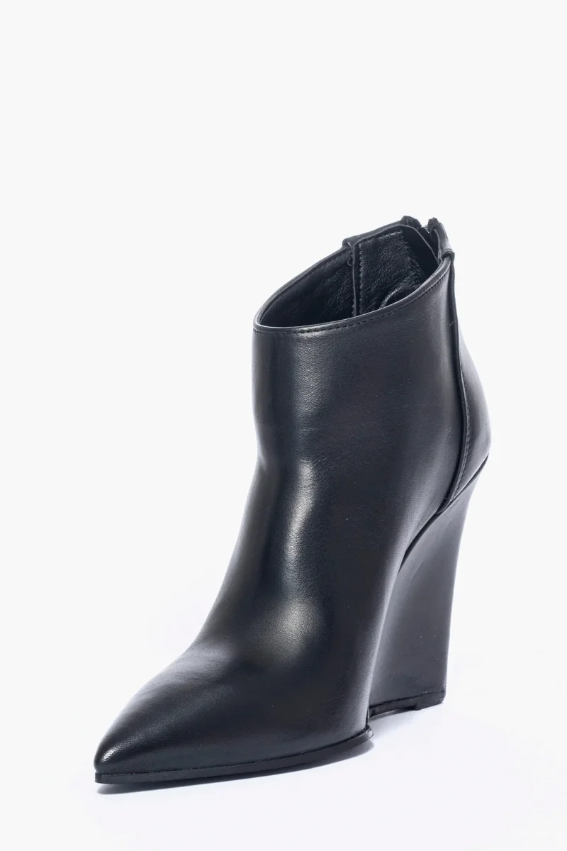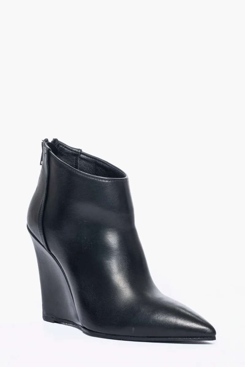 Tronchetti in pelle nero, con cerniera, interni e sottopiede in similpelle, zeppa rivestita, altezza 11 cm. Calzata regolare, punta stretta in avanti. Calzature realizzate in modo artigianale, rigorosamente Made in Italy.