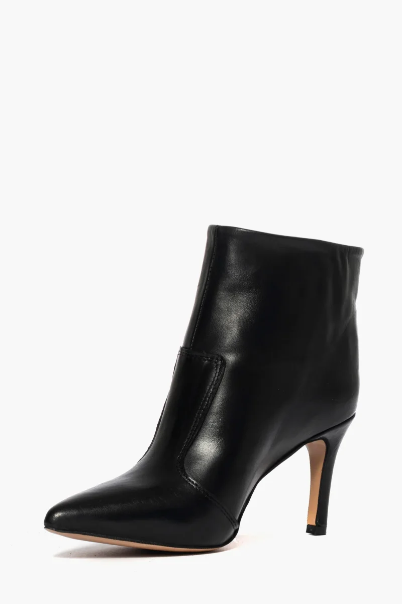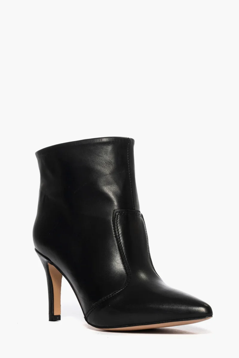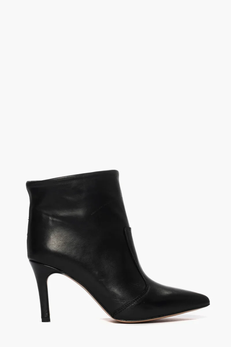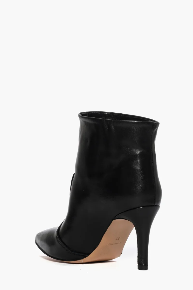 Tronchetti in pelle nera, tacco rivestito in pelle nero, altezza 8 cm. Interni e sottopiede in similpelle. Calzata regolare, punta stretta. Calzature realizzate artigianalmente, rigorosamente Made in Italy.