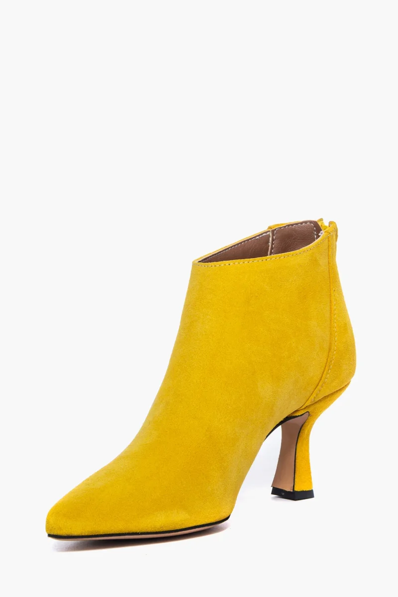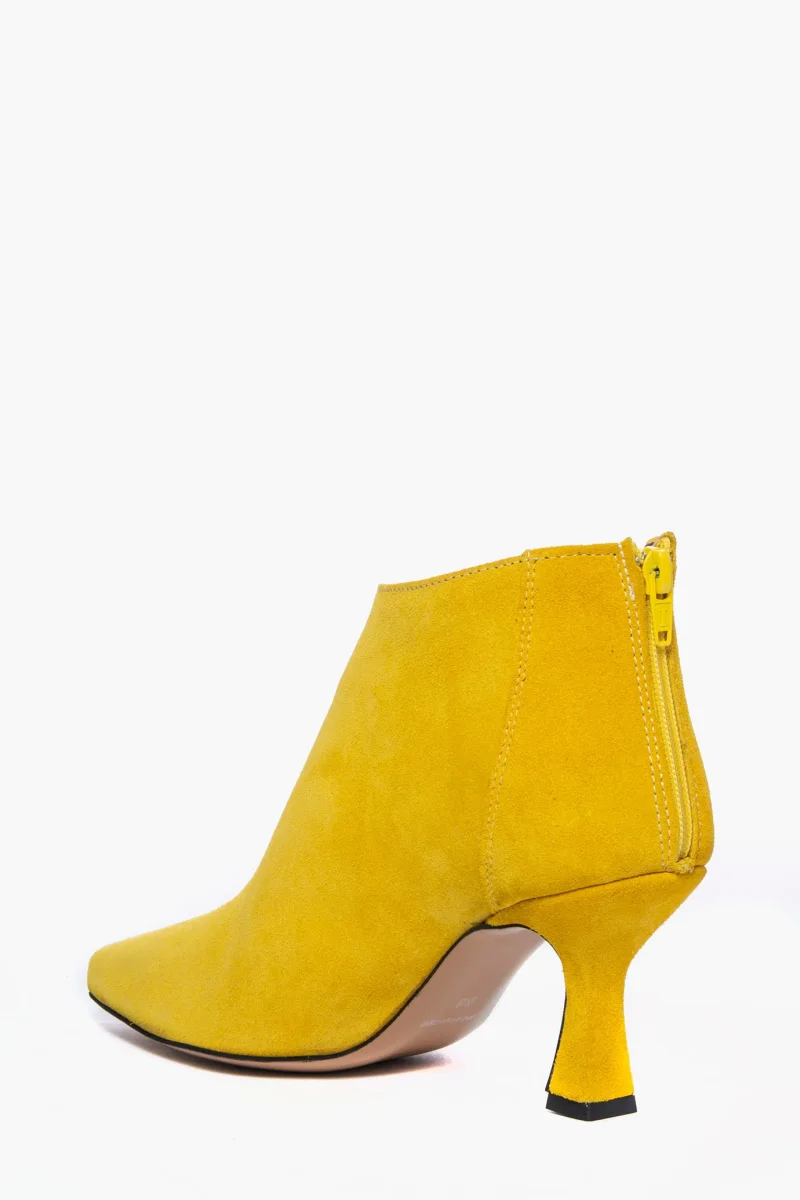 Tronchetti in camoscio giallo con zip, interni e sottopiede in similpelle, tacco rivestito in camoscio, altezza 8 cm. Calzata regolare, punta leggermente stretta in avanti. Calzature realizzate in modo artigianale, rigorosamente Made in Italy.