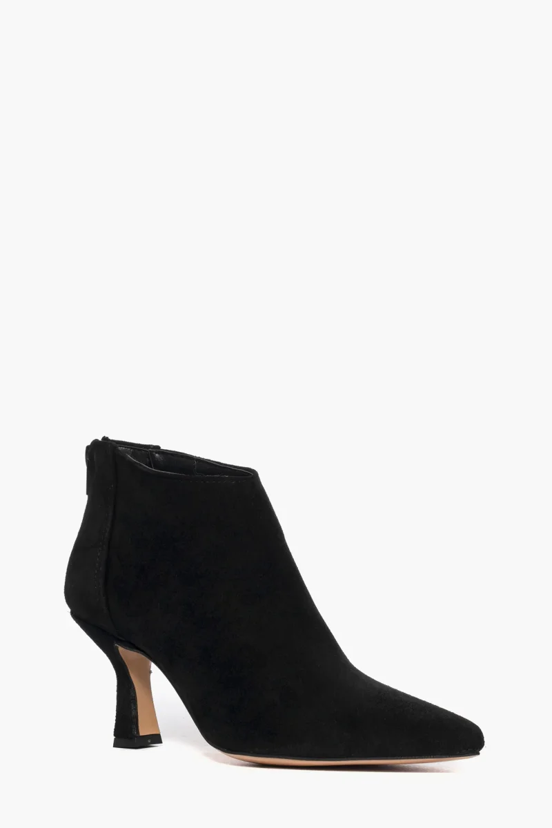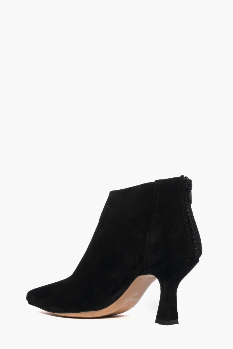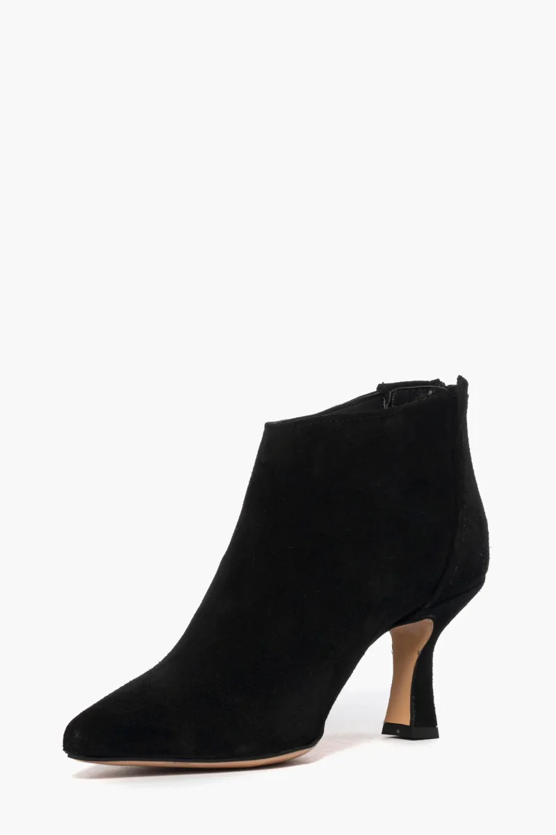 Tronchetti in camoscio nero con zip, interni e sottopiede in similpelle, tacco rivestito in camoscio, altezza 8 cm. Calzata regolare, punta leggermente stretta in avanti. Calzature realizzate in modo artigianale, rigorosamente Made in Italy.